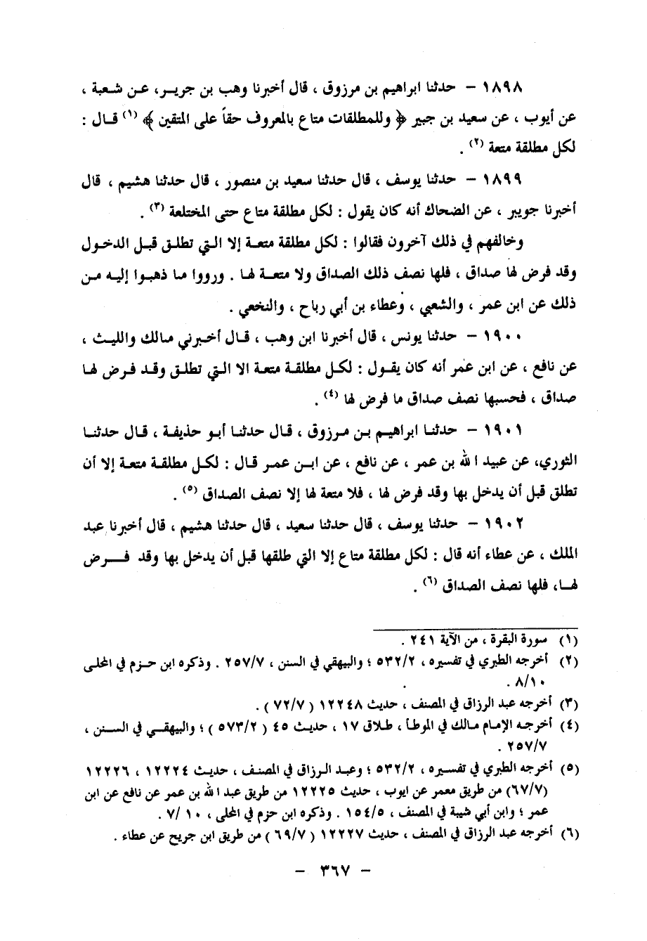 1898 - حَدَّثَنَا إِبْرَاهِيمُ بْنُ مَرْزُوقٍ، قَالَ: أَخْبَرَنَا وَهْبُ بْنُ جَرِيرٍ، عَنْ شُعْبَةَ، عَنْ أَيُّوبَ، عَنْ سَعِيدِ بْنِ جُبَيْرٍ، " {وَلِلْمُطَلَّقَاتِ مَتَاعٌ بِالْمَعْرُوفِ حَقًّا عَلَى الْمُتَّقِينَ} ، قَالَ: لِكُلِّ مُطَلَّقَةٍ مُتْعَةٌ "