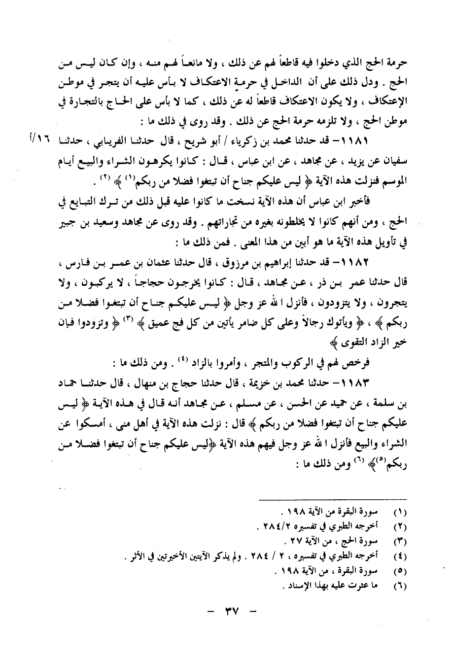 1181 - قَدْ حَدَّثَنَا مُحَمَّدُ بْنُ زَكَرِيَّاءَ أَبُو شُرَيْحٍ، قَالَ: حَدَّثَنَا الْفِرْيَابِيُّ، حَدَّثَنَا سُفْيَانُ بْنُ يَزِيدَ، عَنْ مُجَاهِدٍ، عَنِ ابْنِ عَبَّاسٍ، قَالَ: " كَانُوا يَكْرَهُونَ الشِّرَاءَ وَالْبَيْعَ أَيَّامَ الْمَوْسِمِ، فَنَزَلَتْ هَذِهِ الْآيَةُ: {لَيْسَ عَلَيْكُمْ جُنَاحٌ أَنْ تَبْتَغُوا فَضْلا مِنْ رَبِّكُمْ} " فَأَخْبَرَ ابْنُ عَبَّاسٍ أَنَّ هَذِهِ الْآيَةَ نَسَخَتْ مَا كَانُوا عَلَيْهِ قَبْلَ ذَلِكَ مِنْ تَرْكِ التَّبَايُعِ فِي الْحَجِّ، وَمِنْ أَنَّهُمْ كَانُوا لَا يَخْلِطُونَهُ بِغَيْرِهِ مِنْ تِجَارَاتِهِمْ، وَقَدْ رُوِيَ عَنْ مُجَاهِدٍ وَسَعِيدِ بْنِ جُبَيْرٍ فِي تَأْوِيلِ هَذِهِ الْآيَةِ مَا هُوَ أَبْيَنُ مِنْ هَذَا الْمَعْنَى فَمِنْ ذَلِكَ مَا