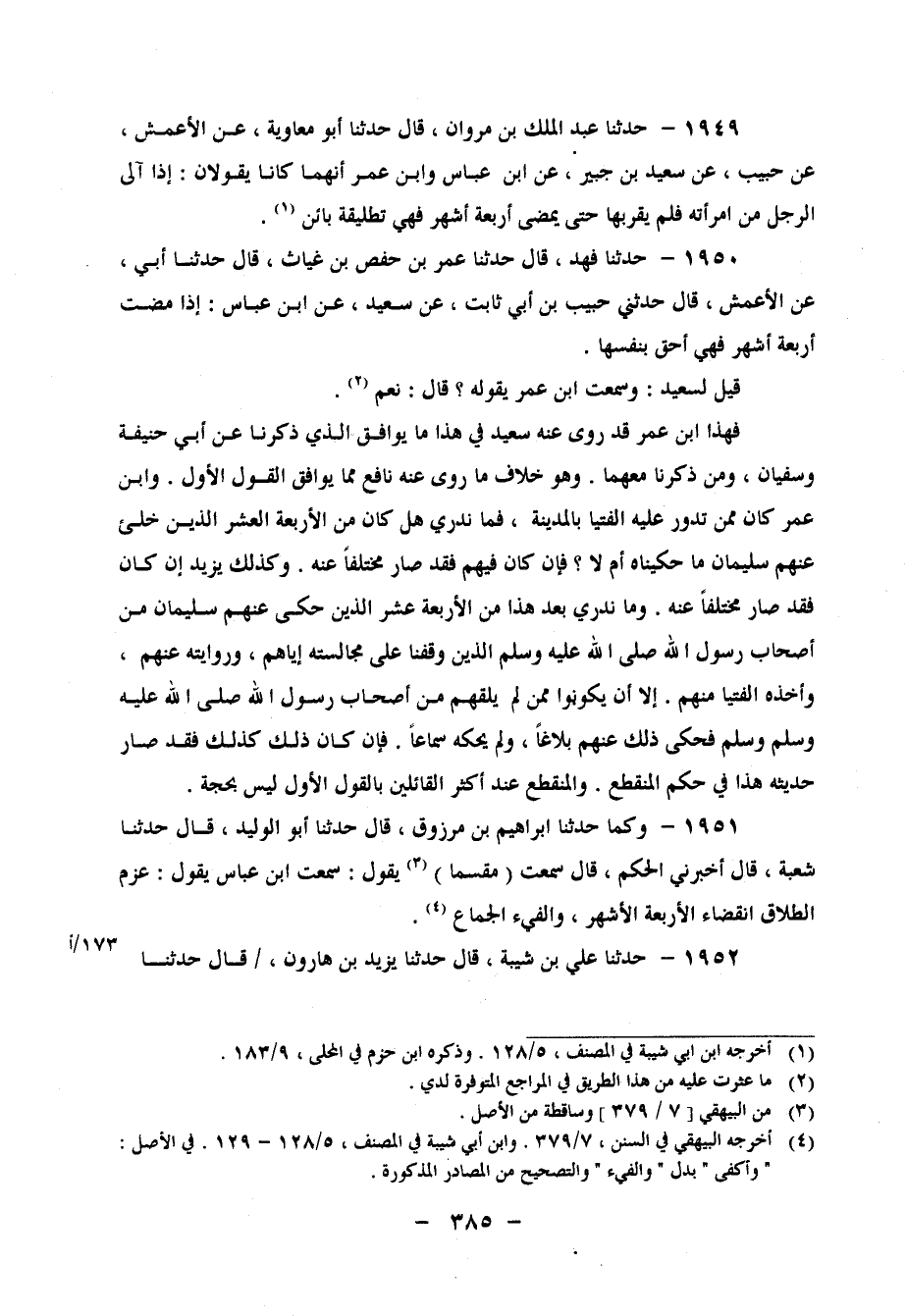 1950 - حَدَّثَنَا فَهْدٌ، قَالَ: حَدَّثَنَا عُمَرُ بْنُ حَفْصِ بْنِ غِيَاثٍ، قَالَ: حَدَّثَنَا أَبِي، عَنِ الأَعْمَشِ، قَالَ: حَدَّثَنِي حَبِيبُ بْنُ أَبِي ثَابِتٍ، عَنْ سَعِيدٍ، عَنِ ابْنِ عَبَّاسٍ، " إِذَا مَضَتْ أَرْبَعَةُ أَشْهُرٍ فَهِيَ أَحَقُّ بِنَفْسِهَا " قِيلَ لِسَعِيدٍ: وَسَمِعْتَ ابْنَ عُمَرَ يَقُولُهُ؟ قَالَ: نَعَمْ فَهَذَا ابْنُ عُمَرَ قَدْ رَوَى عَنْهُ سَعِيدٌ فِي هَذَا مَا يُوَافِقُ الَّذِي ذَكَرْنَا عَنْ أَبِي حَنِيفَةَ، وَسُفْيَانَ، وَمَنْ ذَكَرْنَا مَعَهُمَا، وَهُوَ خِلافُ مَا رَوَى عَنْهُ نَافِعٌ مِمَّا يُوَافِقُ الْقَوْلَ الأَوَّلَ وَابْنُ عُمَرَ كَانَ مِمَّنْ تَدُورُ عَلَيْهِ الْفُتْيَا بِالْمَدِينَةِ، فَمَا نَدْرِي هَلْ كَانَ مِنَ الأَرْبَعَةَ الْعَشَرَ الَّذِينَ حَكَى عَنْهُمْ سُلَيْمَانُ مَا حَكَيْنَاهُ أَمْ لَا؟ فَإِنْ كَانَ فِيهِمْ فَقَدْ صَارَ مُخْتَلَفًا عَنْهُ وَكَذَلِكَ يَزِيدُ، إِنْ كَانَ فَقَدْ صَارَ مُخْتَلَفًا عَنْهُ وَمَا نَدْرِي بَعْدَ هَذَا مَنِ الأَرْبَعَةَ عَشَرَ الَّذِينَ حَكَى عَنْهُمْ سُلَيْمَانُ مِنْ أَصْحَابِ رَسُولِ اللهِ صَلَّى اللَّهُ عَلَيْهِ وَسَلَّمَ الَّذِينَ وَقَفْنَا عَلَى مُجَالَسَتِهِ إِيَّاهُمْ، وَرِوَايَتِهِ عَنْهُمْ، وَأَخْذِهِ الْفُتْيَا مِنْهُمْ، إِلا أَنْ يَكُونُوا مِمَّنْ لَمْ يَلْقَهُمْ مِنْ أَصْحَابِ رَسُولِ اللهِ صَلَّى اللَّهُ عَلَيْهِ وَسَلَّمَ، فَحَكَى ذَلِكَ عَنْهُمْ بَلاغًا، وَلَمْ يَحْكِهِ سَمَاعًا، فَإِنْ كَانَ ذَلِكَ كَذَلِكَ فَقَدْ صَارَ حَدِيثُهُ هَذَا فِي حُكْمِ الْمُنْقَطِعِ، وَالْمُنْقَطِعُ عِنْدَ أَكْثَرِ