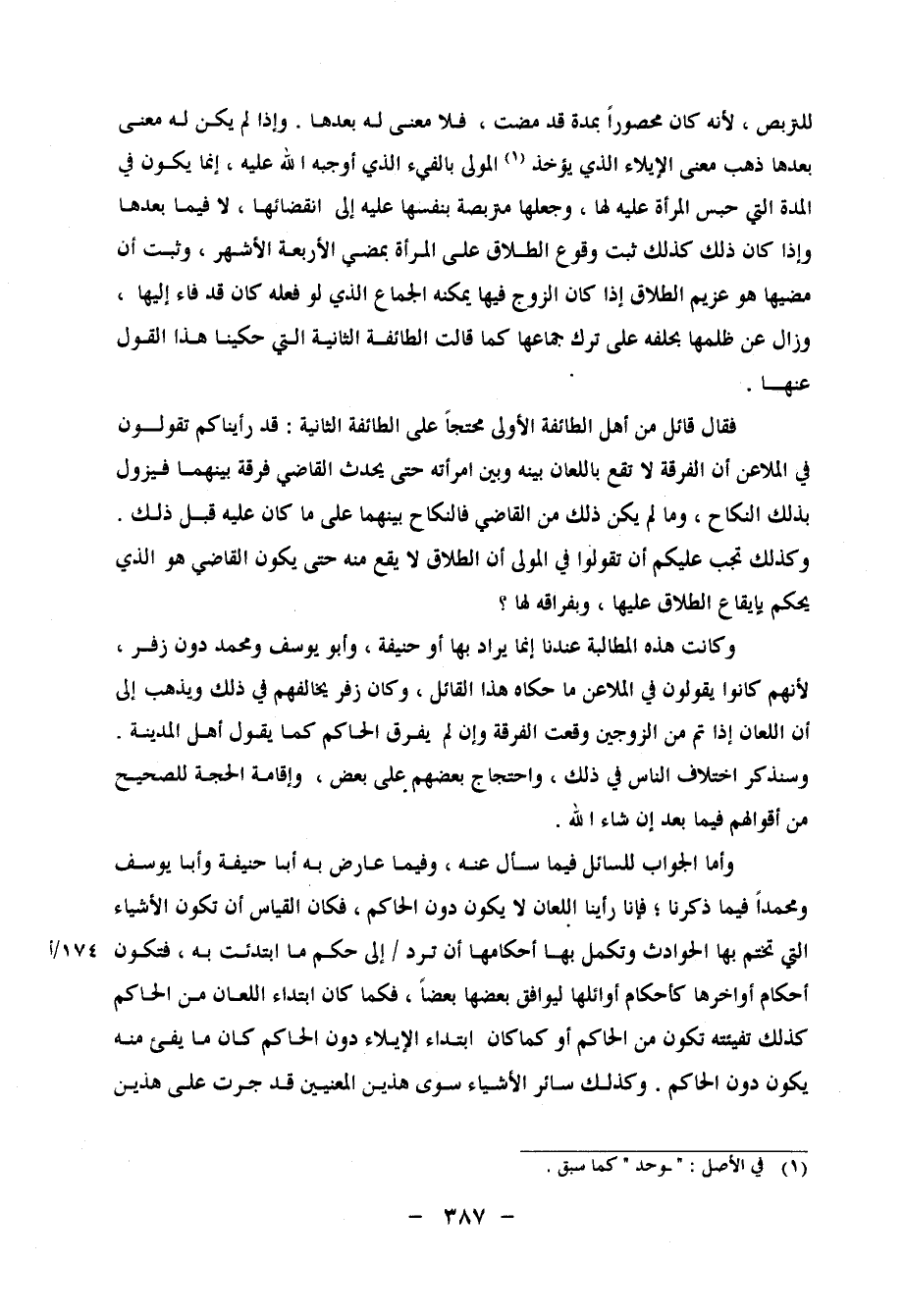 الثَّانِيَةِ: قَدْ رَأَيْنَاكُمْ تَقُولُونَ فِي الْمُلاعِنِ أَنَّ الْفُرْقَةَ لَا تَقَعُ بِاللِّعَانِ بَيْنَهُ وَبَيْنَ امْرَأَتِهِ حَتَّى يُحْدِثَ الْقَاضِي فُرْقَةً بَيْنَهُمَا فَيَزُولُ بِذَلِكَ النِّكَاحُ، وَمَا لَمْ يَكُنْ ذَلِكَ مِنَ الْقَاضِي فَالنِّكَاحُ بَيْنَهُمَا عَلَى مَا كَانَ عَلَيْهِ قَبْلَ ذَلِكَ، وَكَذَلِكَ يَجِبُ عَلَيْكُمْ أَنْ تَقُولُوا فِي الْمُولِي أنَّ الطَّلاقَ لَا يَقَعُ مِنْهُ حَتَّى يَكُونَ الْقَاضِي هُوَ الَّذِي يَحْكُمُ بِإِيقَاعِ الطَّلاقِ عَلَيْهَا، وَبِفِرَاقِهِ لَهَا وَكَانَتْ هَذِهِ الْمُطَالَبَةُ عِنْدَنَا إِنَّما يُرَادُ بِهَا أَبُو حَنِيفَةَ، وَأَبُو يُوسُفَ، وَمُحَمَّدٌ دُونَ زُفَرَ، لأَنَّهُمْ كَانُوا يَقُولُونَ فِي الْمُلاعِنِ مَا حَكَاهُ هَذَا الْقَائِلُ، وَكَانَ زُفَرُ يُخَالِفُهُمْ فِي ذَلِكَ، وَيَذْهَبُ إِلَى أَنَّ اللِّعَانَ إِذَا تَمَّ مِنَ الزَّوْجَيْنِ وَقَعَتِ الْفُرْقَةُ، وَإِنْ لَمْ يُفَرِّقِ الْحَاكِمُ كَمَا يَقُولُ أَهْلُ الْمَدِينَةِ وَسَنَذْكُرُ اخْتِلافَ النَّاسِ فِي ذَلِكَ، وَاحْتِجَاجَ بَعْضِهِمْ عَلَى بَعْضٍ، وَإِقَامَةَ الْحُجَّةِ لِلصَّحِيحِ مِنْ أَقْوَالِهِمْ فِيهَا بَعْدُ إِنْ شَاءَ اللهُ وَأَمَّا الْجَوَّابُ لِلسَّائِلِ فِيمَا سَأَلَ عَنْهُ، وَفِيمَا عَارَضَ بِهِ أَبَا حَنِيفَةَ، وَأَبَا يُوسُفَ، وَمُحَمَّدًا فِيمَا ذَكَرْنَا، فَإِنَّا رَأَيْنَا اللِّعَانَ لَا يَكُونُ دُونَ الْحَاكِمِ، فَكَانَ الْقِيَاسُ أَنْ تَكُونَ الأَشْيَاءُ الَّتِي تُخْتَمُ بِهَا الْحَوَادِثُ، وَتُكَمَّلُ بِهَا أَحْكَامُهَا، أَنْ تُرَدَّ إِلَى حُكْمِ مَا ابْتُدِئَتْ بِهِ، فَتَكُونُ أَحْكَامُ أَوَاخِرِهَا كَأَحْكَامِ أَوَائِلِهَا لِيُوَافِقَ بَعْضُهَا بَعْضًا، فَكَمَا كَانَ ابْتِدَاءُ اللِّعَانِ مِنَ الْحَاكِمِ كَذَلِكَ تَفْيِئَتُهُ تَكُونُ مِنَ الْحَاكِمِ، أَوْ كَمَا كَانَ ابْتِدَاءُ الإِيلاءِ دُونَ الْحَاكِمِ كَانَ مَا يَفِيءُ مِنْهُ يَكُونُ دُونَ الْحَاكِمِ وَكَذَلِكَ سَائِرُ الأَشْيَاءِ سِوَى هَذَيْنِ الْمَعْنَيَيْنِ قَدْ جَرَتْ عَلَى هَذَيْنِ