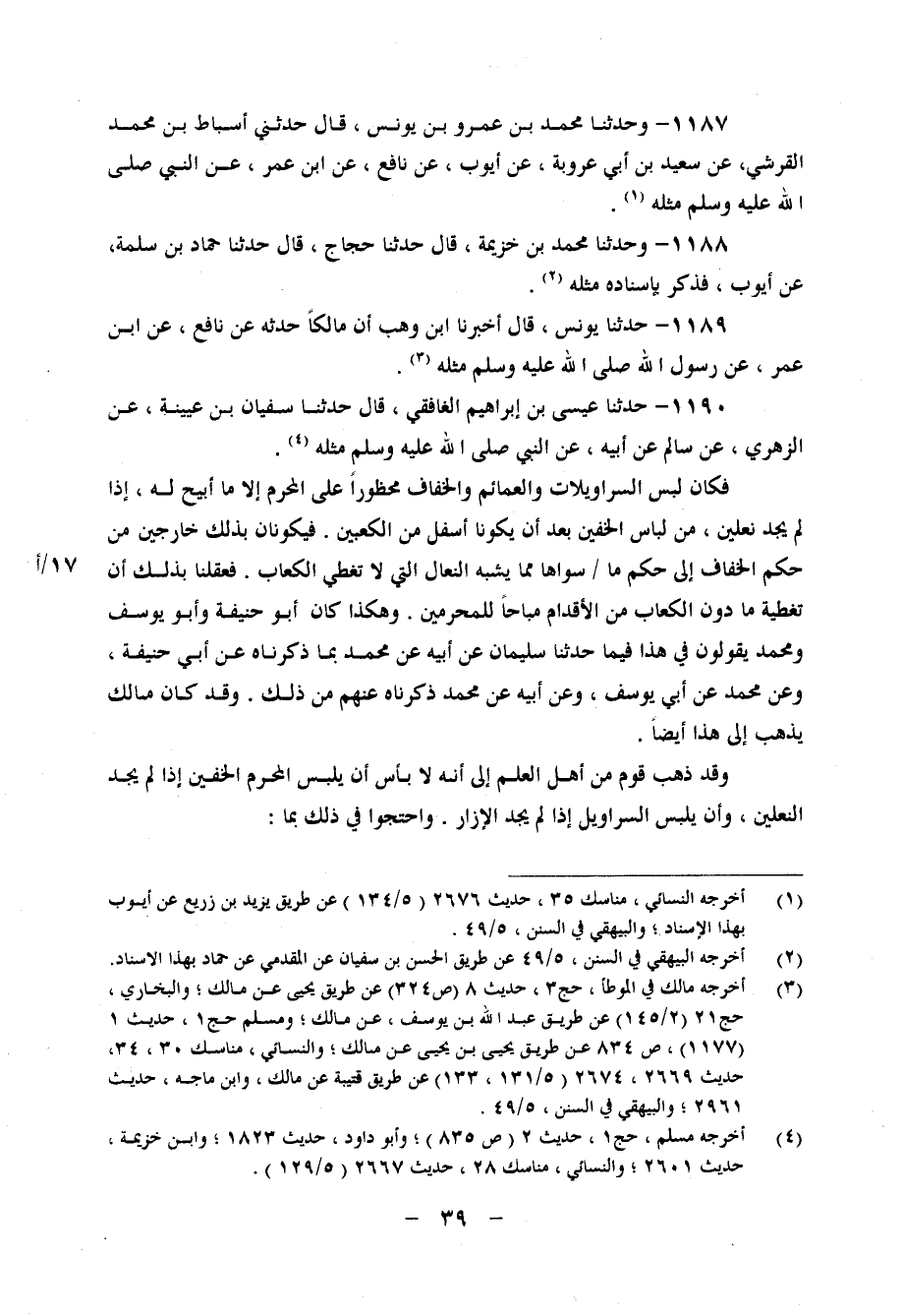 1190 - حَدَّثَنَا عِيسَى بْنُ إِبْرَاهِيمَ الْغَافِقِيُّ، قَالَ: حَدَّثَنَا سُفْيَانُ بْنُ عُيَيْنَةَ، عَنِ الزُّهْرِيِّ، عَنْ سَالِمٍ، عَنْ أَبِيهِ، عَنِ النَّبِيِّ صَلَّى اللَّهُ عَلَيْهِ وَسَلَّمَ، مِثْلَهُ فَكَانَ لَبْسُ السَّرَاوِيلَاتِ وَالْعَمَائِمِ وَالْخِفَافِ مَحْظُورًا عَلَى الْمُحْرِمِ إِلَّا مَا أَبِيحَ لَهُ، إِذَا لَمْ يَجِدْ نَعْلَيْنِ، مِنْ لِبَاسِ الْخُفَّيْنِ بَعْدَ أَنْ يَكُونَا أَسْفَلَ مِنَ الْكَعْبَيْنِ، فَيَكُونَانِ بِذَلِكَ خَارِجَيْنِ مِنْ حُكْمِ الْخِفَافِ إِلَى حُكْمِ مَا سِوَاهَا مِمَّا يُشْبِهُ النِّعَالَ الَّتِي لَا تُغَطِّي الْكِعَابَ، فَعَقَلْنَا بِذَلِكَ أَنَّ تَغْطِيَةَ مَا