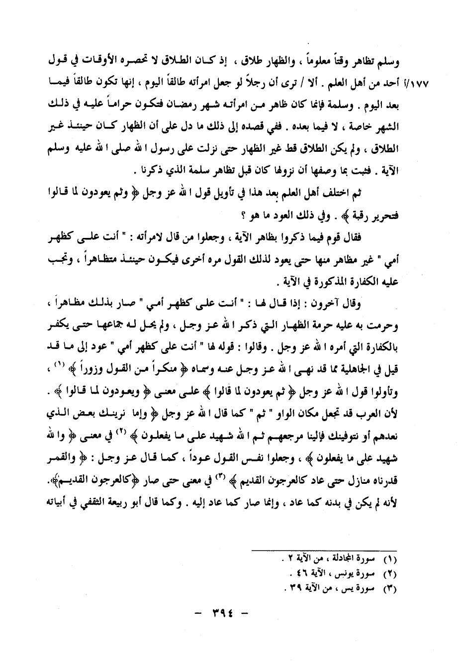 وَسلم تَظَاهَرَ وَقْتًا مَعْلُومًا، وَالظِّهَارُ طَلاقٌ، إِذْ كَانَ الطَّلاقُ لَا تَحْصُرُهُ الأَوْقَاتُ فِي قَوْلِ أَحَدٍ مِنْ أَهْلِ الْعِلْمِ، أَلا تَرَى أَنَّ رَجُلا لَوْ جَعَلَ امْرَأَتَهُ طَالِقًا الْيَوْمَ، إِنَّها تَكُونُ طَالِقًا فِيمَا بَعْدَ الْيَوْمِ وَسَلَمَةُ فَإِنَّمَا كَانَ ظَاهَرَ مِنَ امْرَأَتِهِ شَهْرَ رَمَضَانَ فَتَكُونُ حَرَامًا عَلَيْهِ فِي ذَلِكَ الشَّهْرِ خَاصَّةً، لَا فِيمَا بَعْدَهُ، فَفِي قَصْدِهِ إِلَى ذَلِكَ مَا دَلَّ عَلَى أَنَّ الظِّهَارَ كَانَ حِينَئِذٍ غَيْرَ الطَّلاقِ، وَلَمْ يَكُنِ الطَّلاقُ قَطُّ غَيْرَ الظِّهَارِ حَتَّى نَزَلَتْ عَلَى رَسُولِ اللهِ صَلَّى اللَّهُ عَلَيْهِ وَسَلَّمَ الآيَةُ، فَثَبَتَ بِمَا وَصَفَهَا أَنَّ نُزُولَهَا كَانَ قَبْلَ تَظَاهُرِ سَلَمَةَ الَّذِي ذَكَرْنَا ثُمَّ اخْتَلَفَ أَهْلُ الْعِلْمِ بَعْدَ هَذَا فِي تَأْوِيلِ قَوْلِ اللهِ عَزَّ وَجَلَّ: {ثُمَّ يَعُودُونَ لِمَا قَالُوا فَتَحْرِيرُ رَقَبَةٍ} ، وَفِي ذَلِكَ الْعَوْدِ مَا هُوَ فَقَالَ قَوْمٌ، فِيمَا ذَكَرُوا، بِظَاهِرِ الآيَةِ، وَجَعَلُوا مَنْ قَالَ لامْرَأَتِهِ: أَنْتِ عَلَيَّ كَظَهْرِ أُمِّي، غَيْرَ مُظَاهِرٍ مِنْهَا حَتَّى يَعُودَ لِذَلِكَ الْقَوْلِ مَرَّةً أُخْرَى فَيَكُونُ حِينَئِذٍ مُتَظَاهِرًا، وَتَجِبُ عَلَيْهِ الْكَفَّارَةُ الْمَذْكُورَةُ فِي الآيَةِ وَقَالَ آخَرُونَ: إِذَا