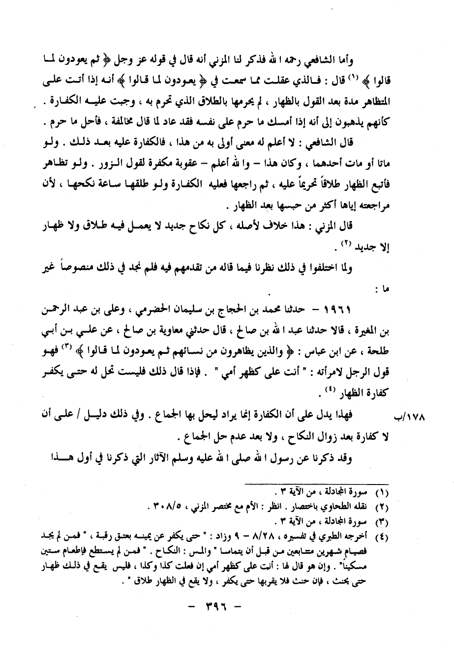 وَأَمَّا الشَّافِعِيُّ رَحِمَهُ اللهُ فَذَكَرَ لَنَا الْمُزَنِيُّ، أَنَّهُ قَالَ فِي قَوْلِهِ عَزَّ وَجَلَّ: {ثُمَّ يَعُودُونَ لِمَا قَالُوا} ، قَالَ: فَالَّذِي عَقَلْتُ مِمَّا سَمِعْتُ فِي: {يَعُودُونَ لِمَا قَالُوا} ، أَنَّهُ إِذَا أَتَتْ عَلَى الْمُتَظَاهِرِ مُدَّةٌ بَعْدَ الْقَوْلِ بِالظِّهَارِ، لَمْ يُحَرِّمْهَا بِالطَّلاقِ الَّذِي تَحْرُمُ بِهِ، وَجَبَتْ عَلَيْهِ الْكَفَّارَةُ، كَأَنَّهُمْ يَذْهَبُونَ إِلَى أَنَّهُ إِذَا أَمْسَكَ مَا حَرَّمَ عَلَى نَفْسِهِ فَقَدْ عَادَ لِمَا قَالَ مُخَالَفَةً، فَأَحَلَّ مَا حَرَّمَ قَالَ الشَّافِعِيُّ: لَا أَعْلَمُ لَهُ مَعْنًى أَوْلَى بِهِ مِنْ هَذَا، فَالْكَفَّارَةُ عَلَيْهِ بَعْدَ ذَلِكَ وَلَوْ مَاتَا أَوْ مَاتَ أَحَدُهُمَا، وَكَانَ هَذَا، وَاللهُ أَعْلَمُ، عُقُوبَةً مُكَفِّرَةً لِقَوْلِ الزُّورِ وَلَوْ تَظَاهَرَ فَأَتْبَعَ الظِّهَارَ طَلاقًا تَحْرِيمًا عَلَيْهِ، ثُمَّ رَاجَعَهَا، فَعَلَيْهِ الْكَفَّارَةُ، وَلَوْ طَلَّقَهَا سَاعَةَ نُكْحِهَا، لأَنَّ مُرَاجَعَتَهُ إِيَّاهَا أَكْثَرُ مِنْ حَبْسِهَا بَعْدَ الظِّهَارِ قَالَ الْمُزَنِيُّ: هَذَا خِلافٌ لأَصْلِهِ، كُلُّ نِكَاحٍ جَدِيدٍ لَا يَعْمَلُ فِيهِ طَلاقٌ وَلا ظِهَارٌ إِلا جَدِيدٌ وَلَمَّا اخْتَلَفُوا فِي ذَلِكَ نَظَرْنَا فِيمَا قَالَهُ مَنْ تَقَدَّمَهُمْ فِيهِ، فَلَمْ نَجِدْ فِي ذَلِكَ مَنْصُوصًا غَيْرَ مَا