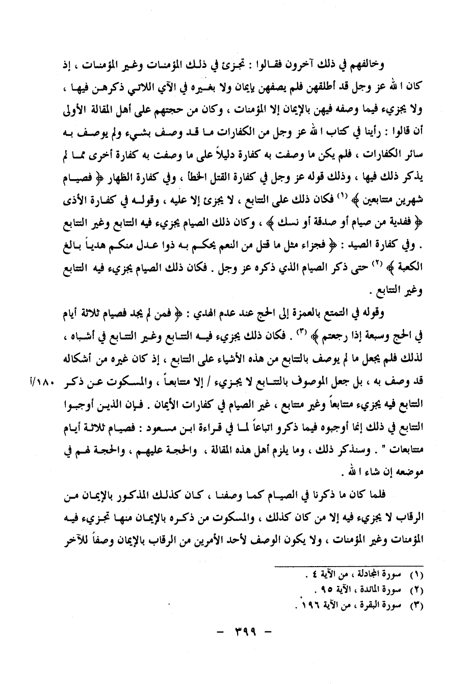 ذَلِكَ الصِّيَامُ يُجْزِئُ فِيهِ التَّتَابُعُ وَغَيْرُ التَّتَابُعِ وَقَوْلُهُ فِي التَّمَتُّعِ بِالْعُمْرَةِ إِلَى الْحَجِّ عِنْدَ عَدَمِ الْهَدْيِ: {فَمَنْ لَمْ يَجِدْ فَصِيَامُ ثَلاثَةِ أَيَّامٍ فِي الْحَجِّ وَسَبْعَةٍ إِذَا رَجَعْتُمْ} ، فَكَانَ ذَلِكَ يُجْزِئُ فِيهِ التَّتَابُعُ وَغَيْرُ التَّتَابُعِ فِي أَشْبَاهٍ، لِذَلِكَ فَلَمْ يَجْعَلْ مَا لَمْ يُوصَفْ بِالتَّتَابُعِ مِنْ هَذِهِ الأَشْيَاءِ عَلَى التَّتَابُعِ، إِذْ كَانَ غَيْرُهُ مِنْ أَشْكَالِهِ قَدْ وَصَفَ بِهِ، بَلْ جَعَلَ الْمَوْصُوفَ بِالتَّتَابُعِ لَا يُجْزِئُ إِلا مُتَتَابِعًا، وَالْمَسْكُوتَ عَنْ ذِكْرِ التَّتَابُعِ فِيهِ يُجْزِئُ مُتَتَابِعًا وَغَيْرَ مُتَتَابِعٍ، غَيْرَ الصِّيَامِ فِي كَفَّارَاتِ الأَيْمَانِ، فَإِنَّ الَّذِي أَوْجَبُوا التَّتَابُعَ فِي ذَلِكَ إِنَّمَا أَوْجَبُوهُ فِيمَا ذَكَرُوا اتِّبَاعًا لِمَا فِي قِرَاءَةِ ابْنِ مَسْعُودٍ " فَصِيَامُ ثَلاثَةِ أَيَّامٍ مُتَتَابِعَاتٍ " وَسَنَذْكُرُ ذَلِكَ، وَمَا يُلْزِمُ أَهْلَ هَذِهِ الْمَقَالَةِ، وَالْحُجَّةَ عَلَيْهِمْ، وَالْحُجَّةَ لَهُمْ فِي مَوْضِعِهِ إِنْ شَاءَ اللهُ فَلَمَّا كَانَ مَا ذَكَرْنَا فِي الصِّيَامِ كَمَا وَصَفْنَا، كَانَ كَذَلِكَ الْمَذْكُورُ بِالإِيمَانِ مِنَ الرِّقَابِ، لَا يُجْزِئُ فِيهِ إِلا مَنْ كَانَ كَذَلِكَ، وَالْمَسْكُوتُ مِنْ ذِكْرِهِ بِالإِيمَانِ مِنْهَا تُجْزِئُ فِيهِ الْمُؤْمِنَاتُ وَغَيْرُ الْمُؤْمِنَاتِ، وَلا يَكُونُ الْوَصْفُ لأَحَدِ الأَمْرَيْنِ مِنَ الرِّقَابِ بِالإِيمَانِ وَصْفًا لِلآخَرِ،