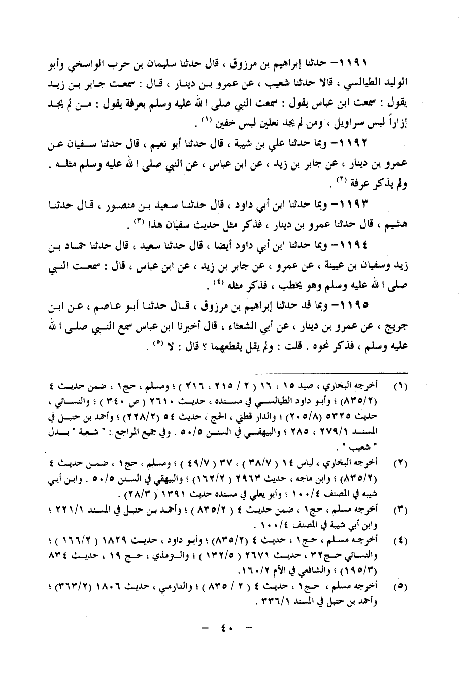 1191 - حَدَّثَنَا إِبْرَاهِيمُ بْنُ مَرْزُوقٍ، قَالَ: حَدَّثَنَا سُلَيْمَانُ بْنُ حَرْبٍ الْوَاسِخِيُّ، وَأَبُو الْوَلِيدِ الطَّيَالِسِيُّ، قَالَا: حَدَّثَنَا شُعَيْبٌ، عَنْ عَمْرِو بْنِ دِينَارٍ، قَالَ: سَمِعْتُ جَابِرَ بْنَ زَيْدٍ، يَقُولُ: سَمِعْتُ ابْنَ عَبَّاسٍ، يَقُولُ: سَمِعْتُ النَّبِيَّ صَلَّى اللَّهُ عَلَيْهِ وَسَلَّمَ، بِعَرَفَةَ، يَقُولُ: " مَنْ لَمْ يَجِدْ إِزَارًا لَبِسَ سَرَاوِيلَ، وَمَنْ لَمْ يَجِدْ نَعْلَيْنِ لَبِسَ خُفَّيْنِ "