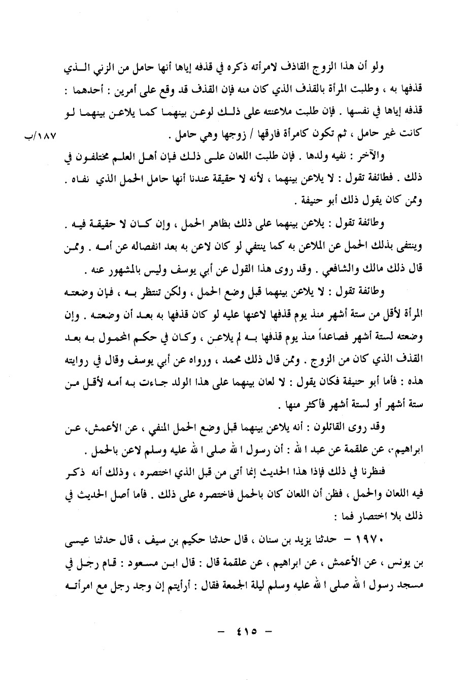 أَنَّ هَذَا الزَّوْجَ الْقَاذِفَ لامْرَأَتِهِ ذَكَرَ فِي قَذْفِهِ إِيَّاهَا أَنَّهَا حَامِلٌ مِنَ الزِّنَى الَّذِي قَذَفَهَا بِهِ، وَطَلَبَتِ الْمَرْأَةُ بِالْقَذْفِ الَّذِي كَانَ مِنْهُ، فَإِنَّ الْقَذْفَ قَدْ وَقَعَ عَلَى أَمْرَيْنِ، أَحَدُهُمَا: قَذْفُهُ إِيَّاهَا فِي نَفْسِهَا، فَإِنْ طَلَبَتْ مُلاعَنَتَهُ عَلَى ذَلِكَ لُوعِنَ بَيْنَهُمَا كَمَا يُلاعَنُ بَيْنَهُمَا لَوْ كَانَتْ غَيْرَ حَامِلٍ، ثُمَّ تَكُونُ كَامْرَأَةٍ فَارَقَهَا زَوْجُهَا وَهِيَ حَامِلٌ وَالآخَرُ: نَفْيُهُ وَلَدَهَا فَإِنْ طَلَبَتِ اللِّعَانَ عَلَى ذَلِكَ فَإِنَّ أَهْلَ الْعِلْمِ مُخْتَلِفُونَ فِي ذَلِكَ، فَطَائِفَةٌ تَقُولُ لَا يُلاعَنُ بَيْنَهُمَا، لأَنَّهُ لَا حَقِيقَةَ عِنْدَنَا أَنَّهَا حَامِلٌ الْحَمْلَ الَّذِي نَفَاهُ وَمِمَّنْ كَانَ يَقُولُ ذَلِكَ أَبُو حَنِيفَةَ وَطَائِفَةٌ تَقُولُ: يُلاعَنُ بَيْنَهُمَا عَلَى ذَلِكَ بِظَاهِرِ الْحَمْلِ، وَإِنْ كَانَ لَا حَقِيقَةَ فِيهِ، وَيَنْتَفِي بِذَلِكَ الْحَمْلُ عَنِ الْمُلاعِنِ بِهِ كَمَا يَنْتَفِي لَوْ كَانَ لاعَنَ بِهِ بَعْدَ انْفِصَالِهِ عَنْ أُمِّهِ وَمِمَّنْ قَالَ ذَلِكَ مَالِكٌ، وَالشَّافِعِيُّ وَقَدْ رُوِيَ هَذَا الْقَوْلِ عَنْ أَبِي يُوسُفَ وَلَيْسَ بِالْمَشْهُورِ عَنْهُ وَطَائِفَةٌ تَقُولُ: لَا يُلاعَنُ بَيْنَهُمَا قَبْلَ وَضْعِ الْحَمْلِ،