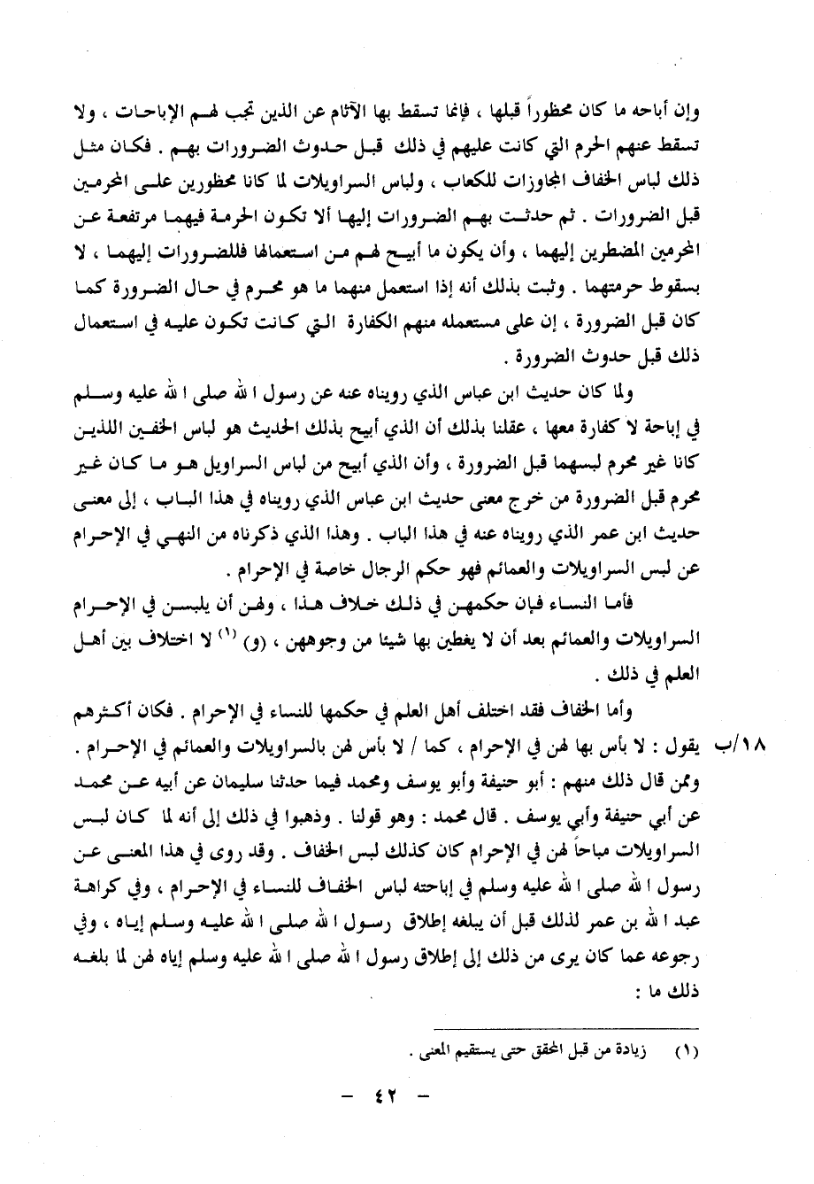 الَّذِي رُوِّينَاهُ عَنْهُ عَنْ رَسُولِ اللهِ صَلَّى اللَّهُ عَلَيْهِ وَسَلَّمَ فِي إِبَاحَةٍ لَا كَفَّارَةَ مَعَهَا، عَقَلْنَا بِذَلِكَ أَنَّ الَّذِي أُبِيحَ بِذَلِكَ الْحَدِيثِ هُوَ لِبَاسُ الْخُفَّيْنِ اللَّذَيْنِ كَانَا غَيْرُ مُحَرَّمٍ لُبْسُهُمَا قَبْلَ الضَّرُورَةِ، وَأَنَّ الَّذِي أُبِيحَ مِنْ لِبَاسِ السَّرَاوِيلِ هُوَ مَا كَانَ غَيْرَ مُحَرَّمٍ قَبْلَ الضَّرُورَةِ مِنْ خُرُوجِ مَعْنَى حَدِيثِ ابْنِ عَبَّاسٍ الَّذِي رُوِّينَاهُ فِي هَذَا الْبَابِ، إِلَى مَعْنَى حَدِيثِ ابْنِ عُمَرَ الَّذِي رُوِّينَاهُ عَنْهُ فِي هَذَا الْبَابِ وَهَذَا الَّذِي ذَكَرْنَاهُ مِنَ النَّهْيِ فِي الْإِحْرَامِ عَنْ لُبْسِ السَّرَاوِيلَاتِ وَالْعَمَائِمِ فَهُوَ حُكْمُ الرِّجَالِ خَاصَّةً فِي الْإِحْرَامِ فَأَمَّا النِّسَاءُ فَإِنَّ حُكْمَهُنَّ فِي ذَلِكَ خِلَافُ هَذَا، وَلَهُنَّ أَنْ يَلْبَسْنَ فِي الْإِحْرَامِ السَّرَاوِيلَاتِ وَالْعَمَائِمَ بَعْدَ أَلا يُغَطِّينَ شَيْئًا مِنْ وُجُوهِهِنَّ، ولَا اخْتِلَافَ بَيْنَ أَهْلِ الْعِلْمِ فِي ذَلِكَ وَأَمَّا الْخِفَافُ فَقَدِ اخْتَلَفَ أَهْلُ الْعِلْمِ فِي حُكْمِهَا لِلنِّسَاءِ فِي الْإِحْرَامِ، فَكَانَ أَكْثَرُهُمْ يَقُولُ: لَا بَأْسَ بِهَا لَهُنَّ فِي الْإِحْرَامِ، كَمَا لَا بَأْسَ لَهُنَّ بِالسَّرَاوِيلَاتِ وَالْعَمَائِمِ فِي الْإِحْرَامِ وَمِمَّنْ قَالَ ذَلِكَ مِنْهُمْ أَبُو حَنِيفَةَ، وَأَبُو يُوسُفَ، وَمُحَمَّدٌ فِيمَا حَدَّثَنَا سُلَيْمَانُ، عَنْ أَبِيهِ، عَنْ مُحَمَّدٍ، عَنْ أَبِي حَنِيفَةَ، وَأَبِي يُوسُفَ قَالَ مُحَمَّدٌ: وَهُوَ قَوْلُنَا وَذَهَبُوا فِي ذَلِكَ إِلَى أَنَّهُ لَمَّا كَانَ لُبْسُ السَّرَاوِيلَاتِ مُبَاحًا لَهُنَّ فِي الْإِحْرَامِ كَانَ كَذَلِكَ لُبْسُ الْخِفَافِ وَقَدْ رُوِيَ فِي هَذَا الْمَعْنَى عَنْ رَسُولِ اللهِ صَلَّى اللَّهُ عَلَيْهِ وَسَلَّمَ فِي إِبَاحَتِهِ لِبَاسِ الْخِفَافِ لِلنِّسَاءِ فِي الْإِحْرَامِ، وَفِي كَرَاهَةِ عَبْدِ اللهِ بْنِ عُمَرَ لِذَلِكَ قَبْلَ أَنْ يَبْلُغَهُ إِطْلَاقُ رَسُولِ اللهِ صَلَّى اللَّهُ عَلَيْهِ وَسَلَّمَ إِيَّاهُ، وَفِي رُجُوعِهِ عَمَّا كَانَ يَرَى مِنْ ذَلِكَ إِلَى إِطْلَاقِ رَسُولِ اللهِ صَلَّى الله عَلَيْهِ