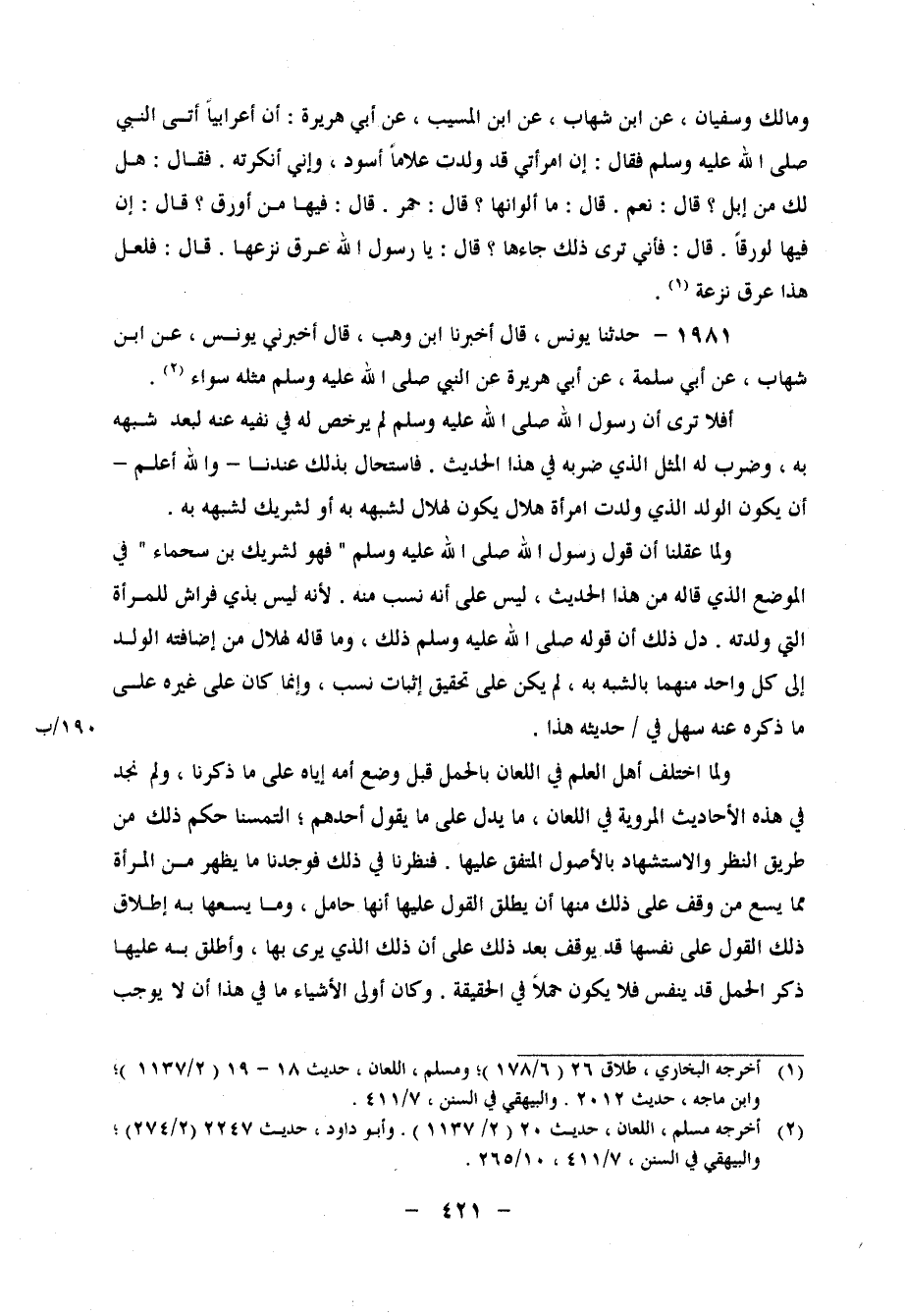 1981 - حَدَّثَنَا يُونُسُ، قَالَ: أَخْبَرَنَا ابْنُ وَهْبٍ، قَالَ: أَخْبَرَنِي يُونُسُ، عَنِ ابْنِ شِهَابٍ، عَنْ أَبِي سَلَمَةَ، عَنْ أَبِي هُرَيْرَةَ، عَنِ النَّبِيِّ صَلَّى اللَّهُ عَلَيْهِ وَسَلَّمَ، مِثْلَهُ سَوَاءً أَفَلا تَرَى أَنَّ رَسُولَ اللهِ صَلَّى اللَّهُ عَلَيْهِ وَسَلَّمَ لَمْ يُرَخِّصْ لَهُ فِي نَفْيِهِ عَنْهُ لِبُعْدِ شَبَهِهِ بِهِ، وَضَرَبَ لَهُ الْمَثَلَ الَّذِي ضَرَبَهُ فِي هَذَا الْحَدِيثِ، فَاسْتَحَالَ بِذَلِكَ عِنْدَنَا، وَاللهُ أَعْلَمُ، أَنْ يَكُونَ الْوَلَدُ الَّذِي وَلَدَتِ امْرَأَةُ هِلالٍ يَكُونُ لِهِلالٍ لِشَبَهِهِ بِهِ أَوْ لِشَرِيكٍ لِشَبَهِهِ بِهِ وَلَمَّا عَقَلْنَا أَنَّ قَوْلَ رَسُولِ اللهِ صَلَّى اللَّهُ عَلَيْهِ وَسَلَّمَ: " فَهُوَ لِشَرِيكِ بْنِ سَحْمَاءَ "، فِي الْمَوْضِعِ الَّذِي قَالَهُ مِنْ هَذَا الْحَدِيثِ، لَيْسَ عَلَى أَنَّهُ نَسَبٌ مِنْهُ، لأَنَّهُ لَيْسَ بِذِي فِرَاشٍ لِلْمَرْأَةِ الَّتِي وَلَدَتْهُ، دَلَّ ذَلِكَ أَنَّ قَوْلَهُ صَلَّى اللَّهُ عَلَيْهِ وَسَلَّمَ ذَلِكَ، وَمَا قَالَهُ لِهِلالٍ مِنْ إِضَافَتِهِ
