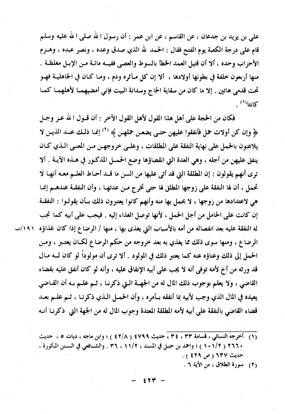 عَلِيُّ بْنُ يَزِيدَ بْنِ جُدْعَانَ، عَنِ الْقَاسِمِ، عَنِ ابْنِ عُمَرَ، أَنَّ رَسُولَ اللهِ صَلَّى اللَّهُ عَلَيْهِ وَسَلَّمَ قَامَ عَلَى دَرَجَةِ الْكَعْبَةِ يَوْمَ الْفَتْحِ، فَقَالَ: " الْحَمْدُ لِلَّهِ الَّذِي صَدَقَ وَعْدَهُ، وَنَصَرَ عَبْدَهُ، وَهَزَمَ الأَحْزَابَ وَحْدَهُ، أَلا إِنَّ قَتِيلَ الْعَمْدِ الْخَطَإِ بِالسَّوْطِ وَالْعَصَى فَفِيهِ مِائَةٌ مِنَ الإِبِلِ مُغَلَّظَةٌ مِنْهَا أَرْبَعُونَ خَلِفَةً فِي بُطُونِهَا أَوْلادُهَا أَلا إِنَّ كُلَّ مَأْثَرَةٍ وَدَمٍ وَمَا كَانَ فِي الْجَاهِلِيَّةِ فَهُوَ تَحْتَ قَدَمِيَّ هَاتَيْنِ إِلا مَا كَانَ مِنْ سِقَايَةِ الْحَاجٍّ وَسِدَانَةِ الْبَيْتِ فَإِنِّي أُمْضِيهُمَا لأَهْلِهِمَا كَمَا كَانَتَا " فَكَانَ مِنَ الْحُجَّةِ عَلَى أَهْلِ هَذَا الْقَوْلِ لأَهْلِ الْقَوْلِ الآخَرِ، أَنَّ قَوْلَ اللهِ عَزَّ وَجَلَّ: {وَإِنْ كُنَّ أُولاتِ حَمْلٍ فَأَنْفِقُوا عَلَيْهِنَّ حَتَّى يَضَعْنَ حَمْلَهُنَّ} ، إِنَّمَا ذَلِكَ عِنْدَ الَّذِينَ لَا يُلاعِنُونَ بِالْحَمْلِ عَلَى نِهَايَةِ النَّفَقَةِ عَلَى الْمُطَلَّقَاتِ، وَعَلَى خُرُوجِهِنَّ مِنَ الْمَعْنَى الَّذِي كَانَ يُنْفَقُ عَلَيْهِنَّ مِنْ أَجْلِهِ، وَهِيَ الْعِدَّةُ الَّتِي انْقِضَاؤُهَا وَضْعُ الْحَمْلِ الْمَذْكُورِ فِي هَذِهِ الآيَةِ أَلا تَرَى أَنَّهُمْ يَقُولُونَ: إِنَّ الْمُطَلَّقَةَ الَّتِي قَدْ أَتَى عَلَيْهَا مِنَ السِّنِّ مَا قَدْ أَحَاطَ الْعِلْمُ مَعَهُ أَنَّهَا لَا تَحْمِلُ، أَنَّ لَهَا النَّفَقَةَ عَلَى زَوْجِهَا الْمُطَلِّقِ لَهَا حَتَّى تَخْرُجَ مِنْ عِدَّتِهَا، وَأَنَّ النَّفَقَةَ عِنْدَهُمْ إِنَّمَا هِيَ لاعْتِدَادِهَا مِنْ زَوْجِهَا، لَا بِحَمْلٍ بِهَا مِنْهُ، وَأَنَّهُمْ كَانُوا يَعْتَبِرُونَ ذَلِكَ بِأَنْ يَقُولُوا: النَّفَقَةُ إِنْ كَانَتْ عَلَى الْحَامِلِ مِنْ أَجْلِ الْحَمْلِ، لأَنَّهَا تُوَصِّلُ الْغِذَاءَ إِلَيْهِ، فَتَجِبُ عَلَى أَبِيهِ، كَمَا تَجِبُ لَهُ النَّفَقَةُ عَلَيْهِ بَعْدَ انْفِصَالِهِ مِنْ أُمِّهِ