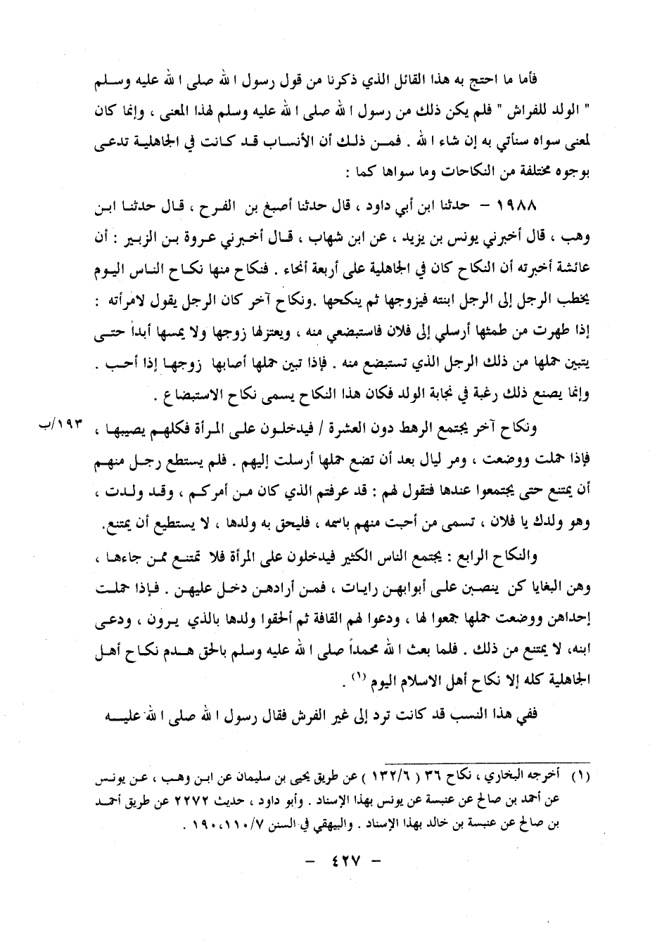 1988 - حَدَّثَنَا ابْنُ أَبِي دَاوُدَ، قَالَ: حَدَّثَنَا أَصْبَغُ بْنُ الْفَرَج، قَالَ: حَدَّثَنَا ابْنُ وَهْبٍ، قَالَ: أَخْبَرَنِي يُونُسُ بْنُ يَزِيدَ، عَنِ ابْنِ شِهَابٍ، قَالَ: أَخْبَرَنِي عُرْوَةُ بْنُ الزُّبَيْرِ، أَنَّ عَائِشَةَ، أَخْبَرَتْهُ، أَنَّ النِّكَاحَ كَانَ فِي الْجَاهِلِيَّةِ عَلَى أَرْبَعَةِ أَنْحَاءٍ، فَنِكَاحٌ مِنْهَا نِكَاحُ النَّاسِ الْيَوْمَ يَخْطِبُ الرَّجُلُ إِلَى الرَّجُلِ ابْنَتَهُ فَيُزَوِّجُهَا ثُمَّ يُنْكِحُهَا وَنِكَاحٌ آخَرُ كَانَ الرَّجُلُ يَقُولُ لامْرَأَتِهِ: إِذَا طَهُرْتُ مِنَ طَمْثِهَا أَرْسِلِي إِلَى فُلانٍ فَاسْتَبْضِعِي مِنْهُ، وَيَعْتَزِلُهَا زَوْجُهَا وَلا يَمَسُّهَا أَبَدًا حَتَّى يَتَبَيَّنَ حَمْلُهَا مِنْ ذَلِكَ الرَّجُلِ الَّذِي تَسْتَبْضِعُ مِنْهُ فَإِذَا تَبَيَّنَ حَمْلُهَا أَصَابَهَا زَوْجُهَا إِذَا أَحَبَّ وَإِنَّمَا يَصْنَعُ ذَلِكَ رَغْبَةً فِي نَجَابَةِ الْوَلَدِ فَكَانَ هَذَا النِّكَاحُ يُسَمَّى نِكَاحُ الاسْتِبْضَاعِ وَنِكَاحٌ آخَرُ يَجْتَمِعُ الرَّهْطُ دُونَ الْعَشَرَةِ فَيَدْخُلُونَ عَلَى الْمَرْأَةِ، فَكُلُّهُمْ يُصِيبُهَا، فَإِذَا حَمَلَتْ وَوَضَعَتْ، وَمَرَّ لَيال بَعْدَ أَنْ تَضَعَ حَمْلُهَا أَرْسَلَتْ إِلَيْهِمْ فَلَمْ يَسْتَطِعْ رَجُلٌ مِنْهُمْ أَنْ يَمْتَنِعَ حَتَّى يَجْتَمِعُوا عِنْدَهَا، فَتَقُولُ لَهُمْ: قَدْ عَرَفْتُمُ الَّذِي كَانَ مِنْ أَمْرِكُمْ، وَقَدْ وَلَدْتُ، وَهُوَ وَلَدُكَ يَا فُلانُ، تُسَمِّي مَنْ أَحَبَّتْ مِنْهُمْ بِاسْمِهِ، فَيُلْحِقُ بِهِ وَلَدَهَا، لَا يَسْتَطِيعُ أَنْ يَمْتَنِعَ وَالنِّكَاحُ الرَّابِعُ يجْتَمع النَّاس الْكثير فَيدْخلُونَ على الْمَرْأَة فَلَا تمْتَنع مِمَّن جاءها، وَهن البغايا كن ينصبن على أبوابهن رايات، فَمن أرادهن دخل عَلَيْهِنَّ، فَإِذا حملت إِحْدَاهُنَّ وَوضعت حملهَا جمعُوا لَهَا، ودعوا لَهَا الْقَافة، ثمَّ ألْحقُوا وَلَدهَا بِالَّذِي يرَوْنَ، ودعي ابْنه، لَا يَمْتَنِعُ مِنْ ذَلِكَ فَلَمَّا بَعَثَ اللهُ مُحَمَّدًا صَلَّى اللَّهُ عَلَيْهِ وَسَلَّمَ بِالْحَقِّ هَدَمَ نِكَاحَ أَهْلِ الْجَاهِلِيَّةِ كُلَّهُ إِلا نِكَاحَ أَهْلِ الإِسْلامِ الْيَوْمَ
