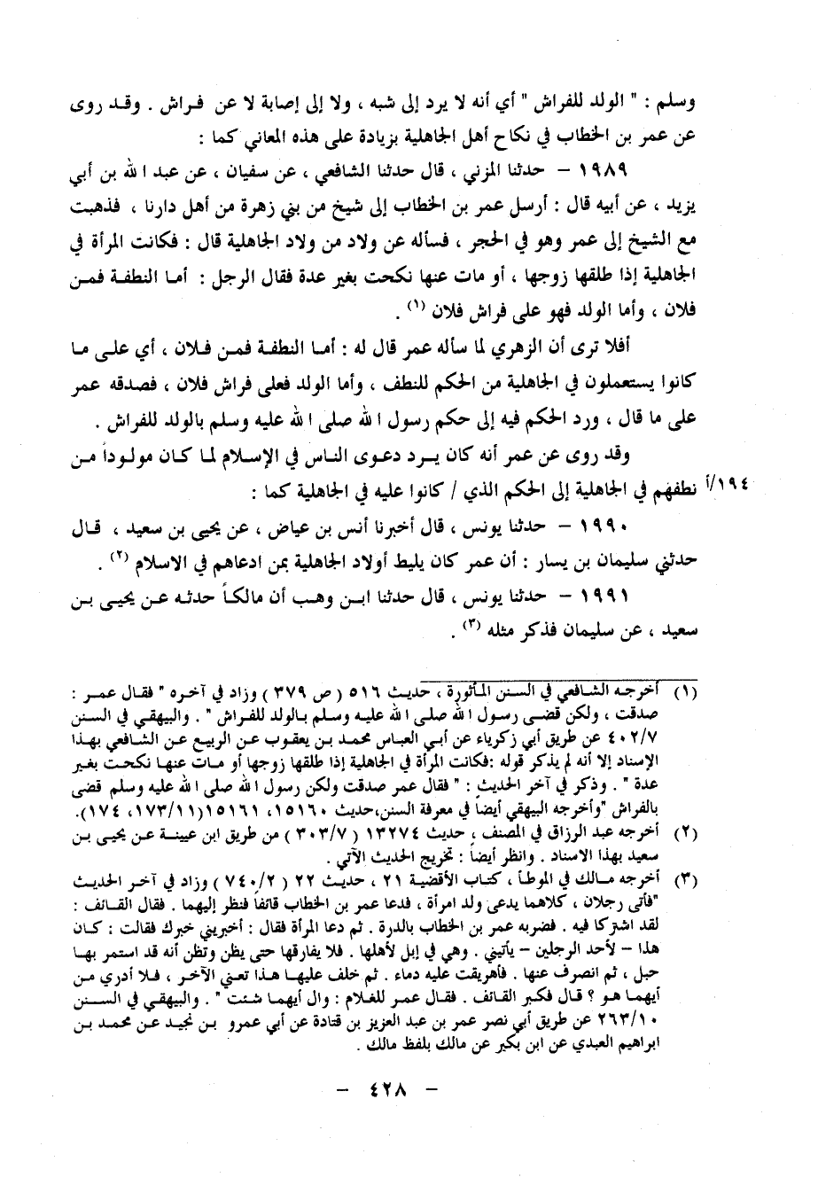 1989 - حَدَّثَنَا الْمُزَنِيُّ، قَالَ: حَدَّثَنَا الشَّافِعِيُّ، عَنْ سُفْيَانَ، عَنْ عَبْدِ اللهِ بْنِ أَبِي يَزِيدَ، عَنْ أَبِيهِ، قَالَ: " أَرْسَلَ عُمَرُ بْنُ الْخَطَّابِ إِلَى شَيْخٍ مِنْ بَنِي زُهْرَةَ مِنْ أَهْلِ دَارِنَا، فَذَهَبْتُ مَعَ الشَّيْخِ إِلَى عُمَرَ وَهُوَ فِي الْحِجْرِ، فَسَأَلَهُ عَنْ وِلادٍ مِنْ وِلادِ الْجَاهِلِيَّةِ، قَالَ: فَكَانَتِ الْمَرْأَةُ فِي الْجَاهِلِيَّةِ إِذَا طَلَّقَهَا زَوْجُهَا، أَوْ مَاتَ عَنْهَا نَكَحَتْ بِغَيْرِ عِدَّةٍ، فَقَالَ الرَّجُلُ: أَمَّا النُّطْفَةُ فَمِنْ فُلانٍ، وَأَمَّا الْوَلَدُ فَهُوَ عَلَى فِرَاشِ فُلانٍ " أَفَلا تَرَى أَنَّ الزُّهْرِيَّ لَمَّا سَأَلَهُ عُمَرُ، قَالَ لَهُ: أَمَّا النُّطْفَةُ فَمِنْ فُلانٍ، أَيْ عَلَى مَا كَانُوا يَسْتَعْمِلُونَ فِي الْجَاهِلِيَّةِ مِنَ الْحُكْمِ لِلنُّطَفِ، وَأَمَّا الْوَلَدُ فَعَلَى فِرَاشِ فُلانٍ، فَصَدَّقَهُ عُمَرُ عَلَى مَا قَالَ، وَرَدَّ الْحُكْمَ فِيهِ إِلَى حُكْمِ رَسُولِ اللهِ صَلَّى اللَّهُ عَلَيْهِ وَسَلَّمَ بِالْوَلَدِ لِلْفِرَاشِ وَقَدْ رُوِيَ عَنْ عُمَرَ أَنَّهُ كَانَ يَرُدُّ دَعْوَى النَّاسِ فِي الإِسْلامِ لَمَّا كَانَ مَوْلُودًا مِنْ نُطَفِهِمْ فِي الْجَاهِلِيَّةِ إِلَى الْحُكْمِ الَّذِي كَانُوا عَلَيْهِ فِي الْجَاهِلِيَّةِ كَمَا