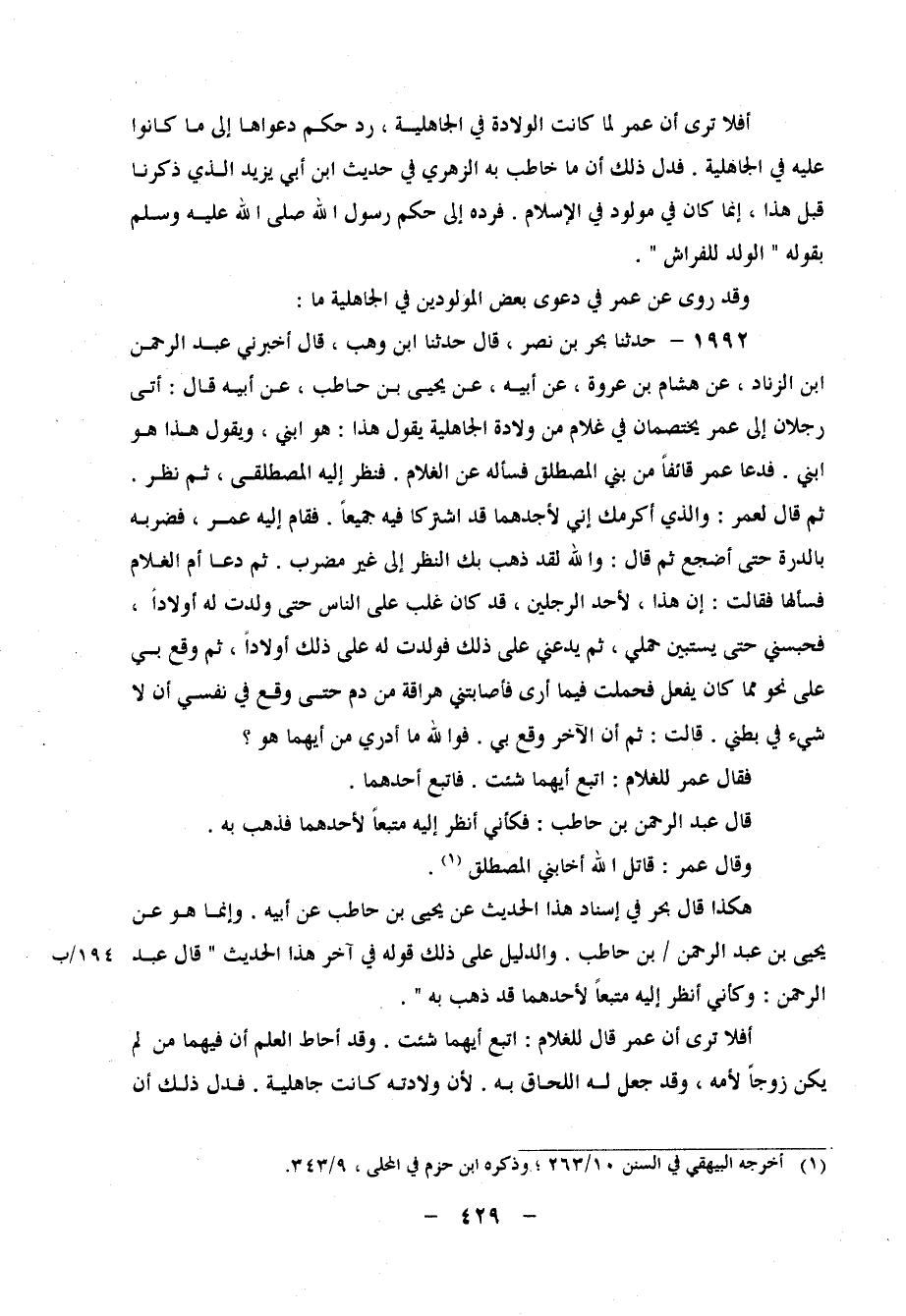 1992 - حَدَّثَنَا بَحْرُ بْنُ نَصْرٍ، قَالَ: حَدَّثَنَا ابْنُ وَهْبٍ، قَالَ: أَخْبَرَنِي عَبْدُ الرَّحْمَنِ بْنُ الزِّنَادِ، عَنْ هِشَامِ بْنِ عُرْوَةَ، عَنْ أَبِيهِ، عَنْ يَحْيَى بْنِ حَاطِبٍ، عَنْ أَبِيهِ، قَالَ: " أَتَى رَجُلانِ إِلَى عُمَرَ يَخْتَصِمَانِ فِي غُلامٍ مِنْ وِلادَةِ الْجَاهِلِيَّةِ، يَقُولُ هَذَا: هُوَ ابْنِي، وَيَقُولُ هَذَا: هُوَ ابْنِي فَدَعَا عُمَرُ قَائِفًا مِنْ بَنِي الْمُصْطَلِقِ، فَسَأَلَهُ عَنِ الْغُلامِ، فَنَظَرَ إِلَيْهِ الْمُصْطَلَقِيُّ، ثُمَّ نَظَرَ، ثُمَّ قَالَ لِعُمَرَ: وَالَّذِي أَكْرَمَكَ إِنِّي لأَجِدُهُمَا قَدِ اشْتَرَكَا فِيهِ جَمِيعًا، فَقَامَ إِلَيْهِ عُمَرُ، فَضَرَبَهُ بِالدِّرَّةِ حَتَّى أُضْجِعَ، ثُمَّ قَالَ: وَاللهِ لَقَدْ ذَهَبَ بِكَ النَّظَرُ إِلَى غَيْرِ مَضْرِبٍ ثُمَّ دَعَا أُمَّ الْغُلامِ فَسَأَلَهَا، فَقَالَتْ: إِنَّ هَذَا لأَحَدِ الرَّجُلَيْنِ، قَدْ كَانَ غَلَبَ عَلَى النَّاسِ حَتَّى وَلَدْتُ لَهُ أَوْلادًا، فَحَبَسَنِي حَتَّى يَسْتَبِينَ حَمْلِي، ثُمَّ يَدَعُنِي عَلَى ذَلِكَ، فَوَلَدْتُ لَهُ عَلَى ذَلِكَ أَوْلادًا، ثُمَّ وَقَعَ بِي عَلَى نَحْوٍ مِمَّا كَانَ يَفْعَلُ فَحَمَلْتُ فِيمَا أَرَى، فَأَصَابَتْنِي هِرَاقَةٌ مِنْ دَمٍ حَتَّى وَقَعَ فِي نَفْسِي أَنْ لَا شَيْءَ فِي بَطْنِي قَالَتْ: ثُمَّ إِنَّ الآخَرَ وَقَعَ بِي، فَوَاللهِ مَا أَدْرِي مِنْ أَيِّهِمَا هُوَ؟ فَقَالَ عُمَرُ لِلْغُلامِ: اتْبَعْ أَيَّهُمَا شِئْتَ فَاتَّبَعَ أَحَدَهُمَا، قَالَ عَبْدُ الرَّحْمَنِ بْنُ حَاطِبٍ: فَكَأَنِّي أَنْظُرُ إِلَيْهِ مُتَّبِعًا لأَحَدِهِمَا، فَذَهَبَ بِهِ وَقَالَ عُمَرُ: قَاتَلَ اللهُ أَخَا بَنِي الْمُصْطَلِقِ " هَكَذَا قَالَ بَحْرٌ فِي إِسْنَادِ هَذَا الْحَدِيثِ عَنْ يَحْيَى بْنِ حَاطِبٍ، عَنْ أَبِيهِ، وَإِنَّمَا هُوَ عَنْ يَحْيَى بْنِ عَبْدِ الرَّحْمَنِ بْنِ حَاطِبٍ، وَالدَّلِيلُ عَلَى ذَلِكَ قَوْلُهُ فِي آخِرِ هَذَا الْحَدِيثِ: قَالَ عَبْدُ الرَّحْمَنِ: وَكَأَنِّي أَنْظُرُ إِلَيْهِ مُتَّبِعًا لأَحِدِهَما قَدْ ذَهَبَ بِهِ