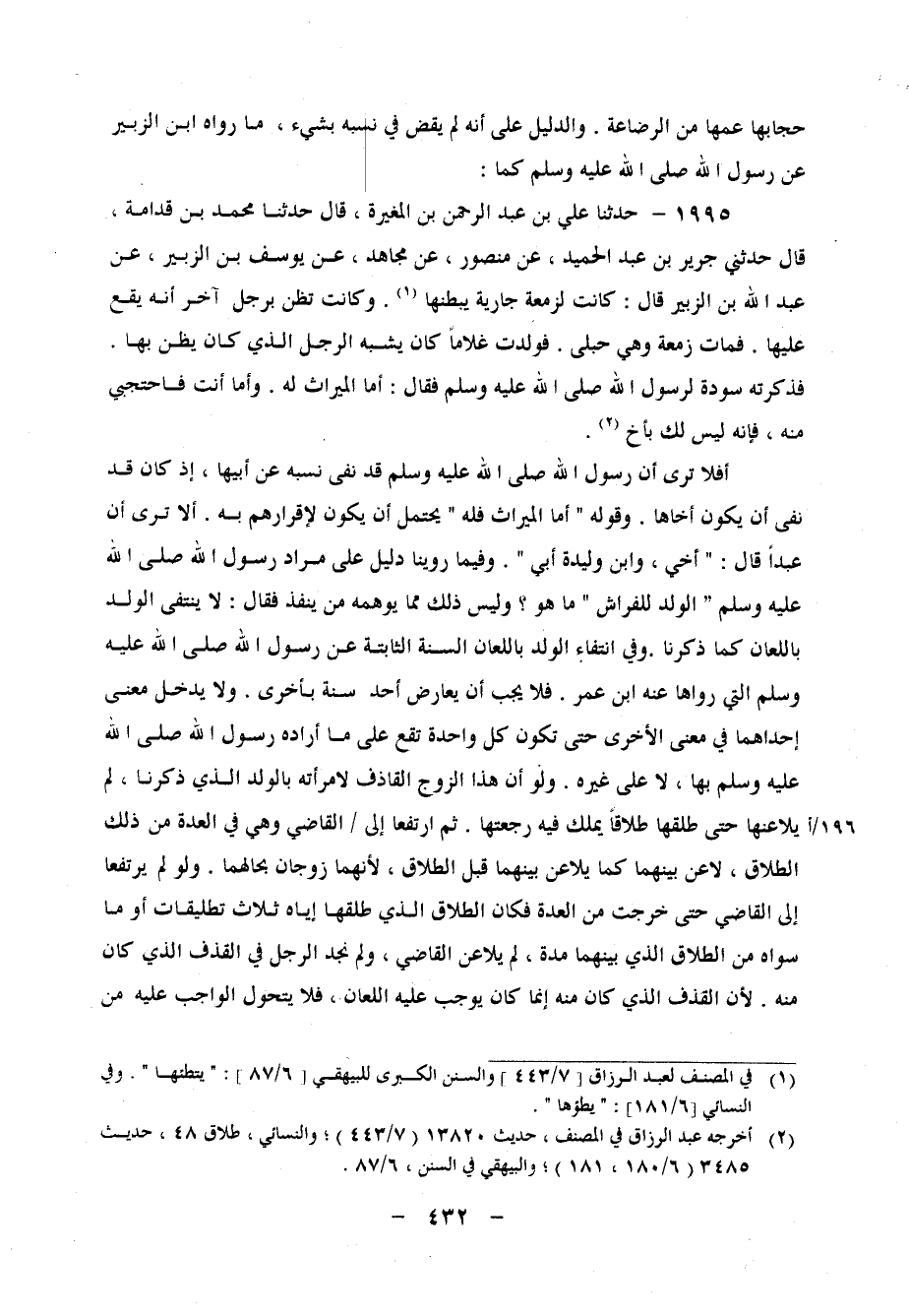 1995 - حَدَّثَنَا عَلِيُّ بْنُ عَبْدِ الرَّحْمَنِ بْنِ الْمُغِيرَةِ، قَالَ: حَدَّثَنَا مُحَمَّدُ بْنُ قُدَامَةَ، قَالَ: حَدَّثَنَا جَرِيرُ بْنُ عَبْدِ الْحَمِيدِ، عَنْ مَنْصُورٍ، عَنْ مُجَاهِدٍ، عَنْ يُوسُفَ بْنِ الزُّبَيْرِ، عَنْ عَبْدِ اللهِ بْنِ الزُّبَيْرِ، قَالَ: كَانَتْ لِزَمْعَةَ جَارِيَةٌ يَطَؤُهَا، وَكَانَتْ تَظُنُّ بِرَجُلٍ آخَرَ أَنَّهُ يَقَعُ عَلَيْهَا، فَمَاتَ زَمْعَةُ وَهِيَ حُبْلَى، فَوَلَدَتْ غُلامًا كَانَ يُشْبِهُ الرَّجُلَ الَّذِي كَانَ يُظَنُّ بِهَا، فَذَكَرَتْهُ سَوْدَةُ لِرَسُولِ اللهِ صَلَّى اللَّهُ عَلَيْهِ وَسَلَّمَ، فَقَالَ: " أَمَّا الْمِيرَاثُ لَهُ، وَأَمَّا أَنْتِ فَاحْتَجِبِي مِنْهُ، فَإِنَّهُ لَيْسَ لَكِ بِأَخٍ " أَفَلا تَرَى أَنَّ رَسُولَ اللهِ صَلَّى اللَّهُ عَلَيْهِ وَسَلَّمَ قَدْ نَفَى نَسَبَهُ عَنْ أَبِيهَا، إِذْ كَانَ قَدْ نَفَى أَنْ يَكُونَ أَخَاهَا وَقَوْلُهُ: " أَمَّا الْمِيرَاثُ لَهُ " يَحْتَمِلُ أَنْ يَكُونَ لإِقْرَارِهِمْ بِهِ، أَلا تَرَى أَنَّ عَبْدًا قَالَ: " أَخِي، وَابْنُ وَلِيدَةِ أَبِي " وَفِيمَا رُوِّينَا دَلِيلٌ عَلَى مُرَادِ رَسُولِ اللهِ صَلَّى اللهُ