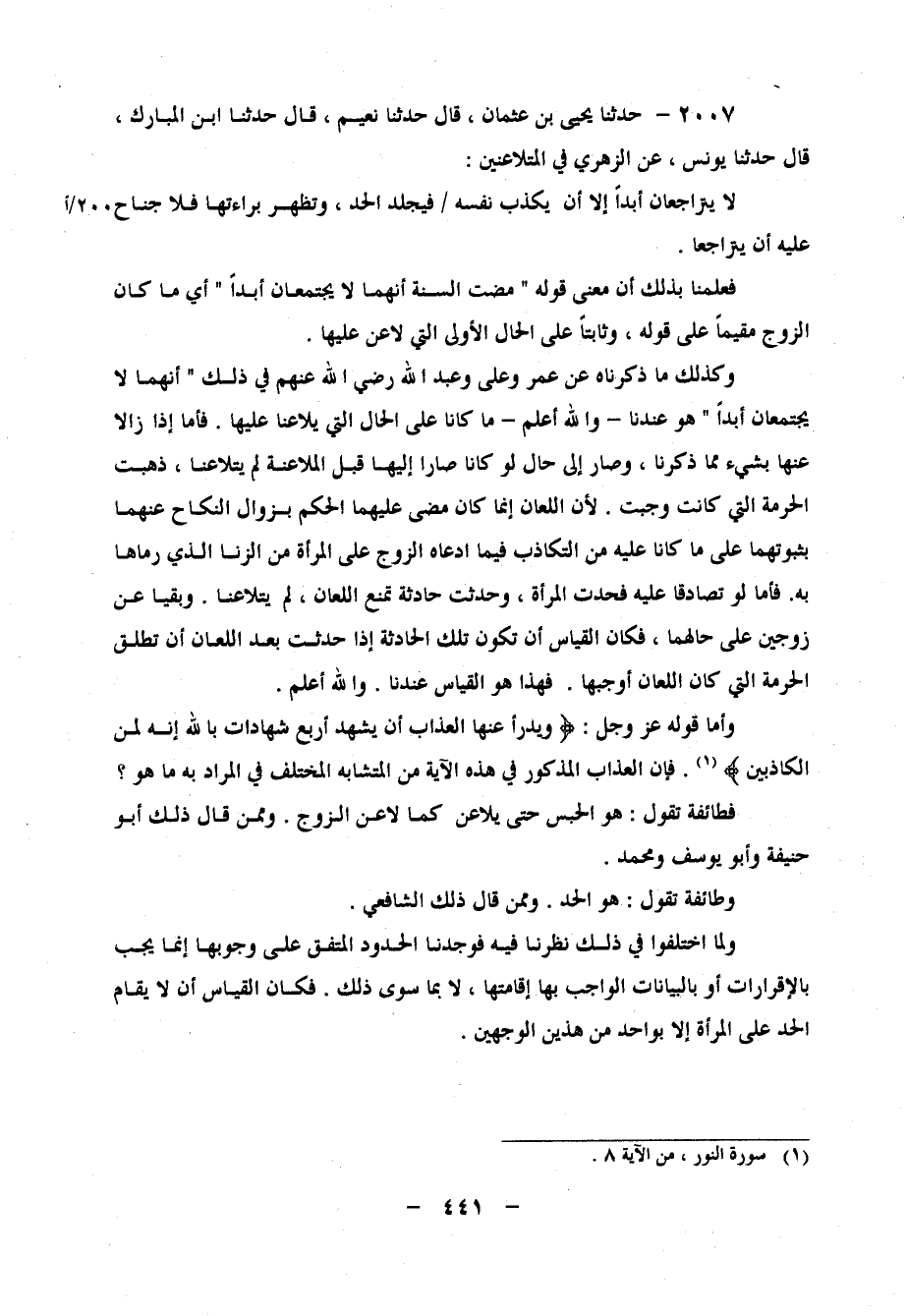 2007 - حَدَّثَنَا يَحْيَى بْنُ عُثْمَانَ، قَالَ: حَدَّثَنَا نُعَيْمٌ، قَالَ: حَدَّثَنَا ابْنُ الْمُبَارَكِ، قَالَ: حَدَّثَنَا يُونُسُ، عَنِ الزُّهْرِيِّ، " فِي الْمُتَلاعِنَيْنِ: " لَا يَتَرَاجَعَانِ أَبَدًا إِلا أَنْ يُكَذِّبَ نَفْسَهُ، فَيُجْلَدُ الْحَدَّ، وَتَظْهَرُ بَرَاءَتُهَا، فَلا جُنَاحَ عَلَيْهِ أَنْ يَتَرَاجَعَا " فَعَلِمْنَا بِذَلِكَ أَنَّ مَعْنَى قَوْلِهِ: " مَضَتِ السُّنَّةُ أَنَّهُمَا لَا يَجْتَمِعَانِ أَبَدًا " أَيْ مَا كَانَ الزَّوْجُ مُقِيمًا عَلَى قَوْلِهِ، وَثَابِتًا عَلَى