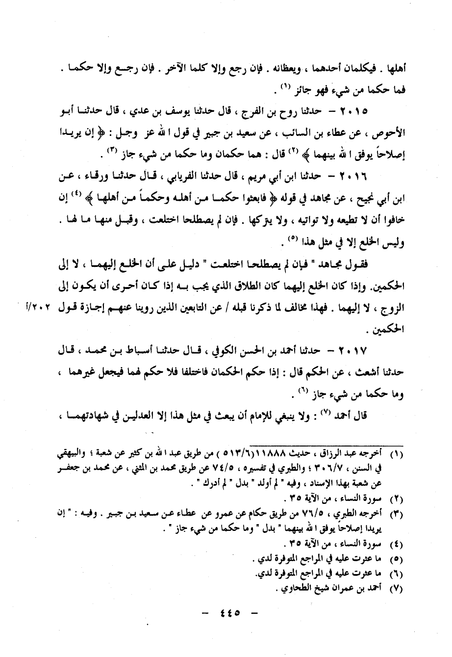 2017 - حَدَّثَنَا أَحْمَدُ بْنُ الْحَسَنِ الْكُوفِيُّ، قَالَ: حَدَّثَنَا أَسْبَاطُ بْنُ مُحَمَّدٍ، قَالَ: حَدَّثَنَا أَشْعَثُ، عَنِ الْحَكَمِ، قَالَ: إِذَا حَكَمَ الْحَكَمَانِ فَاخْتَلَفَا فَلا حُكْمَ لَهُمَا، فَيُجْعَلُ غَيْرُهُمَا، وَمَا حَكَمَا مِنْ شَيْءٍ جَازَ " قَالَ أَحْمَدُ: وَلا يَنْبَغِي لِلإِمَامِ أَنْ يَبْعَثَ فِي مِثْلِ هَذَا إِلا الْعَدْلَيْنِ فِي شَهَادَتِهِمَا