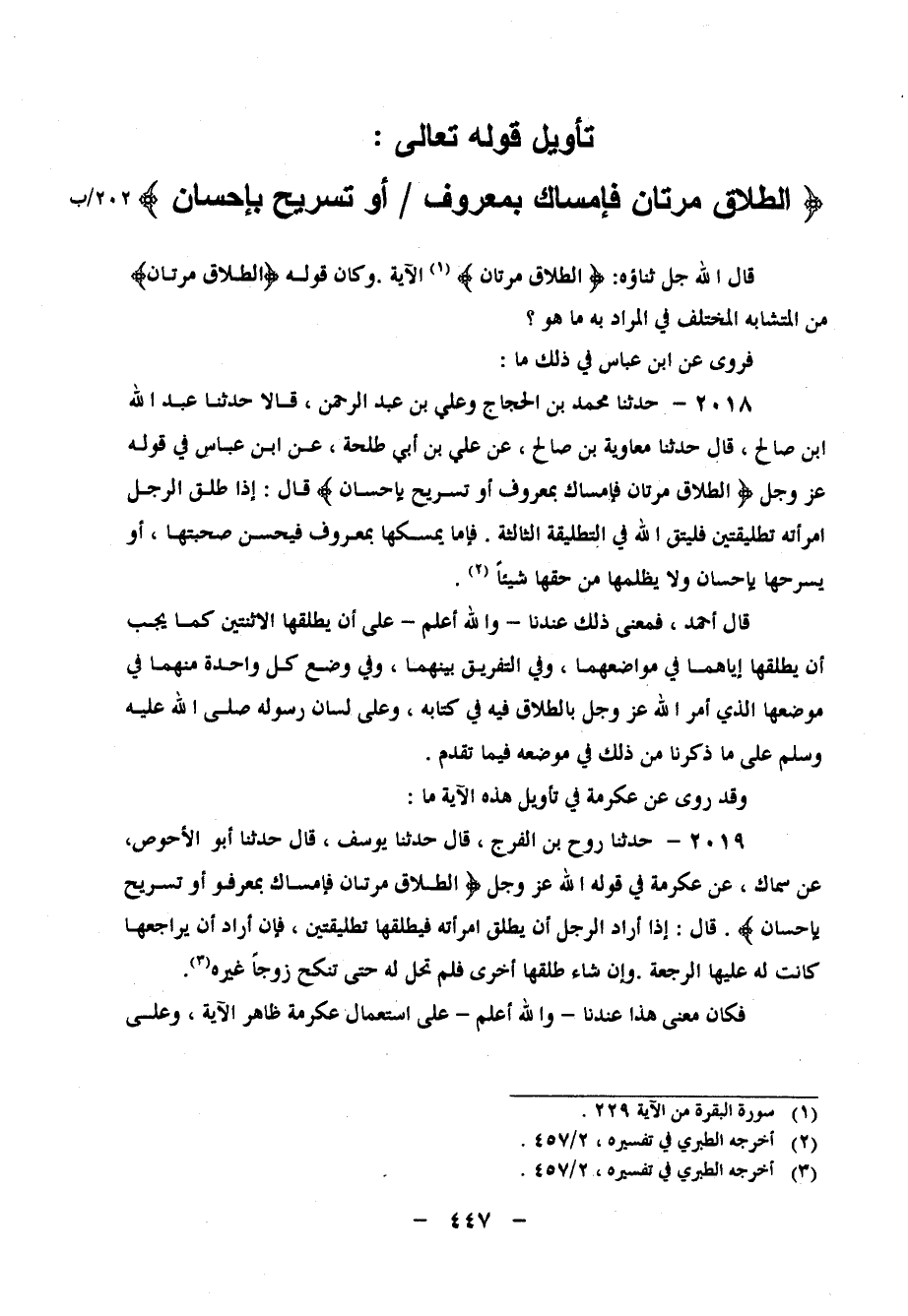 2018 - حَدَّثَنَا مُحَمَّدُ بْنُ الْحَجَّاجِ، وَعَلِيُّ بْنُ عَبْدِ الرَّحْمَنِ، قَالا: حَدَّثَنَا عَبْدُ اللهِ بْنُ صَالِحٍ، قَالَ: حَدَّثَنَا مُعَاوِيَةُ بْنُ صَالِحٍ، عَنْ عَلِيِّ بْنِ أَبِي طَلْحَةَ، عَنِ ابْنِ عَبَّاسٍ، فِي قَوْلِهِ عَزَّ وَجَلَّ: " {الطَّلاقُ مَرَّتَانِ فَإِمْسَاكٌ بِمَعْرُوفٍ أَوْ تَسْرِيحٌ بِإِحْسَانٍ} ، قَالَ: إِذَا طَلَّقَ الرَّجُلُ امْرَأَتَهُ تَطْلِيقَتَيْنِ فَلْيَتَّقِ اللهَ فِي التَّطْلِيقَةِ الثَّالِثَةِ، فَإِمَّا يُمْسِكُهَا بِمَعْرُوفٍ فَيُحْسِنُ صُحْبَتَهَا، أَوْ يُسَرِّحُهَا بِإِحْسَانٍ وَلا يَظْلِمُهَا مِنْ حَقِّهَا شَيْئًا " قَالَ أَحْمَدُ: فَمْعَنَى ذَلِكَ عِنْدَنَا، وَاللهُ أَعْلَمُ، عَلَى أَنْ يُطَلِّقَهَا الاثْنَتَيْنِ كَمَا يَجِبُ أَنْ يُطَلِّقَهَا إِيَّاهُمَا فِي مَوَاضِعِهِمَا، وَفِي التَّفْرِيقِ بَيْنَهُمَا، وَفِي وَضْعِ كُلِّ وَاحِدَةٍ مِنْهُمَا فِي مَوْضِعِهَا الَّذِي أَمَرَ اللهُ عَزَّ وَجَلَّ بِالطَّلاقِ فِيهِ فِي كِتَابِهِ، وَعَلَى لِسَانِ رَسُولِهِ صَلَّى اللَّهُ عَلَيْهِ وَسَلَّمَ عَلَى مَا ذَكَرْنَا مِنْ ذَلِكَ فِي مَوْضِعِهِ فِيمَا تَقَدَّمَ وَقَدْ رُوِيَ عَنْ عِكْرِمَةَ فِي تَأْوِيلِ هَذِهِ الآيَةِ مَا