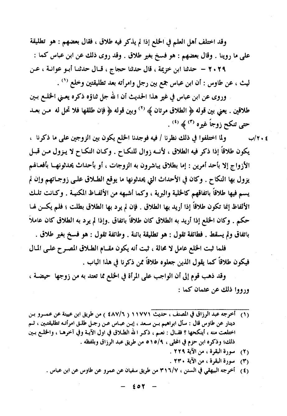 2029 - حَدَّثَنَا ابْنُ خُزَيْمَةَ، قَالَ: حَدَّثَنَا حَجَّاجٌ، قَالَ: حَدَّثَنَا أَبُو عَوَانَةَ، عَنْ لَيْثٍ، عَنْ طَاوُسٍ، أَنَّ ابْنَ عَبَّاسٍ " جَمَعَ بَيْنَ رَجُلٍ وَامْرَأَتِهِ بَعْدَ تَطْلِيقَتَيْنِ وَخُلْعٍ " وَرُوِيَ عَنِ ابْنِ عَبَّاسٍ فِي غَيْرِ هَذَا الْحَدِيثِ أَنَّ اللهَ جَلَّ ثَنَاؤُهُ ذَكَرَهُ، يَعْنِي الْخُلْعَ، بَيْنَ طَلاقَيْنِ، يَعْنِي بَيْنَ قَوْلِهِ: {الطَّلاقُ مَرَّتَانِ} ، وَبَيْنَ قَوْلِهِ: {فَإِنْ طَلَّقَهَا فَلا تَحِلُّ لَهُ مِنْ بَعْدُ حَتَّى تَنْكِحَ زَوْجًا غَيْرَهُ} وَلَمَّا اخْتَلَفُوا فِي ذَلِكَ نَظَرْنَا فِيهِ، فَوَجْدَنا الْخُلْعَ يَكُونُ بَيْنَ الزَّوْجَيْنِ عَلَى مَا ذَكَرْنَا، يَكُونُ طَلاقًا إِذَا ذُكِرَ فِيهِ الطَّلاقُ، لأَنَّهُ زَوَالٌ لِلنِّكَاحِ، وَكَانَ النِّكَاحُ لَا يَزُولُ مِنْ قِبَلِ الأَزْوَاجِ إِلا بِأَحَدِ أَمْرَيْنِ: إِمَّا بِطَلاقٍ يُبَاشِرُونَ بِهِ الزَّوْجَاتِ، أَوْ بِأَحْدَاثٍ يُحْدِثُونَهَا بِأَفْعَالِهِمْ يَزُولُ بِهَا النِّكَاحُ وَكَانَ فِي الأَحْدَاثِ الَّتِي يُحْدِثُونَهَا مَا يُوقِعُ الطَّلاقَ عَلَى زَوْجَاتِهِمْ، وَإِنْ لَمْ يُسَمَّ فِيهَا طَلاقًا بِاتِّفَاقِهِمْ كَالْخَلِيَّةِ وَالْبَرِيَّةِ، وَكَمَا أَشْبَهَهُ مِنَ الأَلْفَاظِ الْمَكْنِيَّةِ وَكَانَتْ تِلْكَ الأَلْفَاظُ إِنَّمَا تَكُونُ طَلاقًا إِذَا أُرِيدَ بِهَا الطَّلاقُ، فَإِنْ لَمْ يُرَدْ بِهَا الطَّلاقُ بَطَلَتْ، فَلَمْ يَكُنْ لَهَا حُكْمٌ وَكَانَ الْخُلْعُ إِذَا أُرِيدَ بِهِ الطَّلاقُ كَانَ طَلاقًا بِاتِّفَاقٍ، وَإِذَا لَمْ يُرَدْ بِهِ الطَّلاقُ كَانَ عَامِلا بِاتِّفَاقٍ وَلَمْ يَسْقُطْ فَطَائِفَةٌ تَقُولُ: هُوَ تَطْلِيقَةٌ بَائِنَةٌ وَطَائِقَةٌ تَقُولٌ: هُوَ فَسْخٌ بِغَيْرِ طَلاقٍ فَلَمَّا ثَبَتَ أَنَّ الْخُلْعَ عَامِلٌ لَا مَحَالَةَ،