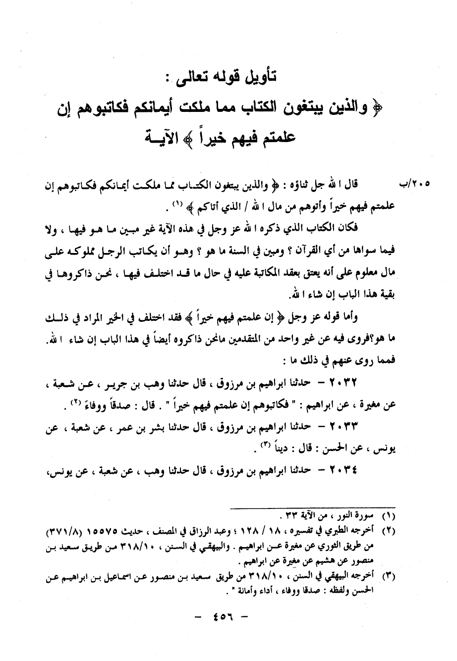 2032 - حَدَّثَنَا إِبْرَاهِيمُ بْنُ مَرْزُوقٍ، قَالَ: حَدَّثَنَا وَهْبُ بْنُ جَرِيرٍ، عَنْ شُعْبَةَ، عَنْ مُغِيرَةَ، عَنْ إِبْرَاهِيمَ، " {فَكَاتِبُوهُمْ إِنْ عَلِمْتُمْ فِيهِمْ خَيْرًا} ، قَالَ: صِدْقًا وَوَفَاءً "