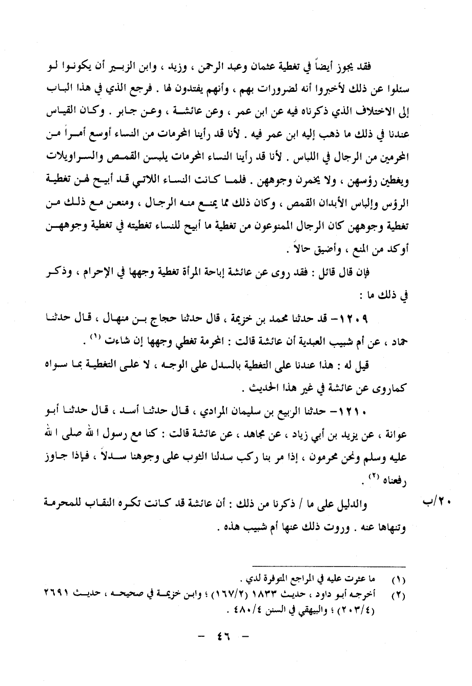 1209 - قَدْ حَدَّثَنَا مُحَمَّدُ بْنُ خُزَيْمَةَ، قَالَ: حَدَّثَنَا حَجَّاجُ بْنُ مِنْهَالٍ، قَالَ: حَدَّثَنَا حَمَّادٌ، عَنْ أُمِّ شَبِيبٍ الْعَبْدِيَّةِ، أَنَّ عَائِشَةَ، قَالَتِ: " الْمُحْرِمَةُ تُغَطِّي وَجْهَهَا إِنْ شَاءَتْ " قِيلَ لَهُ: هَذَا عِنْدَنَا عَلَى التَّغْطِيَةِ بِالسَّدْلِ عَلَى الْوَجْهِ، لَا عَلَى التَّغْطِيَةِ بِمَا سِوَاهُ كَمَا رُوِيَ عَنْ عَائِشَةَ فِي غَيْرِ هَذَا الْحَدِيثِ