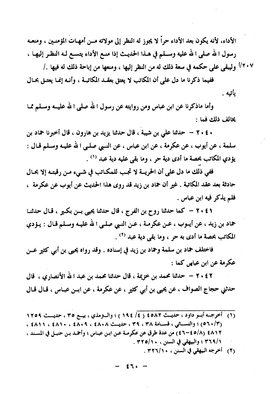2040 - حَدَّثَنَا عَلِيُّ بْنُ شَيْبَةَ، قَالَ: حَدَّثَنَا يَزِيدُ بْنُ هَارُونَ، قَالَ: أَخْبَرَنَا حَمَّادُ بْنُ سَلَمَةَ، عَنْ أَيُّوبَ، عَنْ عِكْرِمَةَ، عَنِ ابْنِ عَبَّاسٍ، عَنِ النَّبِيِّ صَلَّى اللَّهُ عَلَيْهِ وَسَلَّمَ، قَالَ: " يُؤَدِّي الْمُكَاتَبُ بِحِصَّةِ مَا أَدَّى، دِيَةَ حُرٍّ، وَمَا بَقِيَ عَلَيْهِ، دِيَةَ الْعَبْدِ " فَفِي ذَلِكَ مَا دَلَّ عَلَى أَنَّ الْحُرِّيَّةَ لَا تَجِبُ لِلْمُكَاتَبِ فِي شَيْءٍ مِنْ رَقَبَتِهِ إِلا بِحَالٍ حَادِثَةٍ بَعْدَ عَقْدِ الْمُكَاتَبَةِ غَيْرَ أَنَّ حَمَّادَ بْنَ زَيْدٍ قَدْ رَوَى هَذَا الْحَدِيثَ عَنْ أَيُّوبَ، عَنْ عِكْرِمَةَ، فَلَمْ يَذْكُرْ فِيهِ ابْنَ عَبَّاسٍ
