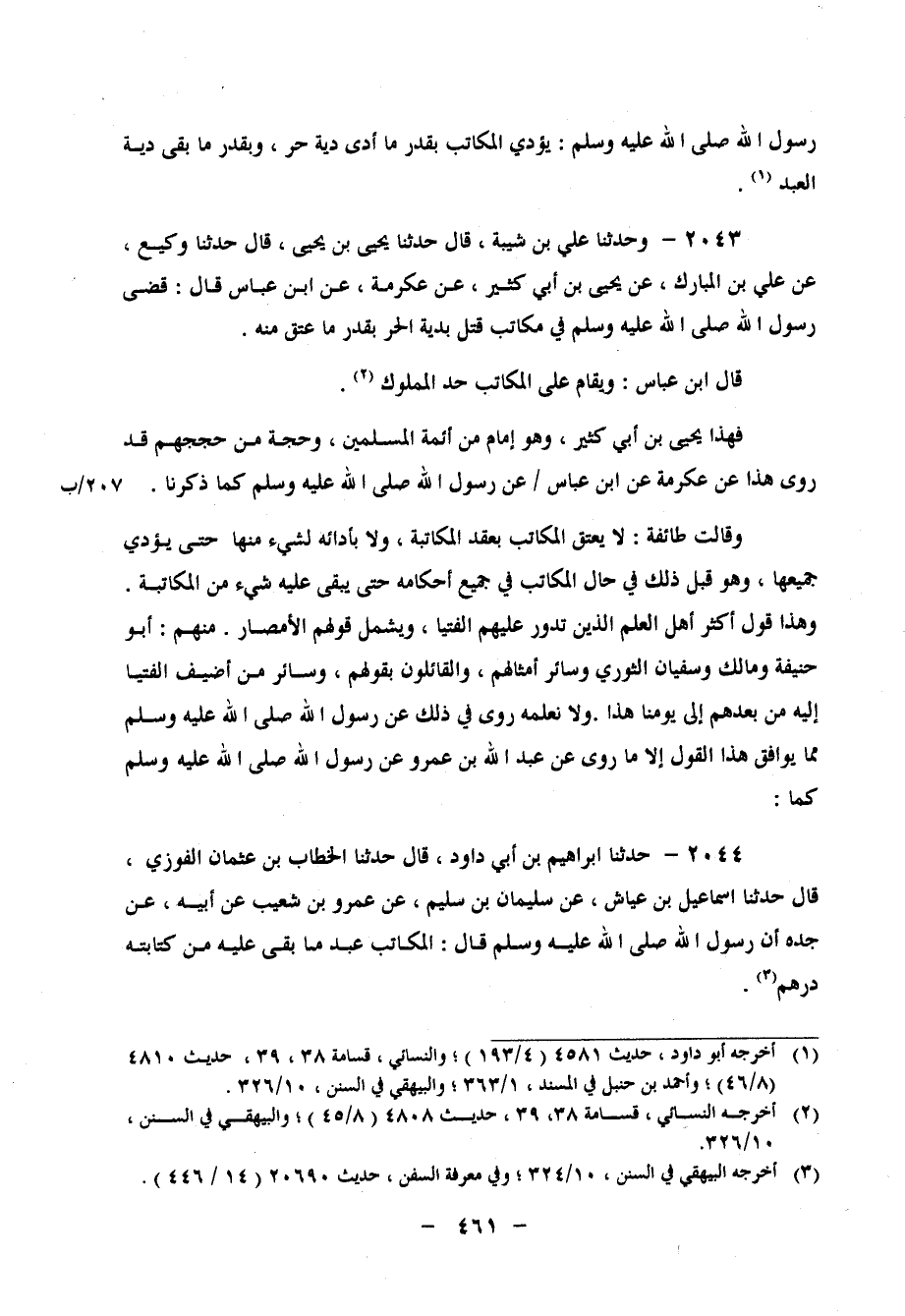 2043 - وَحَدَّثَنَا عَلِيُّ بْنُ شَيْبَةَ، قَالَ: حَدَّثَنَا يَحْيَى بْنُ يَحْيَى، قَالَ: حَدَّثَنَا وَكِيعٌ، عَنْ عَلِيِّ بْنِ الْمُبَارَكِ، عَنْ يَحْيَى بْنِ أَبِي كَثِيرٍ، عَنْ عِكْرِمَةَ، عَنِ ابْنِ عَبَّاسٍ، قَالَ: " قَضَى رَسُولُ اللهِ صَلَّى اللَّهُ عَلَيْهِ وَسَلَّمَ فِي مُكَاتَبٍ قُتِلَ بِدِيَةِ الْحُرِّ بِقَدْرِ مَا عَتَقَ مِنْهُ " قَالَ ابْنُ عَبَّاسٍ: " وَيُقَامُ عَلَى الْمُكَاتَبِ حَدُّ الْمَمْلُوكِ " فَهَذَا يَحْيَى بْنُ أَبِي كَثِيرٍ، وَهُوَ إِمَامُ أَئِمَّةِ الْمُسْلِمِينَ، وَحُجَّةٌ مِنْ حُجَجِهِمْ قَدْ رَوَى هَذَا عَنْ عِكْرِمَةَ، عَنِ ابْنِ عَبَّاسٍ، عَنْ رَسُولِ اللهِ صَلَّى اللَّهُ عَلَيْهِ وَسَلَّمَ كَمَا ذَكَرْنَا وَقَالَتْ طَائِفَةٌ: لَا يُعْتَقُ الْمُكَاتَبُ بَعْدَ الْمُكَاتَبَةِ، وَلا بِأَدَائِهِ لِشَيْءٍ مِنْهُ حَتَّى يُؤَدِّيَ جَمِيعَهَا، وَهُوَ قَبَلَ ذَلِكَ فِي حَالِ الْمُكَاتَبِ فِي جَمِيعِ أَحْكَامِهِ حَتَّى يَبْقَى عَلَيْهِ شَيْءٌ مِنَ الْمُكَاتَبَةِ وَهَذَا قَوْلُ أَكْثَرِ أَهْلِ الْعِلْمِ الَّذِينَ تَدُورُ عَلَيْهِمُ الْفُتْيَا، وَيَشْمَلُ قَوْلَهُمُ الأَمْصَارَ مِنْهُمْ أَبُو حَنِيفَةَ، وَمَالِكٌ، وَسُفْيَانُ الثَّوْرِيُّ، وَسَائِرُ أَمْثَالِهِمْ، وَالْقَائِلُونَ بِقَوْلِهِمْ، وَسَائِرِ مَنْ أُضِيفَ الْفُتْيَا إِلَيْهِ مِنْ بَعْدِهِمْ إِلَى يَوْمِنَا هَذَا وَلا نَعْلَمُهُ رُوِيَ فِي ذَلِكَ عَنْ رَسُولِ اللهِ صَلَّى اللَّهُ عَلَيْهِ وَسَلَّمَ مِمَّا يُوَافِقُ هَذَا الْقَوْلَ إِلا مَا رُوِيَ عَنْ عَبْدِ اللهِ بْنِ عَمْرٍو، عَنْ رَسُولِ اللهِ صَلَّى اللَّهُ عَلَيْهِ وَسَلَّمَ كَمَا