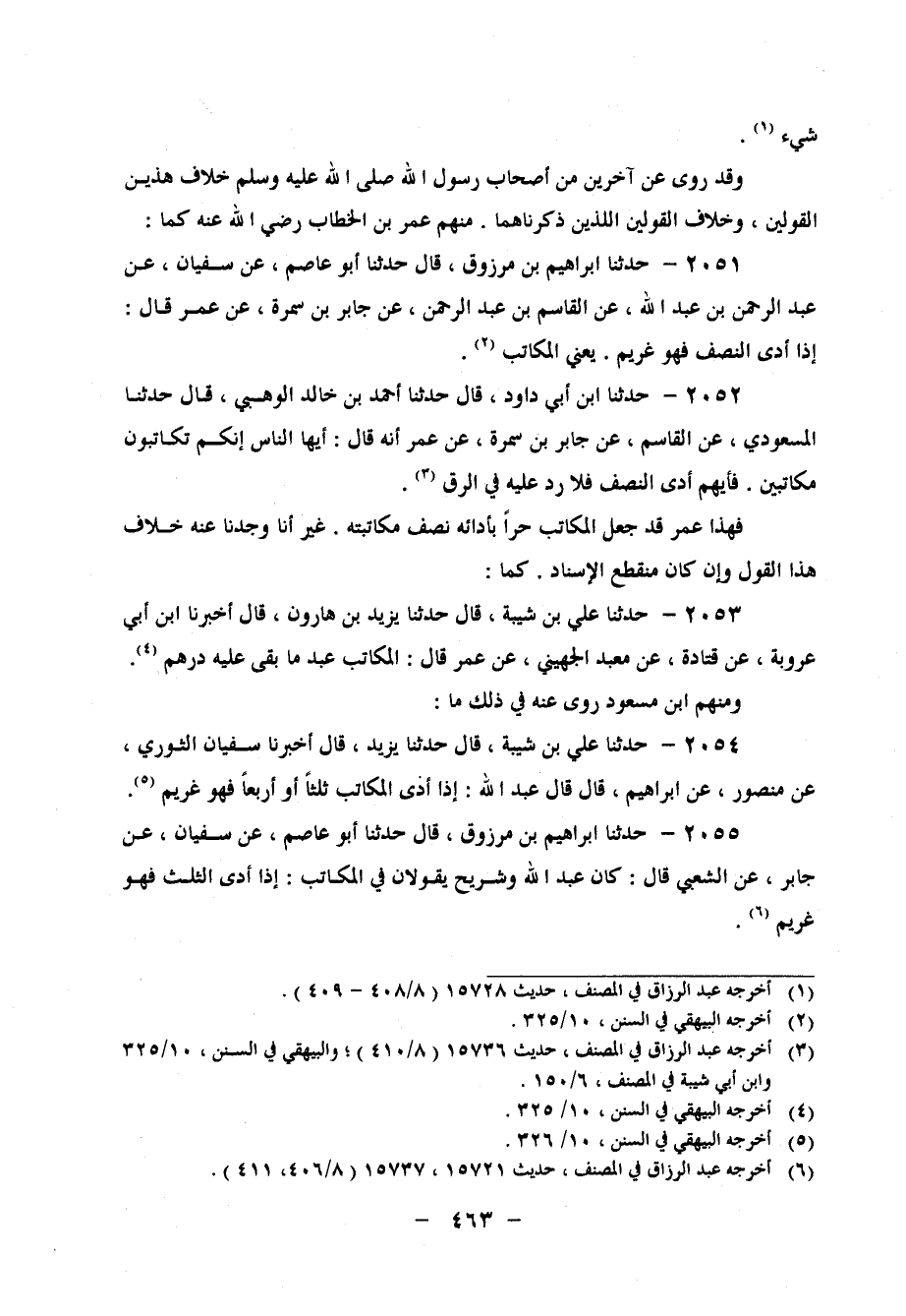 2051 - حَدَّثَنَا إِبْرَاهِيمُ بْنُ مَرْزُوقٍ، قَالَ: حَدَّثَنَا أَبُو عَاصِمٍ، عَنْ سُفْيَانَ، عَنْ عَبْدِ الرَّحْمَنِ بْنِ عَبْدِ اللهِ، عَنِ الْقَاسِمِ بْنِ عَبْدِ الرَّحْمَنِ، عَنْ جَابِرِ بْنِ سَمُرَةَ، عَنْ عُمَرَ، قَالَ: " إِذَا أَدَّى النِّصْفَ فَهُوَ غَرِيمٌ "، يَعْنِي الْمُكَاتَبَ