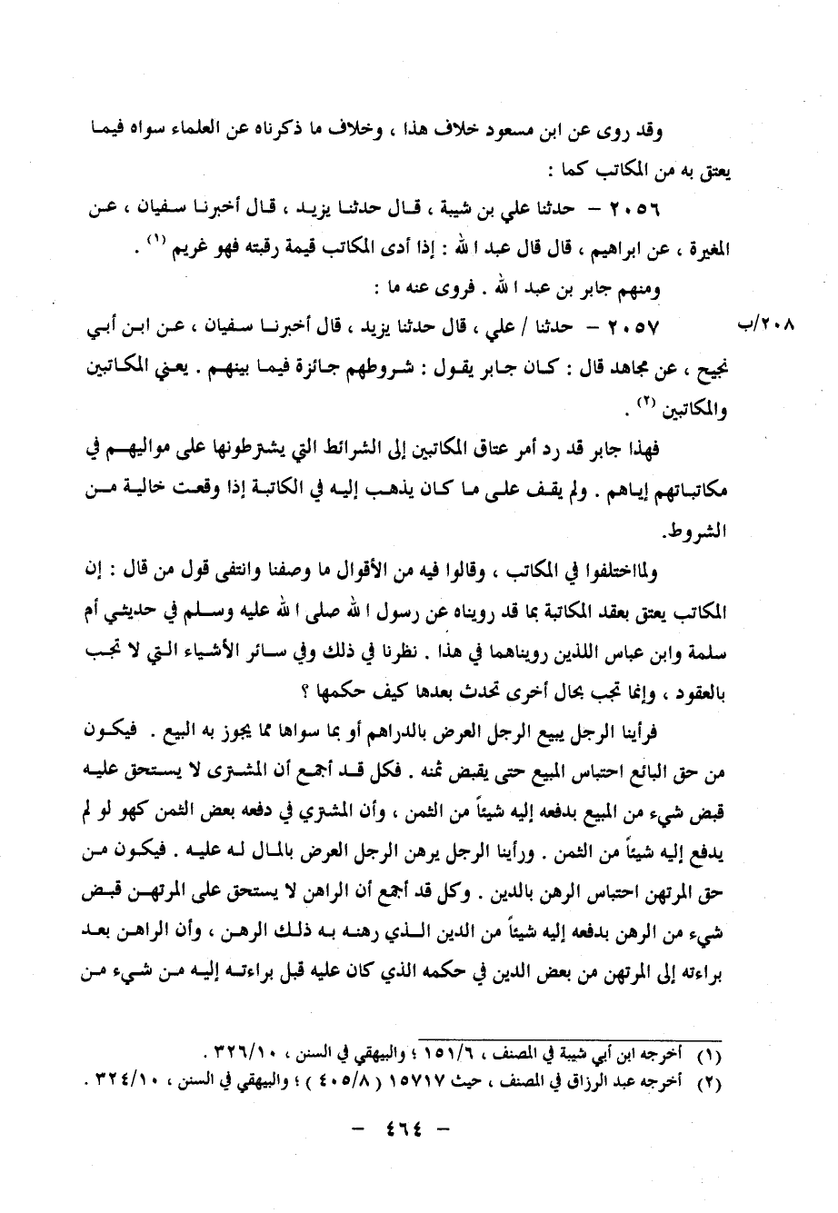 2057 - حَدَّثَنَا عَلِيٌّ، قَالَ: حَدَّثَنَا يَزِيدُ، قَالَ: أَخْبَرَنَا سُفْيَانُ، عَنِ ابْنِ أَبِي نَجِيحٍ، عَنْ مُجَاهِدٍ، قَالَ: كَانَ جَابِرٌ، يَقُولُ: " شُرُوطُهُمْ جَائِزَةٌ فِيمَا بَيْنَهُمْ "، يَعْنِي الْمُكَاتِبِينَ وَالْمُكَاتَبِينَ فَهَذَا جَابِرٌ قَدْ رَدَّ أَمْرَ عَتَاقِ الْمُكَاتَبِينِ إِلَى الشَّرَائِطِ الَّتِي يَشْتَرِطُونَهَا عَلَى مَوَالِيهِمْ فِي مُكَاتَبَاتِهِمْ إِيَّاهُمْ وَلَمْ يَقِفْ عَلَى مَا كَانَ يُذْهَبُ إِلَيْهِ فِي الْمُكَاتَبَةِ إِذَا وَقَعَتْ خَالِيَةً مِنَ الشُّرُوطِ وَلَمَّا اخْتَلَفُوا فِي الْمُكَاتَبِ، وَقَالُوا فِيهِ مِنَ الأَقْوَالِ مَا وَصَفْنَا، وَانْتَفَى قَوْلُ مَنْ قَالَ: إِنَّ الْمُكَاتَبَ يُعْتَقُ بِعَقْدِ الْمُكَاتَبَةِ بِمَا قَدْ رُوِّينَاهُ عَنْ رَسُولِ اللهِ صَلَّى اللَّهُ عَلَيْهِ وَسَلَّمَ فِي حَدِيثَيْ أُمِّ سَلَمَةَ، وَابْنِ عَبَّاسٍ اللَّذَيْنِ رُوِّينَاهُمَا فِي هَذَا، نَظَرْنَا فِي ذَلِكَ وَفِي سَائِرِ الأَشْيَاءِ الَّتِي لَا تَجِبُ بِالْعُقُودِ، وَإِنَّمَا تَجِبُ بِحَالٍ أُخْرَى تَحْدُثُ بَعْدَهَا، كَيْفَ حُكْمُهَا؟ فَرَأَيْنَا الرَّجُلَ يَبِيعُ الرَّجُلَ الْعَرَضَ بِالدَّرَاهِمِ أَوْ بِمَا سِوَاهَا مِمَّا يَجُوزُ بِهِ الْبَيْعُ، فَيَكُونُ مِنْ حَقِّ الْبَائِعِ احْتِبَاسُ الْمَبِيعِ حَتَّى يَقْبِضَ ثَمَنَهُ، فَكُلٌّ قَدْ أَجْمَعَ أَنَّ الْمُشْتَرِيَ لَا يَسْتَحِقُّ عَلَيْهِ قَبْضَ شَيْءٍ مِنَ الْمَبِيعِ بِدَفْعِهِ إِلَيْهِ شَيْئًا مِنَ الثَّمَنِ، وَأَنَّ الْمُشْتَرِيَ فِي دَفْعِهِ بَعْضَ الثَّمَنِ كَهُوَ لَوْ لَمْ يَدْفَعْ إِلَيْهِ شَيْئًا مِنَ الثَّمَنِ وَرَأَيْنَا الرَّجُلَ يَرْهَنُ الرَّجُلَ الْعَرَضَ بِالْمَالِ لَهُ عَلَيْهِ، فَيَكُونُ مِنْ حَقِّ الْمُرْتَهِنِ احْتِبَاسُ الرَّهْنِ بِالدَّيْنِ