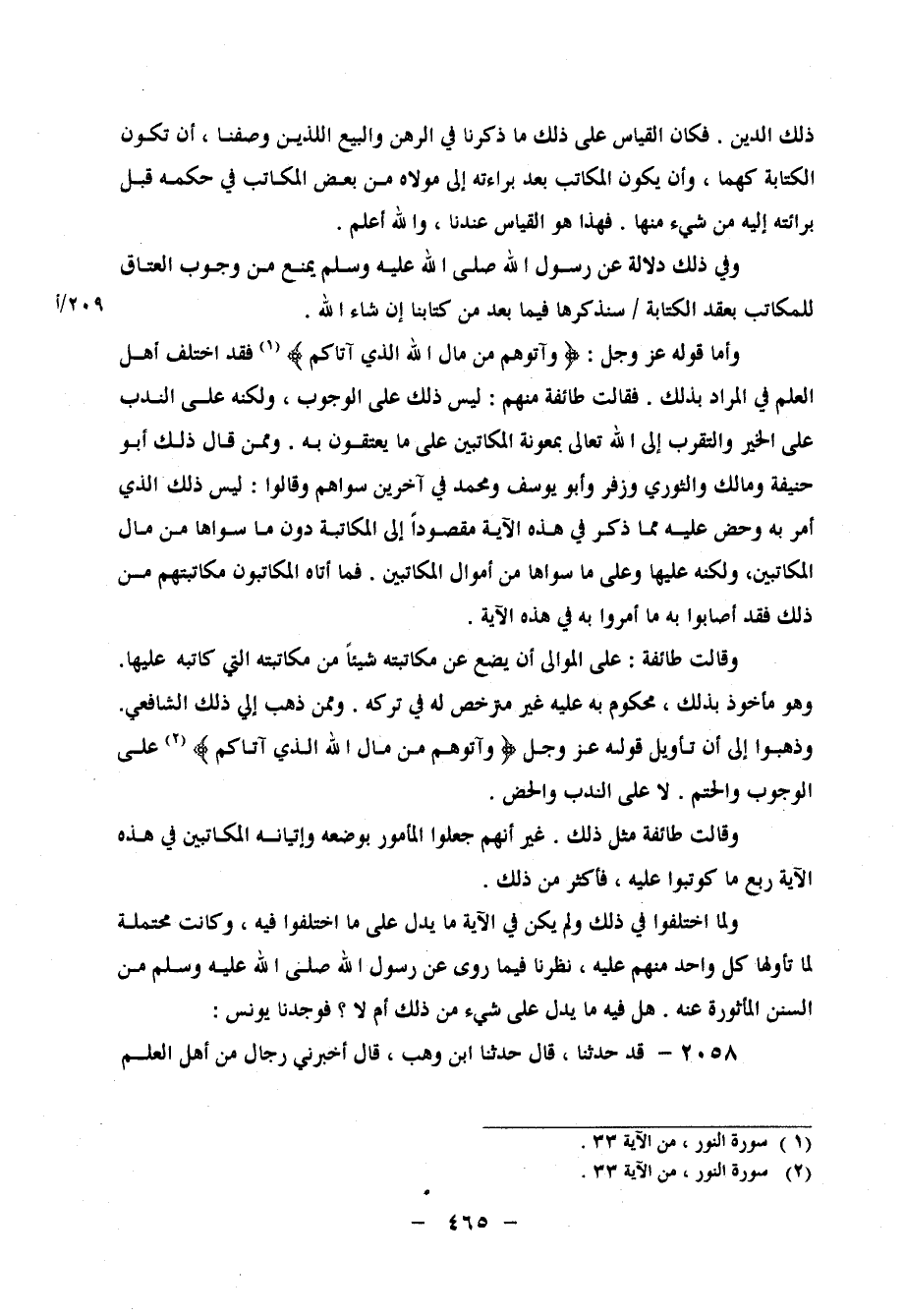 عَلَيْهِ غَيْرُ مُتَرَخَّصٍ لَهُ فِي تَرْكِهِ وَمِمَّنْ ذَهَبَ إِلَى ذَلِكَ الشَّافِعِيُّ وَذَهَبُوا إِلَى تَأْوِيلِ قَوْلِهِ عَزَّ وَجَلَّ: {وَآتُوهُمْ مِنْ مَالِ اللهِ الَّذِي آتَاكُمْ} عَلَى الْوُجُوبِ وَالْحَتْمِ، لَا عَلَى النَّدْبِ وَالْحَضِّ وَقَالَتْ طَائِفَةٌ مِثْلَ ذَلِكَ، غَيْرَ أَنَّهُمْ جَعَلُوا الْمَأْمُورَ بِوَضْعِهِ وَإِتْيَانِهِ الْمُكَاتَبِينَ فِي هَذِهِ الآيَةِ رُبُعَ مَا كُوتِبُوا عَلَيْهِ، فَأَكْثَرَ مِنْ ذَلِكَ وَلَمَّا اخْتَلَفُوا فِي ذَلِكَ، وَلَمْ يَكُنْ فِي الآيَةِ مَا يَدُلُّ عَلَى مَا اخْتَلَفُوا فِيهِ، وَكَانَتْ مُحْتَمِلَةً لِمَا تَأَوَّلَهَا كُلُّ وَاحِدٍ مِنْهُمْ عَلَيْهِ، نَظَرْنَا فِيمَا رُوِيَ عَنْ رَسُولِ اللهِ صَلَّى اللَّهُ عَلَيْهِ وَسَلَّمَ مِنَ السُّنَنِ الْمَأْثُورَةِ عَنْهُ، هَلْ فِيهِ مَا يَدُلُّ عَلَى شَيْءٍ مِنْ ذَلِكَ أَمْ لَا؟