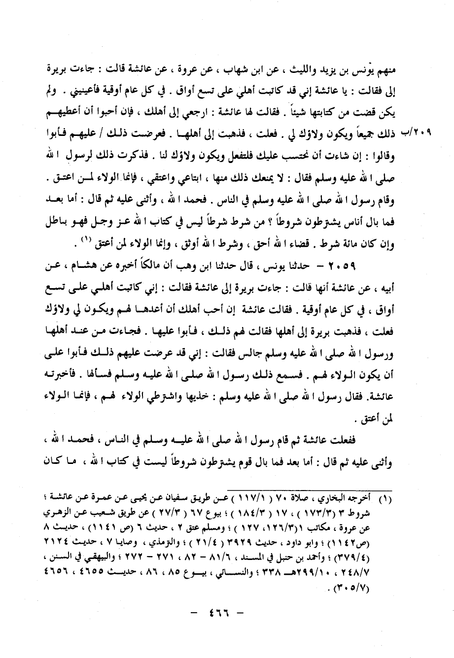 مِنْهُمْ يُونُسُ بْنُ يَزِيدَ، وَاللَّيْثُ، عَنِ ابْنِ شِهَابٍ، عَنْ عُرْوَةَ، عَنْ عَائِشَةَ، قَالَتْ: جَاءَتْ بَرِيرَةُ إِلَيَّ، فَقَالَتْ: يَا عَائِشَةُ، إِنِّي قَدْ كَاتَبْتُ أَهْلِي عَلَى تِسْعِ أَوَاقٍ، فِي كُلِّ عَامٍ أُوقِيَّةٌ، فَأَعِينِينِي وَلَمْ تَكُنْ قَضَتْ مِنْ كِتَابَتِهَا شَيْئًا، فَقَالَتْ لَهَا عَائِشَةُ: ارْجِعِي إِلَى أَهْلِكِ، فَإِنْ أَحَبُّوا أَنْ أُعْطِيَهُمْ ذَلِكَ جَمِيعًا وَيَكُونُ وَلاؤُكِ لِي، فَعَلْتُ، فَذَهَبَتْ إِلَى أَهْلِهَا، فَعَرَضَتْ ذَلِكَ عَلَيْهِمْ، فَأَبَوْا وَقَالُوا: إِنْ شَاءَتْ أَنْ تَحْتَسِبَ عَلَيْكِ فَلْتَفْعَلْ، وَيَكُونُ وَلاؤُكِ لَنَا فَذَكَرْتُ ذَلِكَ لِرَسُولِ اللهِ صَلَّى اللَّهُ عَلَيْهِ وَسَلَّمَ، فَقَالَ: " لَا يَمْنَعُكِ ذَلِكَ مِنْهَا، ابْتَاعِي وَأَعْتِقِي، فَإِنَّمَا الْوَلاءُ لِمَنْ أَعْتَقَ " وَقَامَ رَسُولُ اللهِ صَلَّى اللَّهُ عَلَيْهِ وَسَلَّمَ فِي النَّاسِ، فَحَمِدَ اللهَ، وَأَثْنَى عَلَيْهِ، ثُمَّ قَالَ: " أَمَّا بَعْدُ، فَمَا بَالُ أُنَاسٍ يَشْتَرِطُونَ شُرُوطًا؟ مَنْ شَرَطَ شَرْطًا لَيْسَ فِي كِتَابِ اللهِ عَزَّ وَجَلَّ فَهُوَ بَاطِلٌ وَإِنْ كَانَ مِائَةَ شَرْطٍ، قَضَاءُ اللهِ أَحَقُّ، وَشَرْطُ اللهِ أَوْثَقُ، وَإِنَّمَا الْوَلاءُ لِمَنْ أَعْتَقَ "