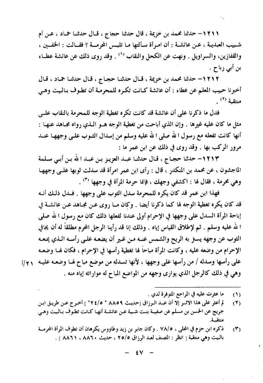 1212 - حَدَّثَنَا مُحَمَّدُ بْنُ خُزَيْمَةَ، قَالَ: حَدَّثَنَا حَجَّاجٌ، قَالَ: حَدَّثَنَا حَمَّادٌ، قَالَ: أَخْبَرَنَا حَبِيبٌ الْمُعَلِّمُ، عَنْ عَطَاءٍ، " أَنَّ عَائِشَةَ كَانَتْ تَكْرَهُ لِلْمُحْرِمَةِ أَنْ تَطُوفَ بِالْبَيْتِ وَهِيَ مُنْتَقِبَةٌ " فَدَلَّ مَا ذَكَرْنَاهُ عَلَى أَنَّ عَائِشَةَ قَدْ كَانَتْ تَكْرَهُ تَغْطِيَةَ الْوَجْهِ لِلْمُحْرِمَةِ بِالنِّقَابِ عَلَى مِثْلِ مَا كَانَ عَلَيْهِ غَيْرُهَا، وَأَنَّ الَّذِي أَبَاحَتْ مِنْ تَغْطِيَةِ الْوَجْهِ هُوَ الَّذِي رَوَاهُ مُجَاهِدٌ عَنْهَا، أَنَّهَا كَانَتْ تَفْعَلُهُ مَعَ رَسُولِ اللهِ صَلَّى اللَّهُ عَلَيْهِ وَسَلَّمَ مِنْ إِسْدَالِ الثَّوْبِ عَلَى وَجْهِهَا عِنْدَ مُرُورِ الرَّكْبِ بِهَا وَقَدْ رُوِيَ فِي ذَلِكَ عَنِ ابْنِ عُمَرَ مَا