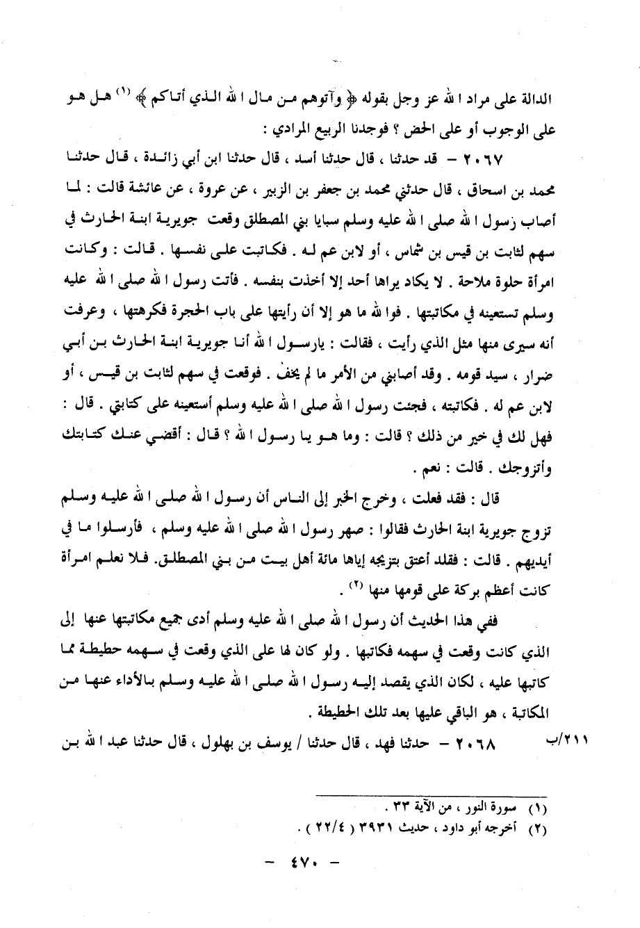 2067 - الرَّبِيعُ الْمُرَادِيُّ، قَدْ حَدَّثَنَا، قَالَ: حَدَّثَنَا أَسَدٌ، قَالَ: حَدَّثَنَا ابْنُ أَبِي زَائِدَةَ، قَالَ: حَدَّثَنَا مُحَمَّدُ بْنُ إِسْحَاقَ، قَالَ: حَدَّثَنِي مُحَمَّدُ بْنُ جَعْفَرِ بْنِ الزُّبَيْرِ، عَنْ عُرْوَةَ، عَنْ عَائِشَةَ، قَالَتْ: لَمَّا أَصَابَ رَسُولُ اللهِ صَلَّى اللَّهُ عَلَيْهِ وَسَلَّمَ سَبَايَا بَنِي الْمُصْطَلِقِ وَقَعَتْ جُوَيْرِيَةُ ابْنَةُ الْحَارِثِ فِي سَهْمٍ لِثَابِتِ بْنِ قَيْسِ بْنِ شَمَّاسٍ، أَوْ لابْنِ عَمٍّ لَهُ، فَكَاتَبَتْ عَلَى نَفْسِهَا قَالَتْ: وَكَانَتِ امْرَأَةً حُلْوَةً مَلاحَةً لَا يَكَادُ يَرَاهَا أَحَدٌ إِلا أَخَذَتْ بِنَفْسِهِ، فَأَتَتْ رَسُولَ اللهِ صَلَّى اللَّهُ عَلَيْهِ وَسَلَّمَ تَسْتَعِينُهُ فِي مُكَاتَبَتِهَا، فَوَاللهِ مَا هُوَ إِلا أَنْ رَأَيْتُهَا عَلَى بَابِ الْحُجْرَةِ فَكَرِهْتُهَا، وَعَرِفْتُ أَنَّهُ سَيَرَى مِنْهَا مِثْلَ الَّذِي رَأَيْتُ، فَقَالَتْ: يَا رَسُولَ اللهِ، أَنَا جُوَيْرِيَةُ ابْنَةُ الْحَارِثِ بْنِ أَبِي ضِرَارٍ، سَيِّدِ قَوْمِهِ، وَقَدْ أَصَابَنِي مِنَ الأَمْرِ مَا لَمْ يَخْفَ، فَوَقَعْتُ فِي سَهْمٍ لِثَابِتِ بْنِ قَيْسٍ، أَوْ لابْنِ عَمٍّ لَهُ، فَكَاتَبْتُهُ، فَجِئْتُ رَسُولَ اللهِ صَلَّى اللَّهُ عَلَيْهِ وَسَلَّمَ أَسْتَعِينُهُ عَلَى كِتَابَتِي قَالَ: " فَهَلْ لَكِ فِي خَيْرٍ مِنْ ذَلِكَ " قَالَتْ: وَمَا هُوَ يَا رَسُولَ اللهِ؟ قَالَ: " أَقْضِي عَنْكِ كِتَابَتَكِ وَأَتَزَوَّجُكِ " قَالَتْ: نَعَمْ قَالَ: " فَقَدْ فَعَلْتُ " وَخَرَجَ الْخَبَرُ إِلَى النَّاسِ أَنَّ رَسُولَ اللهِ صَلَّى اللَّهُ عَلَيْهِ وَسَلَّمَ تَزَوَّجَ جُوَيْرِيَةَ ابْنَةَ الْحَارِثِ، فَقَالُوا: صِهْرُ رَسُولِ اللهِ صَلَّى اللَّهُ عَلَيْهِ وَسَلَّمَ، فَأَرْسَلُوا مَا فِي أَيْدِيهِمْ قَالَتْ: فَلَقَدْ أَعْتَقَ بِتَزْوِيجِهِ إِيَّاهَا مِائَةَ أَهْلِ بَيْتٍ مِنْ بَنِي الْمُصْطَلِقِ، فَلا نَعْلَمُ امْرَأَةً كَانَتْ أَعْظَمَ بَرَكَةً عَلَى قَوْمِهَا مِنْهَا
