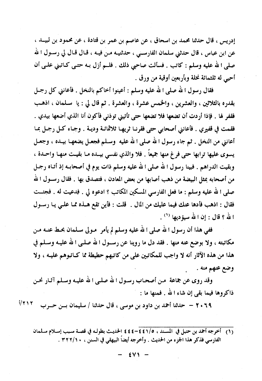 إِدْرِيسَ، قَالَ: حَدَّثَنَا مُحَمَّدُ بْنُ إِسْحَاقَ، عَنْ عَاصِمِ بْنِ عُمَرَ بْنِ قَتَادَةَ، عَنْ مَحْمُودِ بْنِ لَبِيدٍ، عَنِ ابْنِ عَبَّاسٍ، قَالَ: حَدَّثَنِي سُلَمَانُ الْفَارِسِيُّ، حَدَّثَنِيهُ مِنْ فِيهِ، قَالَ: قَالَ لِي رَسُولُ اللهِ صَلَّى اللَّهُ عَلَيْهِ وَسَلَّمَ: " كَاتِبْ " فَسَأَلْتُ صَاحِبِي ذَلِكَ، فَلَمْ أَزَلْ بِهِ حَتَّى كَاتَبَنِي عَلَى أَنْ أُحْيِيَ لَهُ ثَلاثَ مِائَةِ نَخْلَةٍ وَبِأَرْبَعِينَ أُوقِيَّةً مِنْ وَرِقٍ، فَقَالَ رَسُولُ اللهِ صَلَّى اللَّهُ عَلَيْهِ وَسَلَّمَ: " أَعِينُوا أَخَاكُمْ بِالنَّخْلِ " فَأَعَانَنِي كُلُّ رَجُلٍ بِقَدْرِهِ بِالثَّلاثِينَ، وَالْعِشْرِينَ، وَالْخَمْسَةَ عَشَرَ، وَالْعَشْرَةِ، ثُمَّ قَالَ لِي: " يَا سَلْمَانُ، اذْهَبْ فَفَقِّرْ لَهَا، فَإِذَا أَرَدْتَ أَنْ تَضَعَهَا فَلا تَضَعْهَا حَتَّى تَأْتِيَنِي تُؤْذِنِّي، فَأَكُونُ أَنَا الَّذِي أَضَعُهَا بِيَدِي " فَقُمْتُ فِي فَقِيرِي، فَأَعَانَنِي أَصْحَابِي حَتَّى فَقَّرْنَا ثَرَاهَا ثَلاثَ مِائَةِ وَدِيَّةٍ، وَجَاءَ كُلُّ رَجُلٍ بِمَا أَعَانَنِي مِنَ النَّخْلِ، ثُمَّ جَاءَ رَسُولُ اللهِ صَلَّى اللَّهُ عَلَيْهِ وَسَلَّمَ فَجَعَلَ يَضَعُهَا بِيَدِهِ، وَجَعَلَ يُسَوِّي عَلَيْهَا تُرَابَهَا حَتَّى فَرَغَ مِنْهَا جَمِيعًا، فَلا وَالَّذِي نَفْسِي بِيَدِهِ، مَا بَقِيَتْ مِنْهَا وَاحِدَةٌ، وَبَقِيَتِ الدَّرَاهِمُ، فَبَيْنَا رَسُولُ اللهِ صَلَّى اللَّهُ عَلَيْهِ وَسَلَّمَ ذَاتَ يَوْمٍ فِي أَصْحَابِهِ إِذْ أَتَاهُ رَجُلٌ مِنْ أَصْحَابِهِ بِمِثْلِ الْبَيْضَةِ مِنْ ذَهَبٍ أَصَابَهَا مِنْ بَعْضِ الْمَعَادِنِ، فَتَصَدَّقَ بِهَا، فَقَالَ رَسُولُ اللهِ صَلَّى اللَّهُ عَلَيْهِ وَسَلَّمَ: " مَا فَعَلَ الْفَارِسِيُّ الْمِسْكِينُ الْمُكَاتَبُ؟ ادْعُوهُ لِي " فَدُعِيتُ لَهُ، فَجِئْتُ، فَقَالَ: " اذْهَبْ فَأَدِّهَا عَنْكَ فِيمَا عَلَيْكَ مِنَ الْمَالِ " قُلْتُ: فَأَيْنَ تَقَعُ هَذِهِ مِمَّا عَلَيَّ يَا رَسُولَ اللهِ، قَالَ: " إِنَّ اللهَ سَيُؤَدِّيهَا "