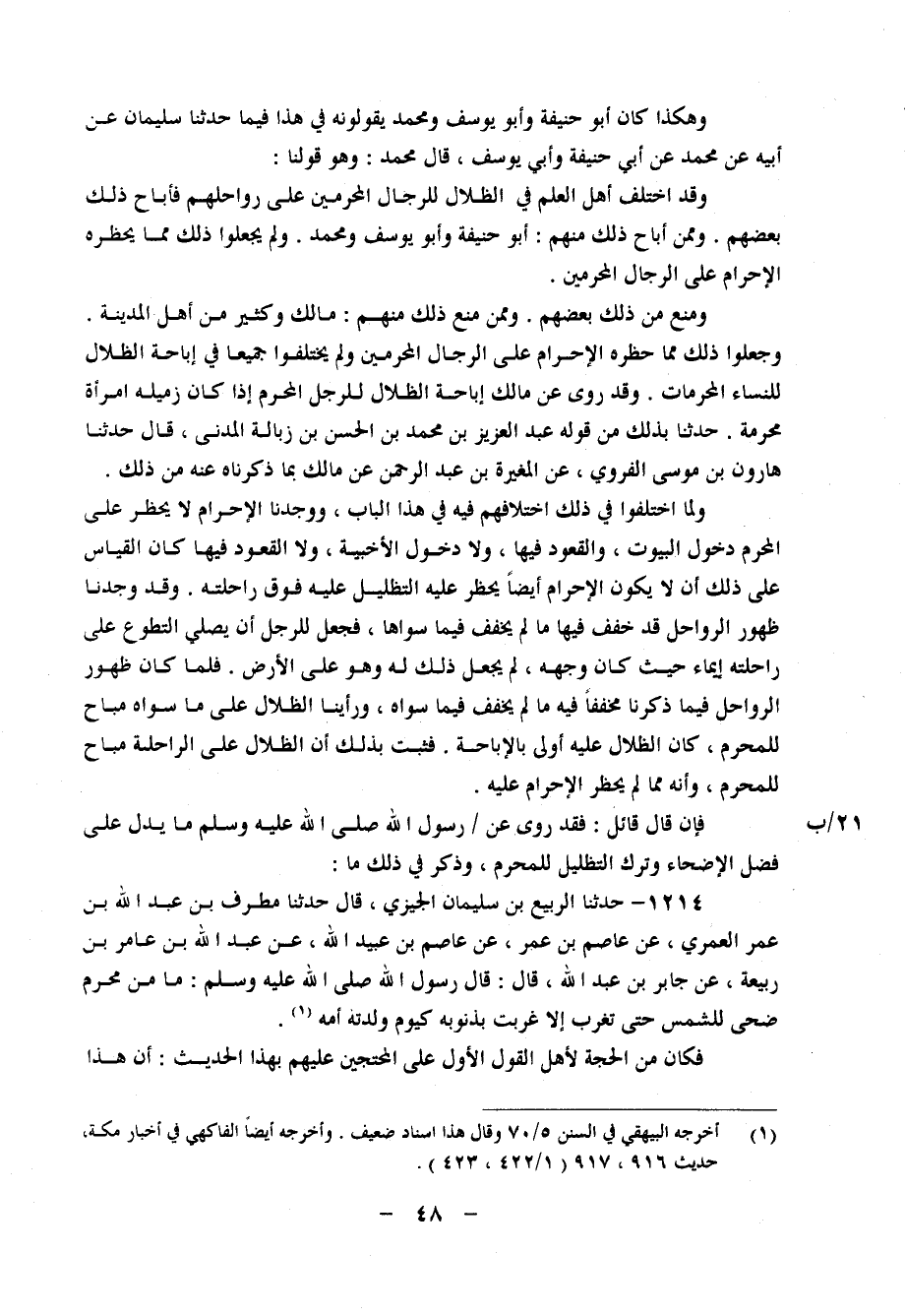 وَهَكَذَا كَانَ أَبُو حَنِيفَةَ، وَأَبُو يُوسُفَ، وَمُحَمَّدٌ يَقُولُونَهُ فِي هَذَا فِيمَا حَدَّثَنَا سُلَيْمَانُ، عَنْ أَبِيهِ، عَنْ مُحَمَّدٍ، عَنْ أَبِي حَنِيفَةَ، وَأَبِي يُوسُفَ قَالَ مُحَمَّدٌ: وَهُوَ قَوْلُنَا وَقَدِ اخْتَلَفَ أَهْلُ الْعِلْمِ فِي الظِّلَالِ لِلرِّجَالِ الْمُحْرِمِينَ عَلَى رَوَاحِلِهِمْ، فَأَبَاحَ ذَلِكَ بَعْضُهُمْ وَمِمَّنْ أَبَاحَ ذَلِكَ مِنْهُمْ: أَبُو حَنِيفَةَ، وَأَبُو يُوسُفَ، وَمُحَمَّدٌ، وَلَمْ يَجْعَلُوا ذَلِكَ مِمَّا يَحْظُرَهُ الْإِحْرَامُ عَلَى الرِّجَالِ الْمُحْرِمِينَ وَمَنَعَ مِنْ ذَلِكَ بَعْضُهُمْ وَمِمَّنْ مَنَعَ ذَلِكَ مِنْهُمْ: مَالِكٌ وَكَثِيرٌ مِنْ أَهْلِ الْمَدِينَةِ وَجَعَلُوا ذَلِكَ مِمَّا حَظَرَهُ الْإِحْرَامُ عَلَى الرِّجَالِ الْمُحْرِمِينَ، وَلَمْ يَخْتَلِفُوا جَمِيعًا فِي إِبَاحَةِ الظِّلَالِ لِلنِّسَاءِ الْمُحْرِمَاتِ، وَقَدْ رُوِيَ عَنْ مَالِكٍ إِبَاحَةُ الظِّلَالِ لِلرَّجُلِ الْمُحْرِمِ إِذَا كَانَ زَمِيلُهُ امْرَأَةً مُحْرِمَةً، حَدَّثَنَا بِذَلِكَ مِنْ قَوْلِهِ عَبْدُ الْعَزِيزِ بْنُ مُحَمَّدِ بْنِ الْحَسَنِ بْنِ زَبَالَةَ الْمَدَنِيُّ، قَالَ: حَدَّثَنَا هَارُونُ بْنُ مُوسَى الْفَرَوِيُّ، عَنِ الْمُغِيرَةِ بْنِ عَبْدِ الرَّحْمَنِ، عَنْ مَالِكٍ، بِمَا ذَكَرْنَاهُ عَنْهُ مِنْ ذَلِكَ وَلَمَّا اخْتَلَفُوا فِي ذَلِكَ اخْتِلَافَهُمْ فِيهِ فِي هَذَا الْبَابِ، وَوَجَدْنَا الْإِحْرَامَ لَا يَحْظُرَ عَلَى الْمُحْرِمِ دُخُولَ الْبُيُوتِ، وَالْقُعُودَ فِيهَا، وَلَا دُخُولَ الْأَخْبِيَةِ، وَلَا الْقُعُودَ فَيهَا، كَانَ الْقِيَاسُ عَلَى ذَلِكَ أَلا يَكُونَ الْإِحْرَامُ أَيْضًا يَحْظُرَ عَلَيْهِ التَّظْلِيلَ عَلَيْهِ فَوْقَ رَاحِلَتِهِ، وَقَدْ وَجَدْنَا ظُهُورَ الرَّوَاحِلِ قَدْ خُفِّفَ فِيهَا مَا لَمْ يُخَفَّفْ فِيمَا سِوَاهَا، فَجُعِلَ لِلرَّجُلِ أَنْ يُصَلِّي التَّطَوُّعَ عَلَى رَاحِلَتِهِ إِيمَاءً حَيْثُ كَانَ وَجْهُهُ، لَمْ يُجْعَلْ ذَلِكَ لَهُ