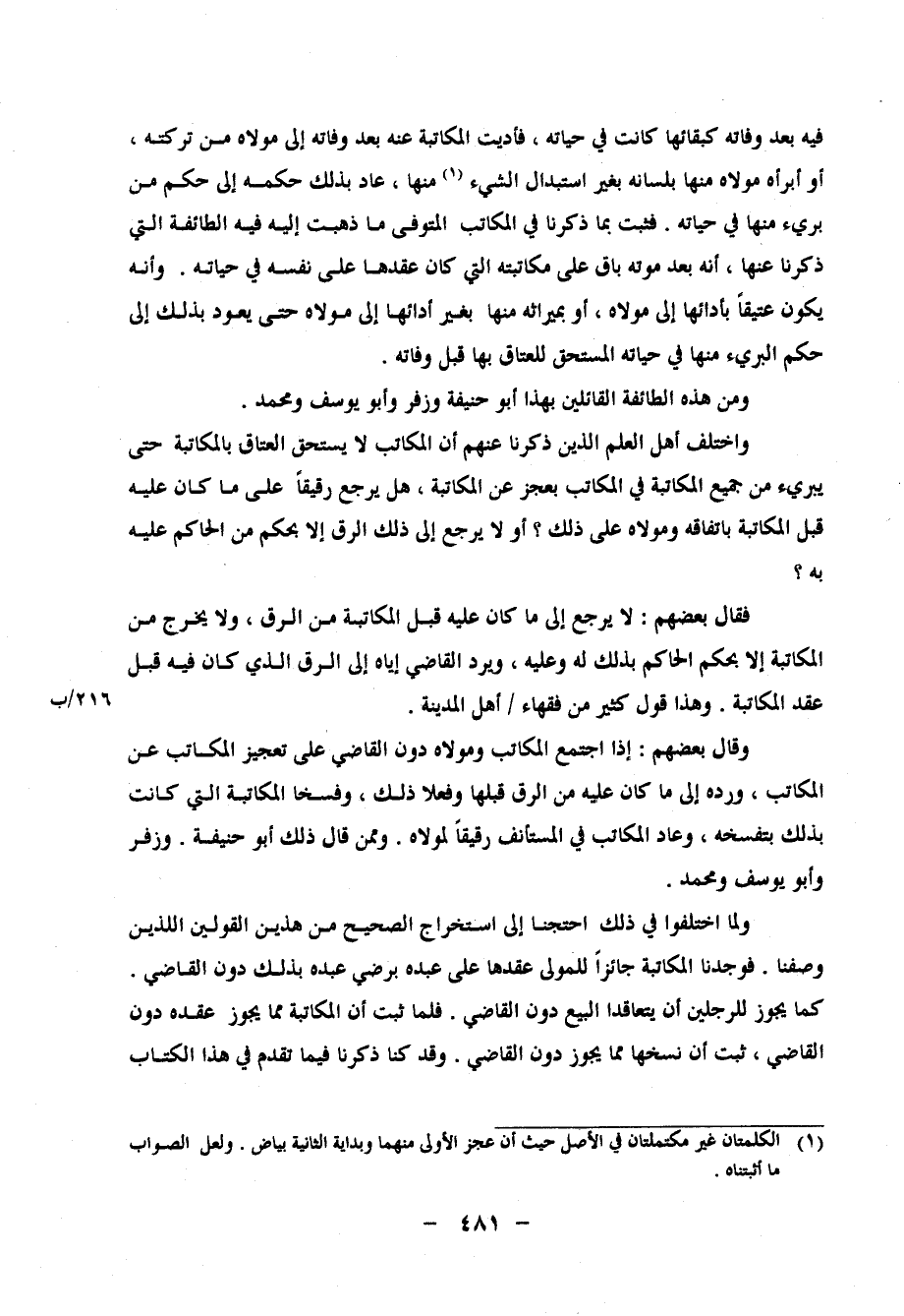 وَلما اخْتلفُوا فى ذَلِك احتجنا إِلَى اسْتِخْرَاج الصَّحِيح من هذَيْن الْقَوْلَيْنِ اللَّذين وَصفنَا. فَوَجَدنَا الْمُكَاتبَة جَائِزا للْمولى عقدهَا على عَبده برضى عَبده بذلك دون القاضى كَمَا يجوز للرجلين أَن يتعاقدا البيع دون القاضى.فَلَمَّا ثَبت أَن الْمُكَاتبَة مِمَّا يجوز عقده دون القَاضِي، ثَبت أَن نسخهَا مِمَّا يجوز دون القَاضِي. وَقد ذكرنَا فِيمَا تقدم فى هَذَا الْكتاب