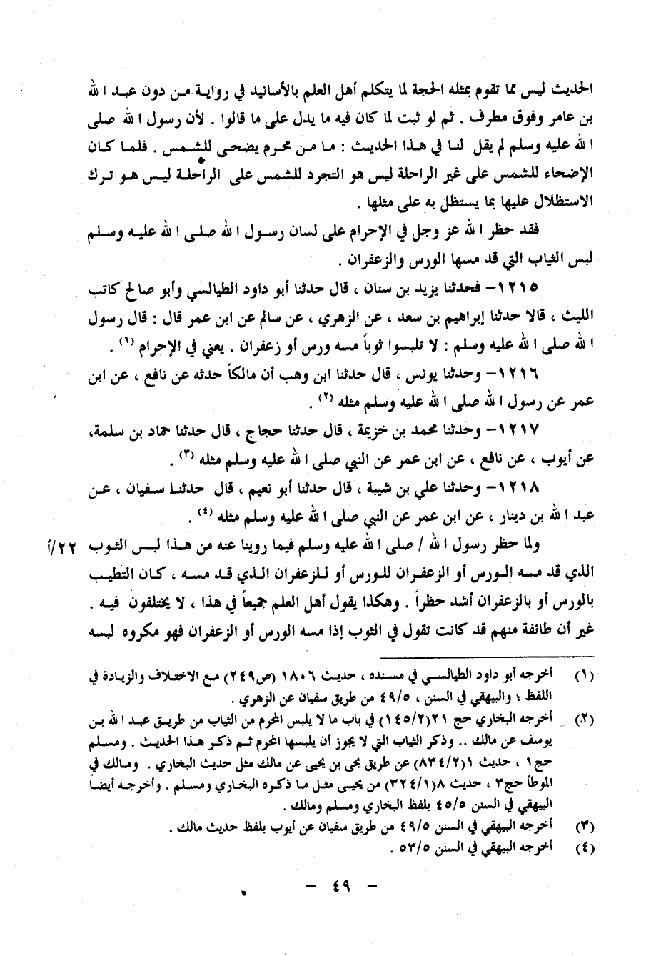 1218 - وَحَدَّثَنَا عَلِيُّ بْنُ شَيْبَةَ، قَالَ: حَدَّثَنَا أَبُو نُعَيْمٍ، قَالَ: حَدَّثَنَا سُفْيَانُ، عَنْ عَبْدِ اللهِ بْنِ دِينَارٍ، عَنِ ابْنِ عُمَرَ، عَنِ النَّبِيِّ صَلَّى اللَّهُ عَلَيْهِ وَسَلَّمَ، مِثْلَهُ وَلَمَّا حَظَرَ رَسُولُ اللهِ صَلَّى اللَّهُ عَلَيْهِ وَسَلَّمَ فِيمَا رُوِّينَا عَنْهُ مِنْ هَذَا الْبَابِ لُبْسَ الثَّوْبِ الَّذِي قَدْ مَسَّهُ الْوَرْسُ أَوِ الزَّعْفَرَانُ لِلْوَرْسِ أَوْ لِلزَّعْفَرَانِ الَّذِي قَدْ مَسَّهُ، كَانَ التَّطَيُّبُ بِالْوَرْسِ أَوْ بِالزَّعْفَرَانِ أَشَدَّ حَظْرًا، وَهَكَذَا يَقُولُ أَهْلُ الْعِلْمِ جَمِيعًا فِي هَذَا، لَا يَخْتَلِفُونَ فِيهِ، غَيْرَ أَنَّ طَائِفَةً مِنْهُمْ قَدْ كَانَتْ تَقُولُ فِي الثَّوْبِ إِذَا مَسَّهُ الْوَرْسُ أَوِ الزَّعْفَرَانُ فَهُوَ مَكْرُوهٌ لُبْسُهُ
