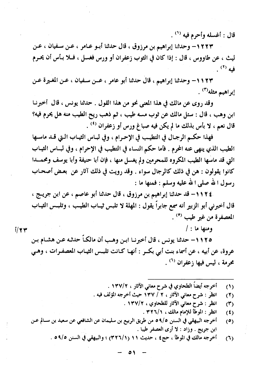 1225 - حَدَّثَنَا يُونُسُ، قَالَ: أَخْبَرَنَا ابْنُ وَهْبٍ، أَنَّ مَالِكًا، حَدَّثَهُ، عَنْ هِشَامِ بْنِ عُرْوَةَ، عَنْ أَبِيهِ، عَنْ أَسْمَاءَ بِنْتِ أَبِي بَكْرٍ، " أَنَّهَا كَانَتْ تَلْبَسُ الثِّيَابَ الْمُعَصْفَرَاتِ، وَهِيَ مُحْرِمَةٌ، لَيْسَ فِيهَا زَعْفَرَانُ "