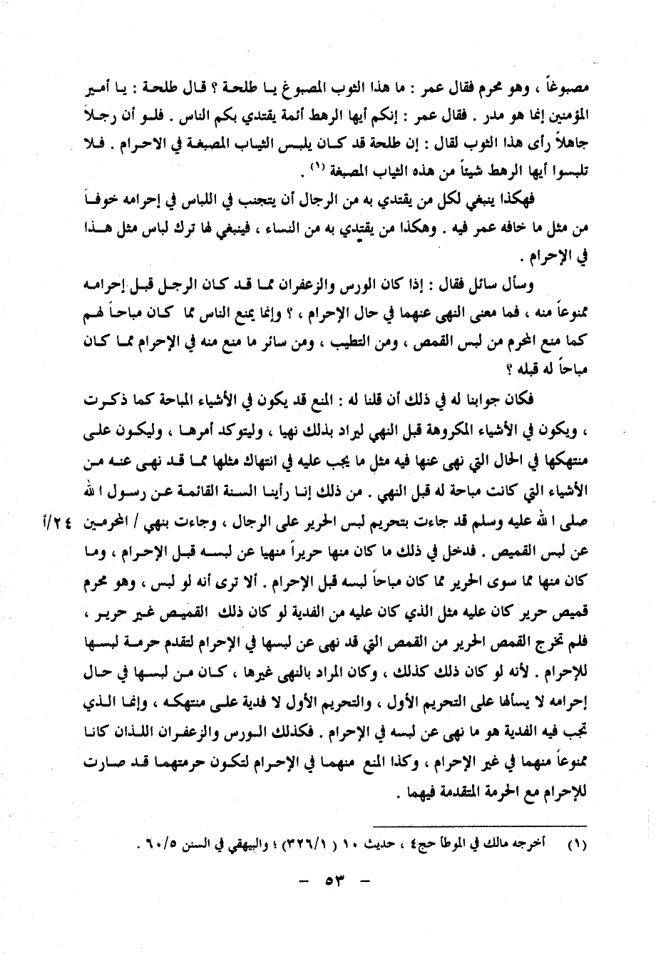 مَصْبُوغًا، وَهُوَ مُحْرِمٌ، فَقَالَ عُمَرُ: " مَا هَذَا الثَّوْبُ الْمَصْبُوغُ يَا طَلْحَةُ؟ " قَالَ طَلْحَةُ: يَا أَمِيرَ الْمُؤْمِنِينَ، إِنَّمَا هُوَ مَدَرٌ فَقَالَ عُمَرُ: " إِنَّكُمْ أَيُّهَا الرَّهْطُ أَئِمَّةٌ يَقْتَدَى بِكُمُ النَّاسُ، فَلَوْ أَنَّ رَجُلًا جَاهِلًا رَأَى هَذَا الثَّوْبَ لَقَالَ: إِنَّ طَلْحَةَ قَدْ كَانَ يَلْبَسُ الثِّيَابَ الْمُصْبَغَةَ فِي الْإِحْرَامِ، فَلَا تَلْبَسُوا أَيُّهَا الرَّهْطُ شَيْئًا مِنْ هَذِهِ الثِّيَابِ الْمُصْبَغَةِ " فَهَكَذَا يَنْبَغِي لِكُلِّ مَنْ يُقْتَدَى بِهِ مِنَ الرِّجَالِ أَنْ يَتَجَنَّبَ فِي اللِّبَاسِ فِي إِحْرَامِهِ خَوْفًا مِنْ مِثْلِ مَا خَافَهُ عُمَرُ فِيهِ وَهَكَذَا مَنْ يُقْتَدَى بِهِ مِنَ النِّسَاءِ، فَيَنْبَغِي لَهَا تَرْكُ لِبَاسِ مِثْلِ هَذَا فِي الْإِحْرَامِ وَسَأَلَ سَائِلٌ فَقَالَ: إِذَا كَانَ الْوَرْسُ وَالزَّعْفَرَانُ مِمَّا قَدْ كَانَ الرَّجُلُ قَبْلَ إِحْرَامِهِ مَمْنُوعًا فِيهِ، فَمَا مَعْنَى النَّهْيُ عَنْهُمَا فِي حَالِ الْإِحْرَامِ؟ وَإِنَّمَا يُمْنَعُ النَّاسُ مِمَّا كَانَ مُبَاحًا لَهُمْ كَمَا مُنِعَ الْمُحْرِمُ مِنْ لُبْسِ الْقُمُصِ، وَمِنَ التَّطَيُّبِ، وَمِنْ سَائِرِ مَا مُنِعَ مِنْهُ فِي الْإِحْرَامِ مِمَّا كَانَ مُبَاحًا لَهُ قَبْلَهُ؟ فَكَانَ جَوَابُنَا لَهُ فِي ذَلِكَ أَنْ قُلْنَا لَهُ: الْمَنْعُ قَدْ يَكُونُ فِي الْأَشْيَاءِ الْمُبَاحَةِ كَمَا ذَكَرْتَ، وَيَكُونُ فِي الْأَشْيَاءِ الْمَكْرُوهَةِ قَبْلَ النَّهْيِ لِيُرَادَ بِذَلِكَ نَهْيٌ، وَلِيَتَوَكَّدَ أَمْرُهَا، وَلِيَكُونَ عَلَى مَنْتَهِكِهَا فِي الْحَالِ الَّتِي نُهِيَ عَنْهَا فِيهِ مِثْلُ مَا يَجِبُ عَلَيْهِ فِي