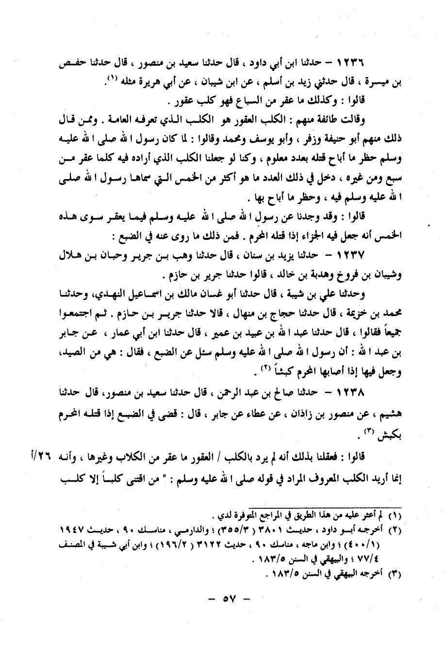 1236 - حَدَّثَنَا ابْنُ أَبِي دَاوُدَ، قَالَ: حَدَّثَنَا سَعِيدُ بْنُ مَنْصُورٍ، قَالَ: حَدَّثَنَا حَفْصُ بْنُ مَيْسَرَةَ، قَالَ: حَدَّثَنِي زَيْدُ بْنُ أَسْلَمَ، عَنِ ابْنِ شَيْبَانَ، عَنْ أَبِي هُرَيْرَةَ، مِثْلَهُ قَالُوا: وَكَذَلِكَ مَا عَقَرَ مِنَ السِّبَاعِ فَهُوَ كَلْبٌ عَقُورٌ وَقَالَتْ طَائِفَةٌ مِنْهُمْ: الْكَلْبُ الْعَقُورُ هُوَ الْكَلْبُ الَّذِي تَعْرِفُهُ الْعَامَّةُ وَمِمَّنْ قَالَ ذَلِكَ مِنْهُمْ أَبُو حَنِيفةَ، وَزُفَرُ، وَأَبُو يُوسُفَ، وَمُحَمَّدٌ، وَقَالُوا: لَمَّا كَانَ رَسُولُ اللهِ صَلَّى اللَّهُ عَلَيْهِ وَسَلَّمَ حَظَرَ مَا أَبَاحَ قَتْلَهُ بِعَدَدٍ مَعْلُومٍ، وَكُنَّا لَوْ جَعَلْنَا الْكَلْبَ الَّذِي أَرَادَهُ فِيهِ كُلَّمَا عَقَرَ، مِنْ سَبْعٍ وَمِنْ غَيْرِهِ، دَخَلَ فِي ذَلِكَ الْعَدَدِ مَا هُوَ أَكْثَرُ مِنَ الْخَمْسِ الَّتِي سَمَّاهَا رَسُولُ اللهِ صَلَّى اللَّهُ عَلَيْهِ وَسَلَّمَ فِيهِ، وَحَظَرَ مَا أَبَاحَ بِهَا قَالُوا: وَقَدْ وَجَدْنَا عَنْ رَسُولِ اللهِ صَلَّى اللَّهُ عَلَيْهِ وَسَلَّمَ فِيمَا يَعْقِرُ سِوَى هَذِهِ الْخَمْسِ، أَنَّهُ جَعَلَ فِيهِ الْجَزَاءَ إِذَا قَتَلَهُ الْمُحْرِمُ فَمِنْ ذَلِكَ مَا رُوِيَ عَنْهُ فِي الضَّبْعِ: