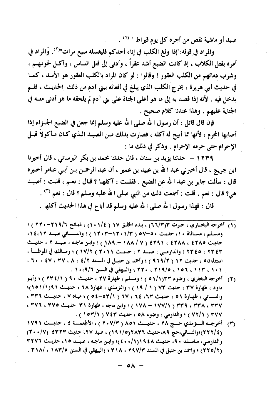 صَيْدٍ أَوْ مَاشِيَةٍ نُقِصَ مِنْ أَجْرِهِ كُلَّ يَوْمٍ قِيرَاطٌ "، وَالْمُرَادُ فِي قَوْلِهِ: " إِذَا وَلَغَ الْكَلْبُ فِي إِنَاءِ أَحَدِكُمْ فَلْيَغْسِلْهُ سَبْعَ مَرَّاتٍ "، وَالْمُرَادُ فِي أَمْرِهِ بِقَتْلِ الْكِلَابِ، إِذْ كَانَتِ الضَّبْعُ أَشَدَّ عَقْرًا، وَأَدْنَى إِلَى قَتْلِ النَّاسِ، وَأَكْلِ لُحُومِهِمْ، وَشُرْبِ دِمَائِهِمْ مِنَ الْكَلْبِ الْعَقُورِ وَقَالُوا: لَوْ كَانَ الْمُرَادُ بِالْكَلْبِ الْعَقُورِ
