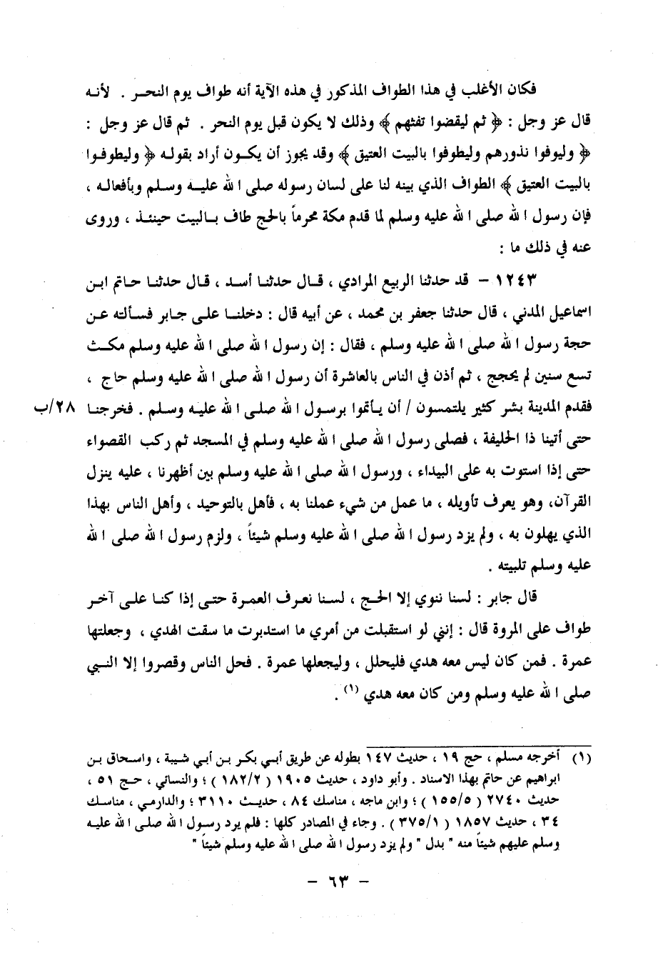1243 - قَدْ حَدَّثَنَا الرَّبِيعُ الْمُرَادِيُّ، قَالَ: حَدَّثَنَا أَسَدٌ، قَالَ: حَدَّثَنَا حَاتِمُ بْنُ إِسْمَاعِيلَ الْمَدَنِيُّ، قَالَ: حَدَّثَنَا جَعْفَرُ بْنُ مُحَمَّدٍ، عَنْ أَبِيهِ، قَالَ: دَخَلْنَا عَلَى جَابِرٍ، فَسَأَلْتُهُ عَنْ حَجَّةِ رَسُولِ اللهِ صَلَّى اللَّهُ عَلَيْهِ وَسَلَّمَ، فَقَالَ: إِنَّ رَسُولَ اللهِ صَلَّى اللَّهُ عَلَيْهِ وَسَلَّمَ مَكَثَ تِسْعَ سِنِينَ لَمْ يَحْجُجْ، ثُمَّ أُذِّنَ فِي النَّاسِ بِالْعَاشِرَةِ أَنَّ رَسُولَ اللهِ صَلَّى الله عَلَيْهِ وَسَلَمَ حَاجٌّ، فَقَدِمَ الْمَدِينَةَ بَشَرٌ كَثِيرٌ يَلْتَمِسُونَ أَنْ يَأْتَمُّوا بِرَسُولِ اللهِ صَلَّى اللَّهُ عَلَيْهِ وَسَلَّمَ، فَخَرَجْنَا حَتَّى أَتَيْنَا ذَا الْحُلَيْفَةِ، فَصَلَّى رَسُولُ اللهِ صَلَّى اللَّهُ عَلَيْهِ وَسَلَّمَ فِي الْمَسْجِدِ، ثُمَّ رَكِبَ الْقَصْوَاءَ حَتَّى إِذَا اسْتَوَتْ بِهِ عَلَى الْبَيْدَاءِ، وَرَسُولُ اللهِ صَلَّى اللَّهُ عَلَيْهِ وَسَلَّمَ بَيْنَ أَظْهُرِنَا، عَلَيْهِ يَنْزِلُ الْقُرْآنُ، وَهُوَ يَعْرِفُ تَأْوِيلَهُ، مَا عَمِلَ مِنْ شَيْءٍ عَمِلْنَا بِهِ، فَأَهَلَّ بِالتَّوْحِيدِ، وَأَهَلَّ النَّاسُ بِهَذَا الَّذِي يَهِلُّونَ بِهِ، وَلَمْ يَزِدْ رَسُولُ اللهِ صَلَّى اللَّهُ عَلَيْهِ وَسَلَّمَ شَيْئًا، وَلَزِمَ رَسُولُ اللهِ صَلَّى اللَّهُ عَلَيْهِ وَسَلَّمَ تَلْبِيَتَهُ قَالَ جَابِرٌ: لَسْنَا نَنْوِي إِلَّا الْحَجَّ، لَسْنَا نَعْرِفُ الْعُمْرَةَ حَتَّى إِذَا كُنَّا عَلَى آخِرِ طَوَافٍ عَلَى الْمَرْوَةِ، قَالَ: " إِنَّنِي لَوِ اسْتَقْبَلْتُ مِنْ أَمْرِي مَا اسْتَدْبَرْتُ مَا سُقْتُ الْهَدْيَ، وَجَعَلْتُهَا عُمْرَةً، فَمَنْ كَانَ لَيْسَ مَعَهُ هَدْيٌ فَلْيَحْلِلْ، وَلْيَجْعَلْهَا عُمْرَةً "، فَحَلَّ النَّاسُ وَقَصَّرُوا إِلَّا النَّبِيُّ صَلَّى اللَّهُ عَلَيْهِ وَسَلَّمَ وَمَنْ كَانَ مَعَهُ هَدْيٌ