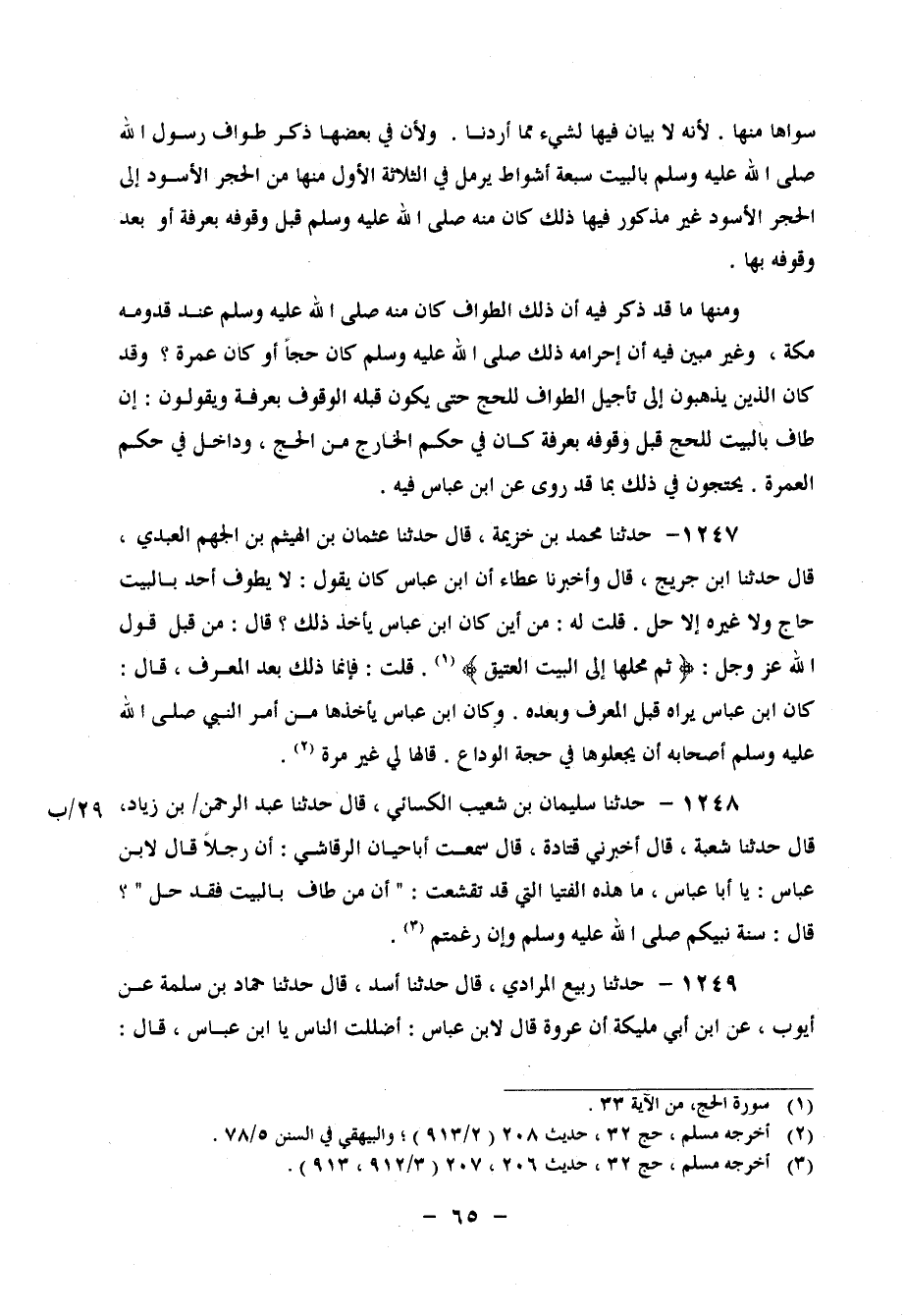 1248 - حَدَّثَنَا سُلَيْمَانُ بْنُ شُعَيْبٍ الْكِسَائِيُّ، قَالَ: حَدَّثَنَا عَبْدُ الرَّحْمَنِ بْنُ زِيَادٍ، قَالَ: حَدَّثَنَا شُعْبَةُ، قَالَ: أَخْبَرَنِي قَتَادَةُ، قَالَ: سَمِعْتُ أَبَا حَيَّانَ الرَّقَاشِيَّ، أَنَّ رَجُلًا قَالَ لِابْنِ عَبَّاسٍ: يَا أَبَا عَبَّاسٍ " مَا هَذِهِ الْفُتْيَا الَّتِي قَدْ تَقَشَّعْتَ، أَنَّ مَنْ طَافَ بِالْبَيْتِ فَقَدْ حَلَّ؟ قَالَ: سُنَّةُ نَبِيِّكُمْ صَلَّى اللَّهُ عَلَيْهِ وَسَلَّمَ وَإِنْ رَغِمْتُمْ "