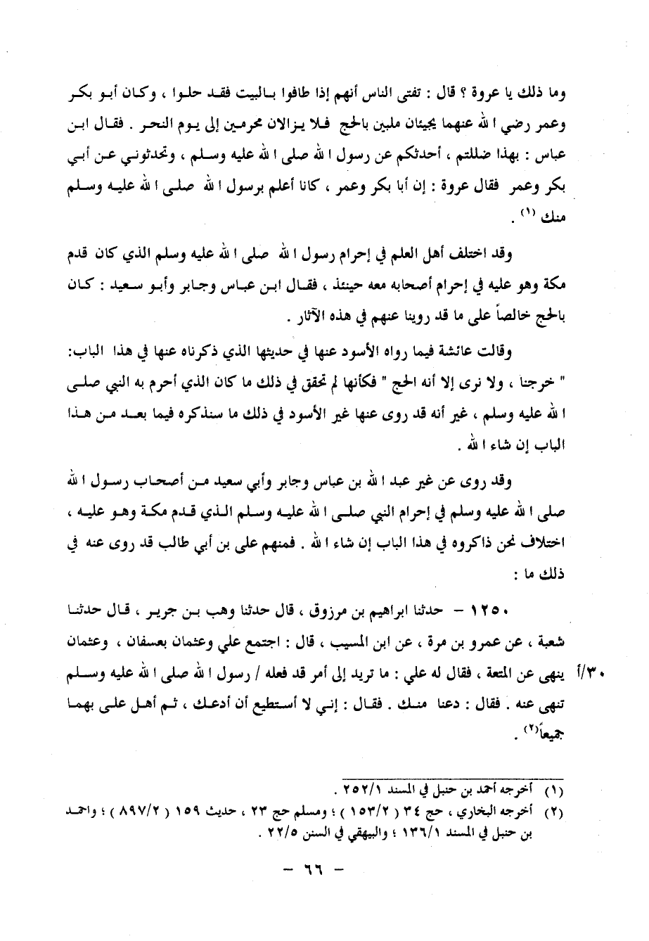 وَمَا ذَلِكَ يَا عُرْوَةُ؟ " قَالَ: تُفْتِي النَّاسَ أَنَّهُمْ إِذَا طَافُوا بِالْبَيْتِ فَقَدْ حَلُّوا، وَكَانَ أَبُو بَكْرٍ وَعُمَرُ رَضِيَ اللهُ عَنْهُمَا يَجِيئَانِ مُلَبِّيَيْنِ بِالْحَجِّ، فَلَا يَزَالَانِ مُحْرِمَيْنِ إِلَى يَوْمِ النَّحْرِ؟ فَقَالَ ابْنُ عَبَّاسٍ: " بِهَذَا ضَلَلْتُمْ، أُحَدِّثُكُمْ عَنْ رَسُولِ اللهِ صَلَّى اللَّهُ عَلَيْهِ وَسَلَّمَ، وَتُحَدِّثُونِي عَنْ أَبِي بَكْرٍ وَعُمَرَ؟ "، فَقَالَ عُرْوَةُ: إِنَّ أَبَا بَكْرٍ وَعُمَرَ، كَانَا أَعْلَمَ بِرَسُولِ اللهِ صَلَّى اللَّهُ عَلَيْهِ وَسَلَّمَ مِنْكَ وَقَدِ اخْتَلَفَ أَهْلُ الْعِلْمِ فِي إِحْرَامِ رَسُولِ اللهِ صَلَّى اللَّهُ عَلَيْهِ وَسَلَّمَ الَّذِي كَانَ قَدِمَ مَكَّةَ وَهُوَ عَلَيْهِ فِي إِحْرَامِ أَصْحَابِهِ مَعَهُ حِينَئِذٍ، فَقَالَ ابْنُ عَبَّاسٍ، وَجَابِرٌ، وَأَبُو سَعِيدٍ: كَانَ بِالْحَجِّ خَالِصًا، عَلَى مَا قَدْ رُوِّينَا عَنْهُمْ فِي هَذِهِ الْآثَارِ وَقَالَتْ عَائِشَةُ، فِيمَا رَوَاهُ الْأَسْوَدُ عَنْهَا فِي حَدِيثِهَا الَّذِي ذَكَرْنَاهُ عَنْهَا فِي هَذَا الْبَابِ " خَرَجْنَا، وَلَا نَرَى إِلَّا أَنَّهُ الْحَجُّ "، فَكَأَنَّهَا لَمْ تُحَقِّقْ فِي ذَلِكَ مَا كَانَ الَّذِي أَحْرَمَ بِهِ النَّبِيُّ صَلَّى اللَّهُ عَلَيْهِ وَسَلَّمَ، غَيْرَ أَنَّهُ قَدْ رَوَى عَنْهَا غَيْرُ الْأَسْوَدِ فِي ذَلِكَ مَا سَنَذْكُرُهُ فِيمَا بَعْدُ مِنْ هَذَا الْبَابِ إِنْ شَاءَ اللهُ وَقَدْ رُوِيَ عَنْ غَيْرِ عَبْدِ اللهِ بْنِ عَبَّاسٍ، وَجَابِرٍ، وَأَبِي سَعِيدٍ مِنْ أَصْحَابِ رَسُولِ اللهِ صَلَّى اللَّهُ عَلَيْهِ وَسَلَّمَ فِي إِحْرَامِ النَّبِيِّ صَلَّى اللَّهُ عَلَيْهِ وَسَلَّمَ الَّذِي