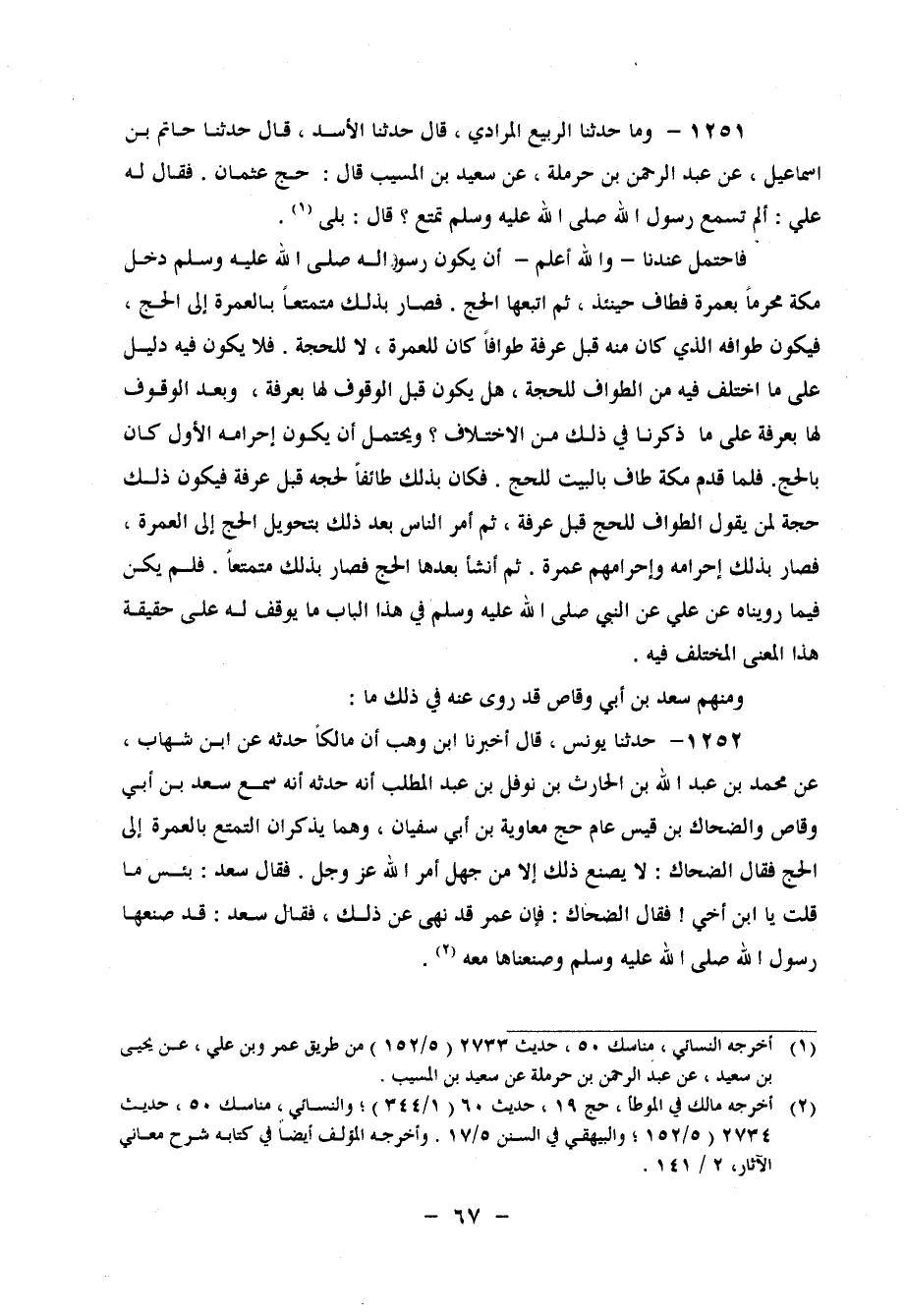 1251 - وَمَا حَدَّثَنَا الرَّبِيعُ الْمُرَادِيُّ، قَالَ: حَدَّثَنَا الْأَسَدُ، قَالَ: حَدَّثَنَا حَاتِمُ بْنُ إِسْمَاعِيلَ، عَنْ عَبْدِ الرَّحْمَنِ بْنِ حَرْمَلَةَ، عَنْ سَعِيدِ بْنِ الْمُسَيِّبِ، قَالَ: " حَجَّ عُثْمَانُ، فَقَالَ لَهُ عَلِيٌّ: أَلَمْ تَسْمَعْ رَسُولَ اللهِ صَلَّى اللَّهُ عَلَيْهِ وَسَلَّمَ تَمَتَّعَ؟ قَالَ: بَلَى " فَاحْتَمَلَ عِنْدَنَا، وَاللهُ أَعْلَمُ، أَنْ يَكُونَ رَسُولُ اللهِ صَلَّى اللَّهُ عَلَيْهِ وَسَلَّمَ دَخَلَ مَكَّةَ مُحْرِمًا بِعُمْرَةٍ، فَطَافَ حِينَئِذٍ، ثُمَّ أَتْبَعَهَا الْحَجَّ، فَصَارَ بِذَلِكَ مُتَمَتِّعًا بِالْعُمْرَةِ إِلَى الْحَجِّ، فَيَكُونُ طَوَافُهُ الَّذِي كَانَ مِنْهُ قَبْلَ عَرَفَةَ طَوَافًا كَانَ لِلْعُمْرَةِ، لَا لِلْحَجَّةِ، فَلَا يَكُونُ فِيهِ دَلِيلٌ عَلَى مَا اخْتُلِفَ فِيهِ مِنَ الطَّوَافِ لِلْحَجَّةِ، هَلْ يَكُونُ قَبْلَ الْوُقُوفِ لَهَا بِعَرَفَةَ، وَبَعْدَ الْوُقُوفِ لَهَا بِعَرَفَةَ، عَلَى مَا ذَكَرْنَا فِي ذَلِكَ مِنَ الِاخْتِلَافِ وَيُحْتَمَلُ أَنْ يَكُونَ إِحْرَامُهُ الْأَوَّلُ كَانَ بِالْحَجِّ، فَلَمَّا قَدِمَ مَكَّةَ طَافَ بِالْبَيْتِ لِلْحَجِّ، فَكَانَ