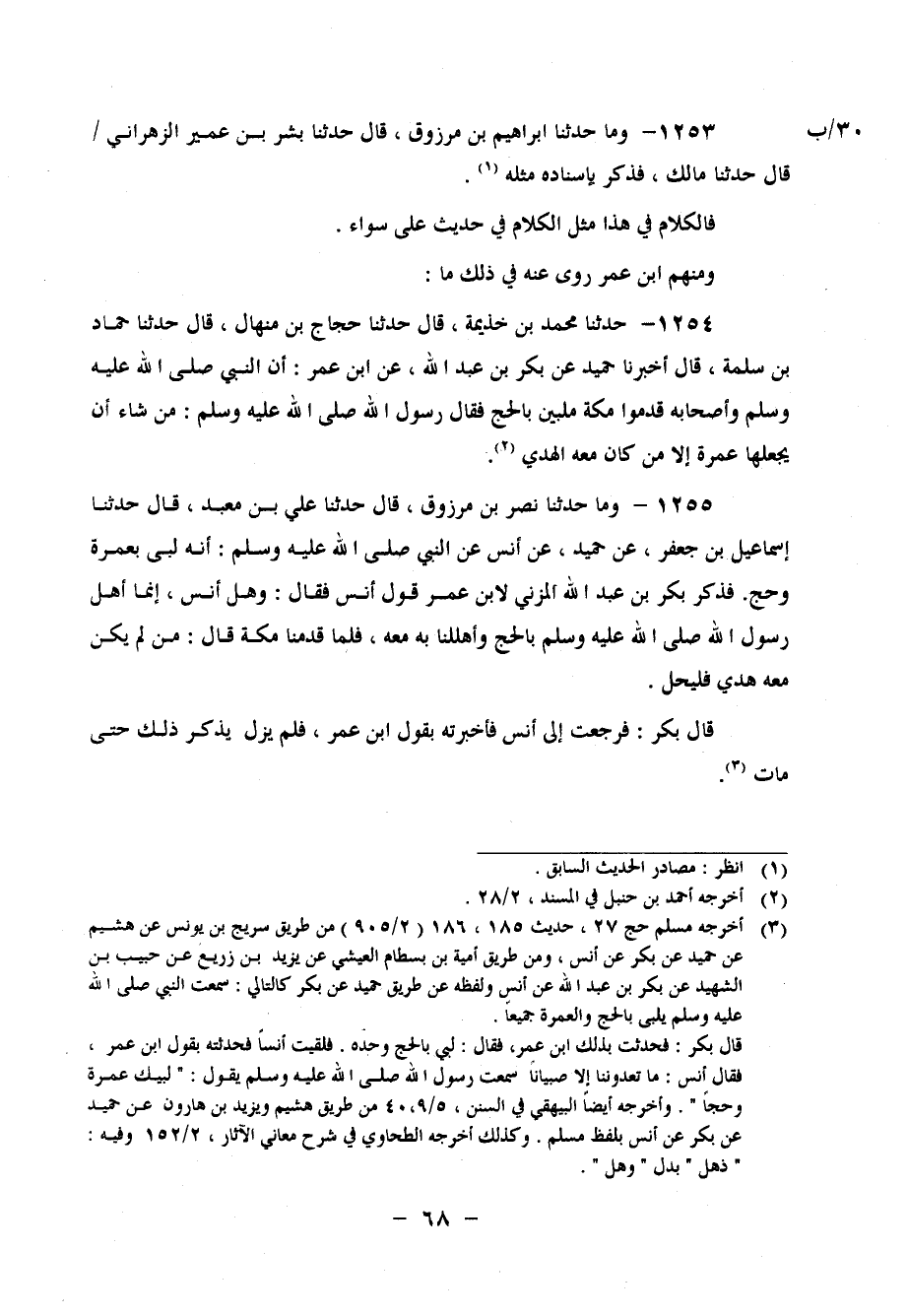 1255 - وَمَا حَدَّثَنَا نَصْرُ بْنُ مَرْزُوقٍ، قَالَ: حَدَّثَنَا عَلِيُّ بْنُ مَعْبَدٍ، قَالَ: حَدَّثَنَا إِسْمَاعِيلُ بْنُ جَعْفَرٍ، عَنْ حُمَيْدٍ، عَنْ أَنَسٍ، عَنِ النَّبِيِّ صَلَّى اللَّهُ عَلَيْهِ وَسَلَّمَ، " أَنَّهُ لَبَّى بِعُمْرَةٍ وَحَجٍّ " فَذَكَرَ بَكْرُ بْنُ عَبْدِ اللهِ الْمُزَنِيُّ لِابْنِ عُمَرَ قَوْلَ أَنَسٍ، فَقَالَ: وَهَلَّ أَنَسٌ إِنَّمَا أَهَلَّ رَسُولُ اللهِ صَلَّى اللَّهُ عَلَيْهِ وَسَلَّمَ بِالْحَجِّ وَأَهْلَلْنَا بِهِ مَعَهُ، فَلَمَّا قَدِمْنَا مَكَّةَ، قَالَ: " مَنْ لَمْ يَكُنْ مَعَهُ هَدْيٌ فَلْيَحِلَّ " قَالَ بَكْرٌ: فَرَجِعْتُ إِلَى أَنَسٍ، فَأَخْبَرْتُهُ بِقَوْلِ ابْنِ عُمَرَ، فَلَمْ يَزَلْ يَذْكُرُ ذَلِكَ حَتَّى مَاتَ