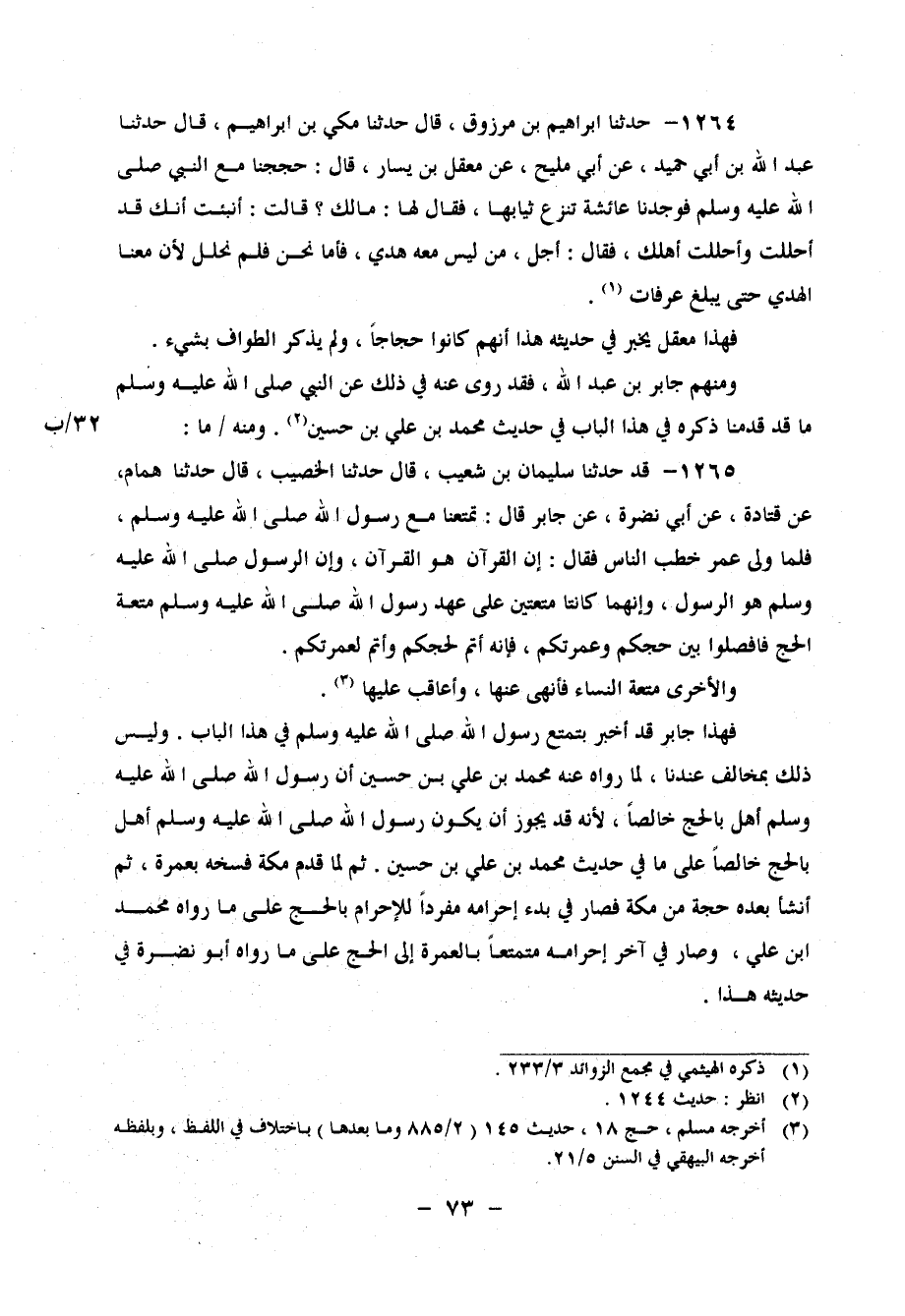 1265 - قَدْ حَدَّثَنَا سُلَيْمَانُ بْنُ شُعَيْبٍ، قَالَ: حَدَّثَنَا الْخَصِيبُ، قَالَ: حَدَّثَنَا هَمَّامٌ، عَنْ قَتَادَةَ، عَنْ أَبِي نَضْرَةَ، عَنْ جَابِرٍ، قَالَ: " تَمَتَّعْنَا مَعَ رَسُولِ اللهِ صَلَّى اللَّهُ عَلَيْهِ وَسَلَّمَ، فَلَمَّا وُلِّيَ عُمَرُ خَطَبَ النَّاسَ، فَقَالَ: " إِنَّ الْقُرْآنَ هُوَ الْقُرْآنُ، وَإِنَّ الرَّسُولَ صَلَّى اللَّهُ عَلَيْهِ وَسَلَّمَ هُوَ الرَّسُولُ، وَإِنَّهُمَا كَانَتَا مُتْعَتَيْنِ عَلَى عَهْدِ رَسُولِ اللهِ صَلَّى اللَّهُ عَلَيْهِ وَسَلَّمَ: مُتْعَةُ الْحَجِّ، فَافْصِلُوا بَيْنَ حَجِّكُمْ وَعُمْرَتِكُمْ، فَإِنَّهُ أَتَمُّ لِحَجِّكُمْ وَأَتَمُّ لِعُمْرَتِكُمْ وَالْأُخْرَى مُتْعَةُ النِّسَاءِ، فَأَنْهِي عَنْهَا، وَأُعَاقِبُ عَلَيْهَا " فَهَذَا جَابِرٌ قَدْ أَخْبَرَ بِتَمَتُّعِ رَسُولِ اللهِ صَلَّى اللَّهُ عَلَيْهِ وَسَلَّمَ فِي هَذَا الْبَابِ وَلَيْسَ ذَلِكَ بِمُخَالِفٍ عِنْدَنَا لِمَا رَوَاهُ عَنْهُ مُحَمَّدُ بْنُ عَلِيِّ بْنِ حُسَيْنٍ، أَنَّ رَسُولَ اللهِ صَلَّى اللَّهُ عَلَيْهِ وَسَلَّمَ أَهَلَّ بِالْحَجِّ خَالِصًا، لِأَنَّهُ قَدْ يَجُوزُ أَنْ يَكُونَ رَسُولُ اللهِ صَلَّى اللَّهُ عَلَيْهِ وَسَلَّمَ أَهَلَّ بِالْحَجِّ خَالِصًا عَلَى مَا فِي حَدِيثِ مُحَمَّدِ بْنِ عَلِيِّ بْنِ حُسَيْنٍ، ثُمَّ لَمَّا قَدِمَ مَكَّةَ فَسَخَهُ بِعُمْرَةٍ، ثُمَّ أَنْشَأَ بَعْدَهُ حَجَّةً مِنْ مَكَّةَ، فَصَارَ فِي بَدْءِ إِحْرَامِهِ مُفْرِدًا لِلْإِحْرَامِ بِالْحَجِّ عَلَى مَا رَوَاهُ مُحَمَّدُ بْنُ عَلِيٍّ، وَصَارَ فِي آخِرِ إِحْرَامِهِ مُتَمَتِّعًا بِالْعُمْرَةِ إِلَى الْحَجِّ عَلَى مَا رَوَاهُ أَبُو نَضْرَةَ فِي حَدِيثِهِ هَذَا