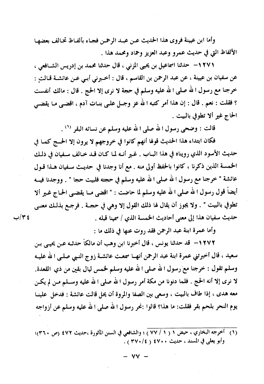 1271 - حَدَّثَنَا إِسْمَاعِيلُ بْنُ يَحْيَى الْمُزَنِيُّ، قَالَ: حَدَّثَنَا مُحَمَّدُ بْنُ إِدْرِيسَ الشَّافِعِيُّ، عَنْ سُفْيَانَ بْنِ عُيَيْنَةَ، عَنْ عَبْدِ الرَّحْمَنِ بْنِ الْقَاسِمِ، قَالَ: أَخْبَرَنِي أَبِي، عَنْ عَائِشَةَ، قَالَتْ: " خَرَجْنَا مَعَ رَسُولِ اللهِ صَلَّى اللَّهُ عَلَيْهِ وَسَلَّمَ فِي حَجَّةٍ لَا نَرَى إِلَّا الْحَجَّ، قَالَ: " مَالَكِ؟ أَنَفِسْتِ؟ " فَقُلْتُ: نَعَمْ قَالَ: " إِنَّ هَذَا أَمْرٌ كَتَبَهُ اللهُ عَزَّ وَجَلَّ عَلَى بَنَاتِ آدَمَ، اقْضِي مَا يَقْضِي الْحَاجُّ غَيْرَ أَلَّا تَطُوفِي بِالْبَيْتِ " قَالَتْ: وَضَحَّى رَسُولُ اللهِ صَلَّى اللَّهُ عَلَيْهِ وَسَلَّمَ عَنْ نِسَائِهِ الْبَقَرَ فَكَانَ ابْتِدَاءُ هَذَا الْحَدِيثِ قَوْلَهَا: أَنَّهُمْ كَانُوا فِي خُرُوجِهِمْ لَا يَرَوْنَ إِلَّا الْحَجَّ، كَمَا فِي حَدِيثِ الْأَسْوَدِ الَّذِي رُوِّينَاهُ فِي هَذَا الْبَابِ، غَيْرَ أَنَّهُ لَمَّا كَانَ قَدْ خَالَفَ سُفْيَانُ فِي ذَلِكَ الْخَمْسَةَ الَّذِينَ ذَكَرْنَا، كَانُوا بِالْحِفْظِ أَوْلَى مِنْهُ، مَعَ أَنَّا وَجَدْنَا فِي حَدِيثِ سُفْيَانَ هَذَا قَوْلَ عَائِشَةَ: " خَرَجْنَا مَعَ رَسُولِ اللهِ صَلَّى اللهِ عَلَيْهِ وَسَلَّمَ فِي حَجَّتِهِ فَلَبَّيْتُ حَجًّا "، وَوَجَدْنَا فِيهِ أَيْضًا قَوْلَ رَسُولِ اللهِ صَلَّى اللَّهُ عَلَيْهِ وَسَلَّمَ لَمَّا حَاضَتْ: " اقْضِي مَا يَقْضِي الْحَاجُّ غَيْرَ أَلَّا تَطُوفِي بِالْبَيْتِ "، وَلَا يَجُوزُ أَنْ يُقَالَ لَهَا ذَلِكَ الْقَوْلُ إِلَّا وَهِيَ فِي حَجَّةٍ، فَرَجَعَ بِذَلِكَ مَعْنَى حَدِيثِ سُفْيَانَ هَذَا إِلَى مَعْنَى أَحَادِيثِ الْخَمْسَةِ الَّذِي سَمَّيْنَا قَبْلَهُ وَأَمَّا عَمْرَةُ بْنَةُ عَبْدِ الرَّحْمَنِ، فَقَدْ رَوَتْ عَنْهَا فِي ذَلِكَ مَا