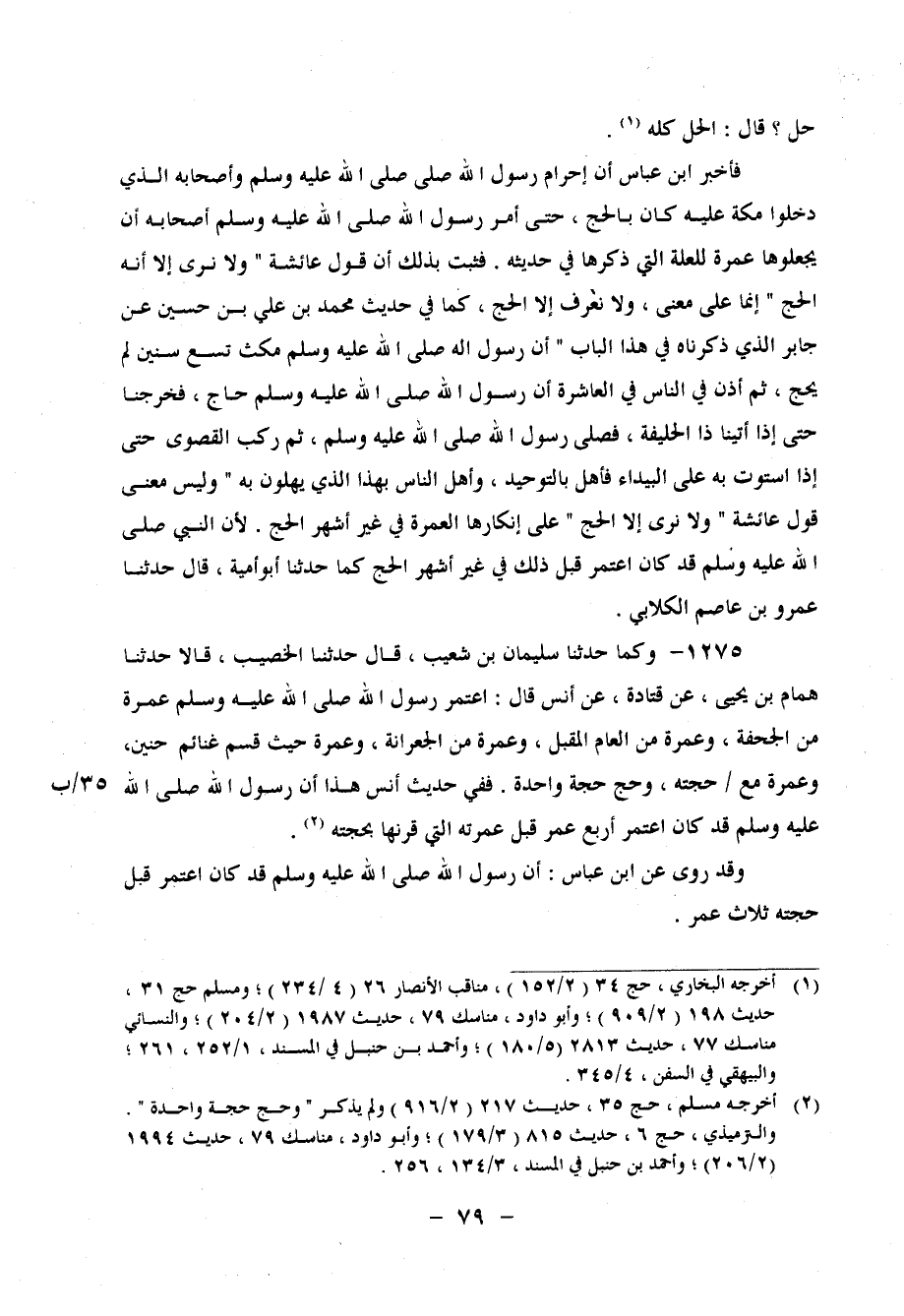 1275 - وَكَمَا حَدَّثَنَا سُلَيْمَانُ بْنُ شُعَيْبٍ، قَالَ: حَدَّثَنَا الْخُصَيْبُ، قَالَا: حَدَّثَنَا هَمَّامُ بْنُ يَحْيَى، عَنْ قَتَادَةَ، عَنْ أَنَسٍ، قَالَ: " اعْتَمَرَ رَسُولُ اللهِ صَلَّى اللَّهُ عَلَيْهِ وَسَلَّمَ عُمْرَةً مِنَ الْجُحْفَةِ، وَعُمْرَةً مِنَ الْعَامِ الْمُقْبِلِ، وَعُمْرَةً مِنَ الْجِعْرَانَةِ، وَعُمْرَةً حَيْثُ قَسَمَ غَنَائِمَ حُنَيْنٍ، وَعُمْرَةً مَعَ حَجَّتِهِ، وَحَجَّ حَجَّةً وَاحِدَةً " فَفِي حَدِيثِ أَنَسٍ هَذَا أَنَّ رَسُولَ اللهِ صَلَّى اللَّهُ عَلَيْهِ وَسَلَّمَ قَدْ كَانَ اعْتَمَرَ أَرْبَعَ عُمَرٍ قَبْلَ عُمْرَتِهِ الَّتِي قَرَنَهَا بِحَجَّتِهِ وَقَدْ رُوِيَ عَنِ ابْنِ عَبَّاسٍ، أَنَّ رَسُولَ اللهِ صَلَّى اللَّهُ عَلَيْهِ وَسَلَّمَ قَدْ كَانَ اعْتَمَرَ قَبْلَ حَجَّتِهِ ثَلَاثَ عُمَر