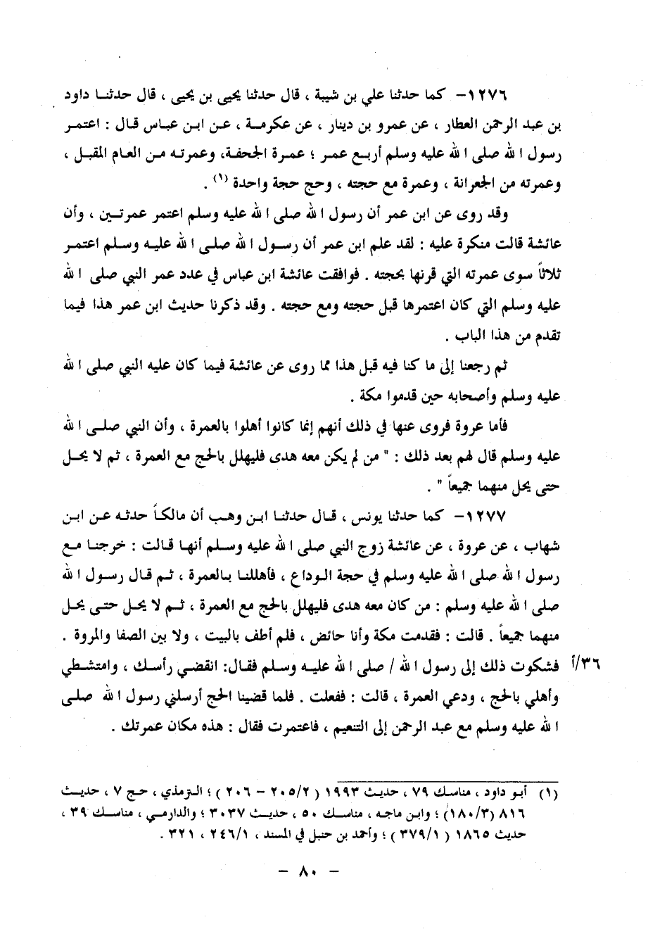 1276 - كَمَا حَدَّثَنَا عَلِيُّ بْنُ شَيْبَةَ، قَالَ: حَدَّثَنَا يَحْيَى بْنُ يَحْيَى، قَالَ: حَدَّثَنَا دَاوُدُ بْنُ عَبْدِ الرَّحْمَنِ الْعَطَّارِ، عَنْ عَمْرِو بْنِ دِينَارٍ، عَنْ عِكْرِمَةَ، عَنِ ابْنِ عَبَّاسٍ، قَالَ: " اعْتَمَرَ رَسُولُ اللهِ صَلَّى اللَّهُ عَلَيْهِ وَسَلَّمَ أَرْبَعَ عُمَرٍ: عُمْرَةُ الْجُحْفَةِ، وَعُمْرَتُهُ مِنَ الْعَامِ الْمُقْبِلِ، وَعُمْرَتُهُ مِنَ الْجِعْرَانَةِ، وَعُمْرَةٌ مَعَ حَجَّتِهِ، وَحَجَّ حَجَّةً وَاحِدَةً " وَقَدْ رُوِيَ عَنِ ابْنِ عُمَرَ، أَنَّ رَسُولَ اللهِ صَلَّى اللَّهُ عَلَيْهِ وَسَلَّمَ اعْتَمَرَ عُمْرَتَيْنِ، وَأَنَّ عَائِشَةَ قَالَتْ مُنْكِرَةً عَلَيْهِ: لَقَدْ عَلِمَ ابْنُ عُمَرَ أَنَّ رَسُولَ اللهِ صَلَّى اللَّهُ عَلَيْهِ وَسَلَّمَ اعْتَمَرَ ثَلَاثًا سِوَى عُمْرَتِهِ الَّتِي قَرَنَهَا بِحَجَّتِهِ فَوَافَقَتْ عَائِشَةُ ابْنَ عَبَّاسٍ فِي عَدَدِ عُمَرِ النَّبِيِّ صَلَّى اللَّهُ عَلَيْهِ وَسَلَّمَ الَّتِي كَانَ اعْتَمَرَهَا قَبْلَ حَجَّتِهِ وَمَعَ حَجَّتِهِ وَقَدْ ذَكَرْنَا حَدِيثَ ابْنِ عُمَرَ هَذَا فِيمَا تَقَدَّمَ مِنْ هَذَا الْبَابِ ثُمَّ رَجَعْنَا إِلَى مَا كُنَّا فِيهِ قَبْلَ هَذَا مِمَّا رُوِيَ عَنْ