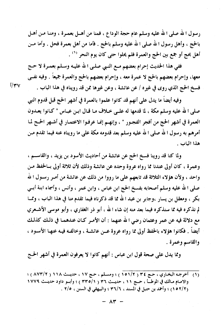 رَسُولِ اللهِ صَلَّى اللَّهُ عَلَيْهِ وَسَلَّمَ عَامَ حَجَّةِ الْوَدَاعِ، فَمِنَّا مَنْ أَهَلَّ بِعُمْرَةٍ، وَمِنَّا مَنْ أَهَلَّ بِالْحَجِّ، وَأَهَلَّ رَسُولُ اللهِ صَلَّى اللَّهُ عَلَيْهِ وَسَلَّمَ بِالْحَجِّ، فَأَمَّا مَنْ أَهَلَّ بِعُمْرَةٍ فَحَلَّ، وَأَمَّا مَنْ أَهَلَّ بِحَجٍّ، أَوْ جَمَعَ بَيْنَ الْحَجِّ وَالْعُمْرَةِ، فَلَمْ يَحِلُّوا حَتَّى كَانَ يَوْمُ النَّحْرِ " فَفِي هَذَا الْحَدِيثِ إِحْرَامُ بَعْضِهِمْ مَعَ النَّبِيِّ صَلَّى اللَّهُ عَلَيْهِ وَسَلَّمَ بِعُمْرَةٍ لَا حَجَّ مَعَهَا، وَإِحْرَامُ بَعْضِهِمْ بِالْحَجِّ لَا عُمْرَةَ مَعَهُ، وَإِحْرَامُ بَعْضِهِمْ بِالْحَجِّ وَالْعُمْرَةِ جَمِيعًا وَفِيهِ نَفْيُ فَسْخِ الْحَجِّ الَّذِي رُوِيَ فِي غَيْرِهِ عَنْ عَائِشَةَ، وَعَنْ غَيْرِهَا مِمَّنْ قَدْ رُوِّينَاهُ فِي هَذَا الْبَابِ وَفِيهِ أَيْضًا مَا يَدُلُّ عَلَى أَنَّهُمْ قَدْ كَانُوا عَلِمُوا بِالْعُمْرَةِ فِي أَشْهُرِ الْحَجِّ قَبْلَ قُدُومِ النَّبِيِّ صَلَّى اللَّهُ عَلَيْهِ وَسَلَّمَ بِمَكَّةَ، لَمَّا قَدِمَهَا لَهُ عَلَى خِلَافِ مَا قَالَ ابْنُ عَبَّاسٍ: كَانُوا يَعُدُّونَ الْعُمْرَةَ فِي أَشْهُرِ الْحَجِّ مِنْ أَفْجَرِ الْفُجُورِ، وَأَنَّهُمْ إِنَّمَا عَرَفُوا الِاعْتِمَارَ فِي أَشْهُرِ الْحَجِّ لَمَّا أَمَرَهُمْ بِهِ رَسُولُ اللهِ صَلَّى اللَّهُ عَلَيْهِ وَسَلَّمَ بَعْدَ قُدُومِهِ مَكَّةَ عَلَى مَا رُوِّينَاهُ عَنْهُ فِيمَا تَقَّدَمَ مِنْ هَذَا الْبَابِ وَلَمَّا كُنَّا قَدْ رُوِّينَا فَسْخَ الْحَجِّ عَنْ عَائِشَةَ مِنْ أَحَادِيثِ الْأَسْوَدِ بْنِ يَزِيدَ، وَالْقَاسِمِ، وَعَمْرَةَ، كَانَ أَوْلَى عِنْدَنَا مِمَّا رَوَاهُ عُرْوَةُ عَنْ عَائِشَةَ، وَذَلِكَ لِأَنَّ ثَلَاثَةً أَوْلَى بِالْحِفْظِ