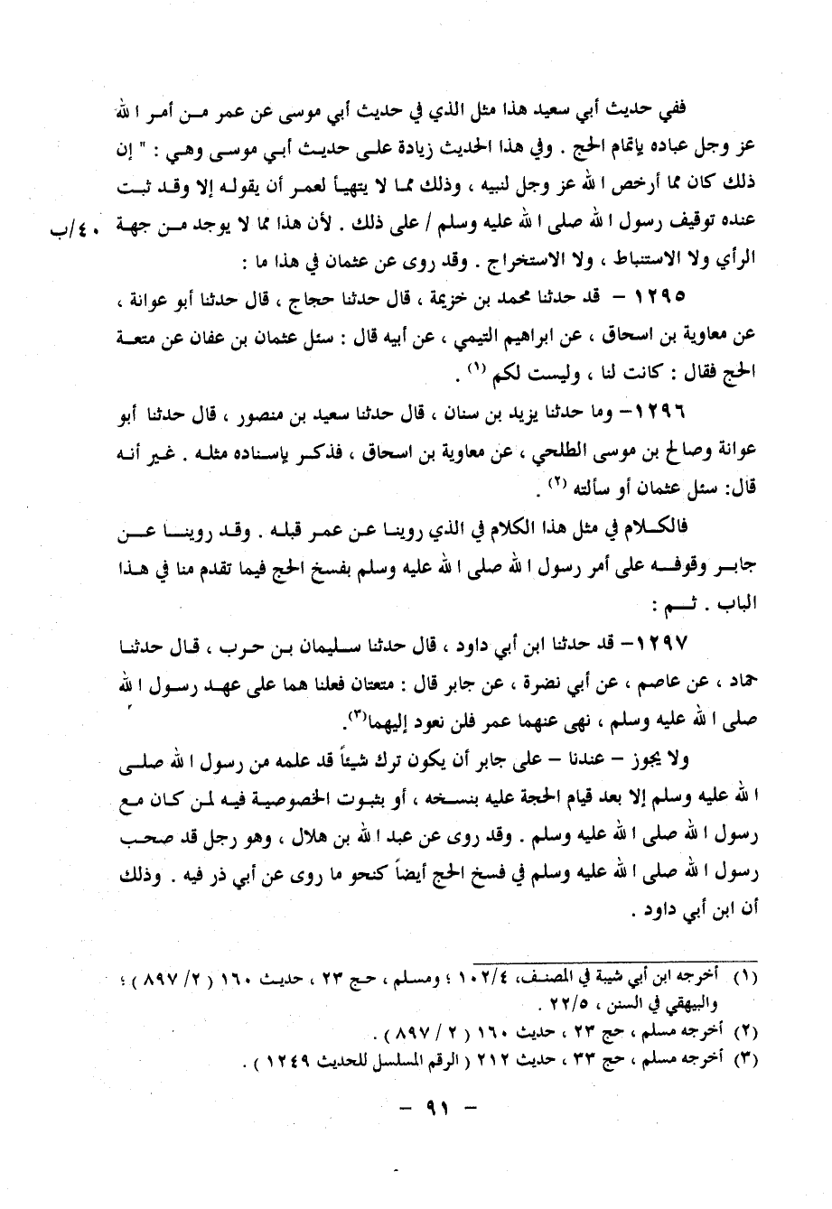 1296 - وَمَا حَدَّثَنَا يَزِيدُ بْنُ سِنَانٍ، قَالَ: حَدَّثَنَا سَعِيدُ بْنُ مَنْصُورٍ، قَالَ: حَدَّثَنَا أَبُو عَوَانَةَ، وَصَالِحُ بْنُ مُوسَى الطَّلْحِيُّ، عَنْ مُعَاوِيَةِ بْنِ إِسْحَاقَ، فَذَكَرَ بِإِسْنَادِهِ مِثْلَهُ، غَيْرَ أَنَّهُ قَالَ: سُئِلَ عُثْمَانُ أَوْ سَأَلْتُهُ فَالْكَلَامُ فِي هَذَا مِثْلُ الْكَلَامِ فِي الَّذِي رُوِّينَا عَنْ عُمَرَ قَبْلَهُ وَقَدْ رُوِّينَا عَنْ جَابِرٍ وُقُوفَهُ عَلَى أَمْرِ رَسُولِ اللهِ صَلَّى اللَّهُ عَلَيْهِ وَسَلَّمَ بِفَسْخِ الْحَجِّ فِيمَا تَقَدَّمَ مِنَّا فِي هَذَا الْبَابِ ثُمَّ: